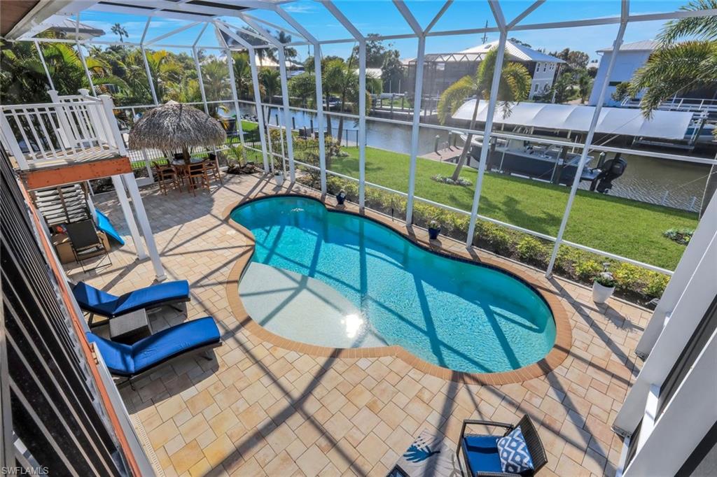 Waterfront living at its finest! This beautifully maintained two-story home offers 3 bedrooms and 2 full baths upstairs, plus two additional lower-level rooms that provide flexible space for guests, office, hobby, or overflow sleeping (non-conforming). Situated on a spacious .31-acre lot with direct Gulf access and no bridges, this property is a boateru2019s dream. Enjoy the ultimate outdoor lifestyle with a saltwater pool, screened lanai, outdoor kitchen, deck, private dock, and charming tiki hut u2014 all overlooking the canal. Whether youu2019re entertaining or relaxing, this backyard delivers. Inside, youu2019ll find laminate and wood flooring, two skylights for abundant natural light, impact-resistant windows, a whole-house water filtration system, and a sprinkler system. The primary suite features a walk-in closet and private bath with shower. Offered furnished, this home is ideal as a full-time residence, vacation retreat, or income-producing rental. Two-car garage completes the package. Donu2019t miss this rare opportunity for direct Gulf access and exceptional outdoor living!