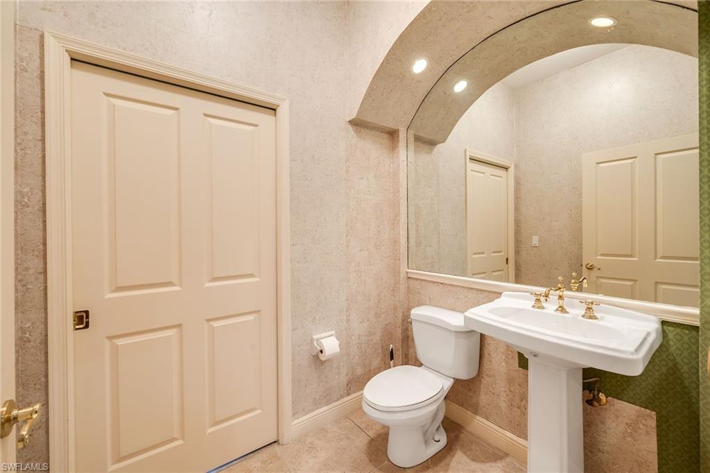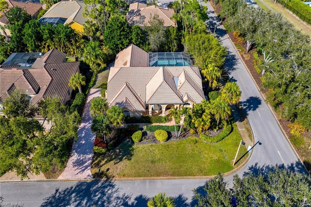 Set within the desirable Longlake enclave of Pelican Landing, this light-filled residence captures private tropical landscape views and effortless Florida living with spacious screened lanai, expansive pool and three-car garage. Designed for entertaining and everyday comfort, the home offers three bedrooms, two-and-a-half baths, and seamless indoor-outdoor flow enhanced by multiple French doors and expansive glass sliders. The covered outdoor living area features dual ceiling fans and overlooks the sparkling pool framed by lush, mature landscaping, creating a serene and secluded setting for relaxed afternoons or evening gatherings. A welcoming French door entry with transom window opens into the foyer and flows directly into the impressive great room, where a stunning chandelier and vaulted ceilings elevate the space. Glass sliders with transom windows invite abundant natural light indoors and connect effortlessly to the lanai. Diagonal tile flooring, white plantation shutters, and plentiful windows throughout create a bright, airy ambiance. The formal dining area is elegantly appointed with a bay window featuring an arched transom, chandelier, decorative wall trim, and a custom mirror for added sophistication. The kitchen blends functionality and style with granite countertops, stainless steel appliances, including a cooktop, wall oven, dishwasher, refrigerator/freezer, and under-counter microwave, along with an island featuring a bar counter for casual seating. A convenient pass-through window to the lanai enhances entertaining, while the adjacent dining area offers recessed lighting and a French door providing direct outdoor access. The family room showcases transom windows, vaulted ceilings and charming built-in shelving with a window bench, creating a cozy yet open retreat. The primary suite is a private sanctuary with glass sliders to the lanai and a spa-inspired bath designed as a tropical retreat overlooking a secluded courtyard through panoramic windows. Two mirrored-door closets provide ample storage, while the bath features dual vanities with a full-width mirror and makeup counter, a large walk-in shower with bench and glass enclosure, and a separate jetted soaking tub. Two guest bedrooms with ceiling fans are near a full bath with dual sinks and a shower-tub combination with glass enclosure, also serving as a convenient pool bath. A generously sized walk-in closet with shelving is off the hallway, and a powder bath adds further convenience for guests. Residents of Pelican Landing enjoy a premier lifestyle with championship golf (membership waitlist), private beach access, nature trails, kayak waterways, and tennis and pickleball. Just minutes from Gulf beaches and the shopping and dining of Mercato and Fifth Avenue South, this home offers exceptional privacy and convenience.