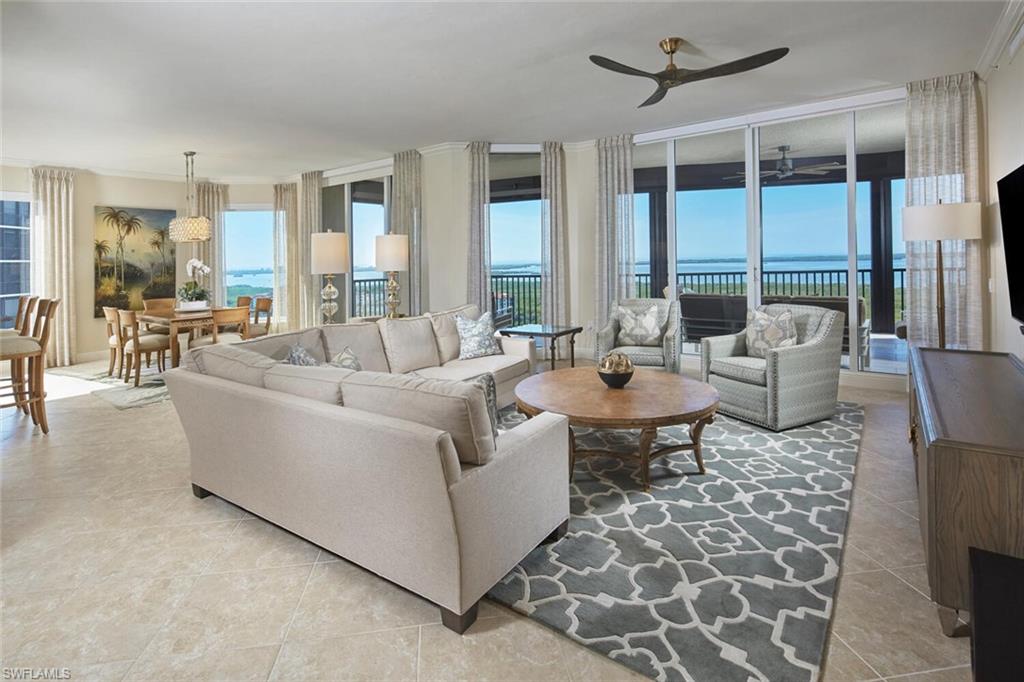 This corner residence in Treviso offers a bright, wraparound perspective of The Colonyu2019s impeccably manicured grounds. From the moment you step off your private elevator, you are greeted by an airy, open-concept design where the indoors and outdoors blur beautifully. Whether you are hosting a formal dinner or enjoying a quiet morning in the charming breakfast nook, the backdrop is always spectacular. Bathed in natural light, the interior is defined by floor-to-ceiling glass and soaring 9u20198u201d ceilings that frame sweeping panoramic views of the Gulf. The meticulously curated floor plan features three ensuite bedrooms, a private study, and a versatile family room, all flowing seamlessly into formal living and dining spaces. Trevisou2019s updated common areas feature transitional furnishings and marble floors with views over water features. Three guest suites, which include a two bedroom apartment. A beautiful secure lobby, elegant social room, billiards room, theater, and a newly updated fitness center complete the interior amenities. Spa and free form large pool with graceful beach access and a separate social pavilion. The Bay Club, a Colony private waterfront dining facility, offers intimate dining or informal sunset dining/entertainment. Experience a full array of community amenities such as a 34 acre island beach park with boat shuttle, Kayaking, canoeing, tennis, pickle ball, bocce and sailing. Close to Coconut Point Shopping Center. 15 minutes to the airport.