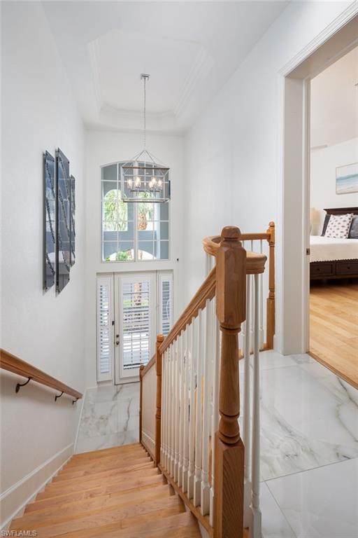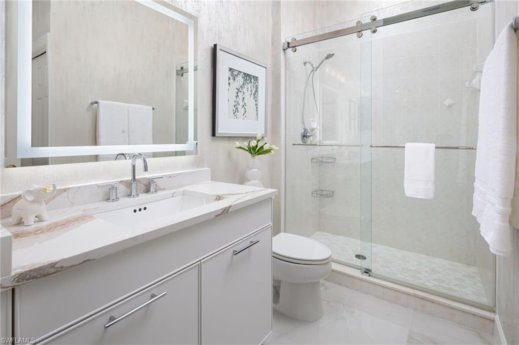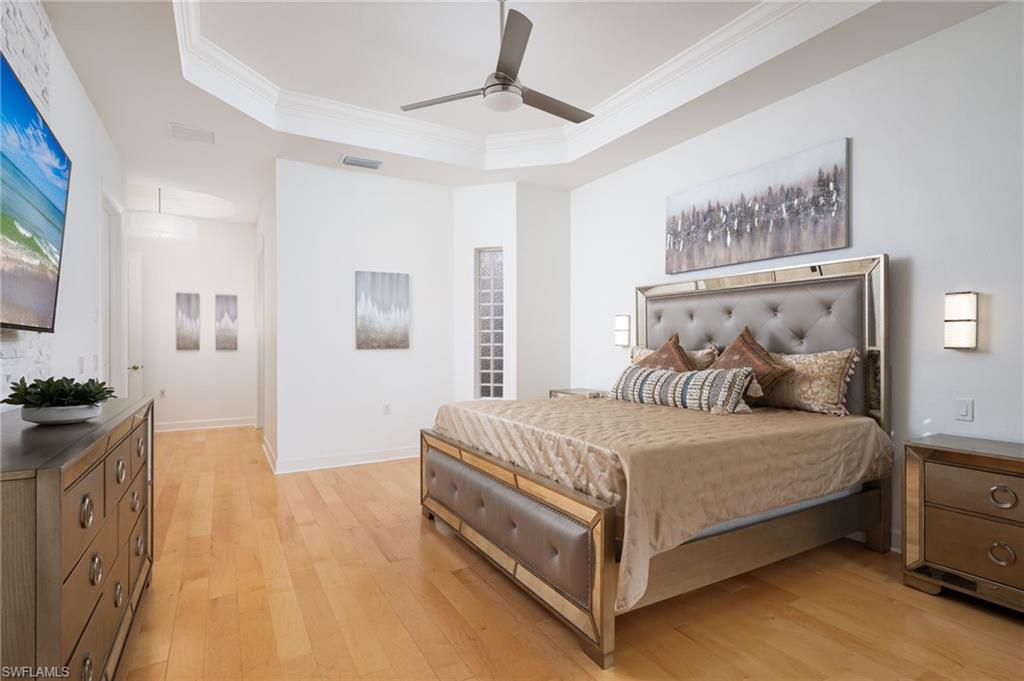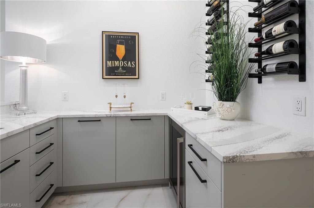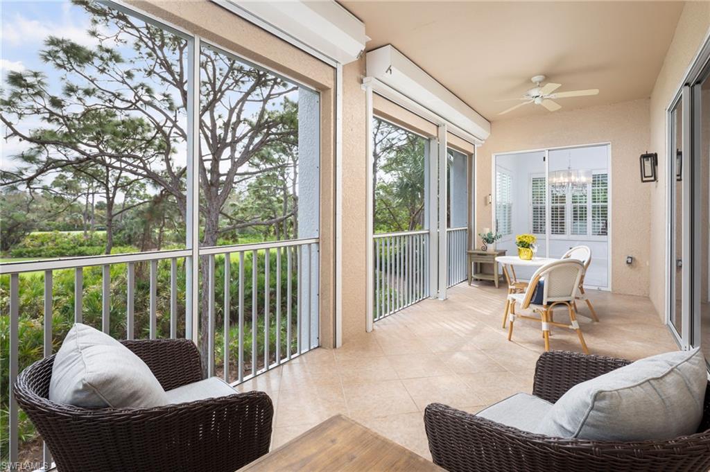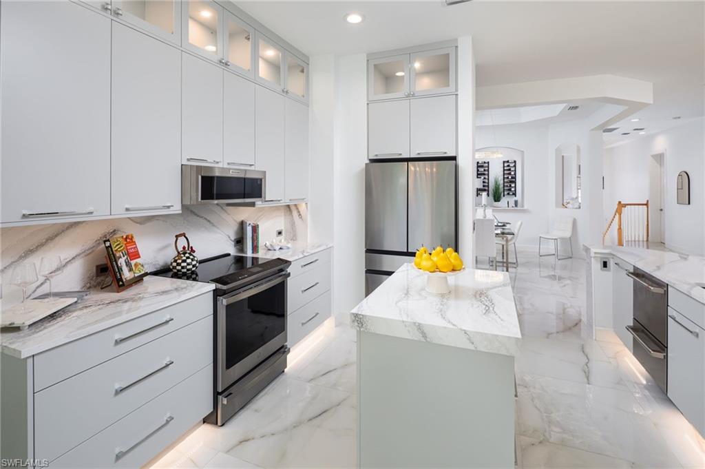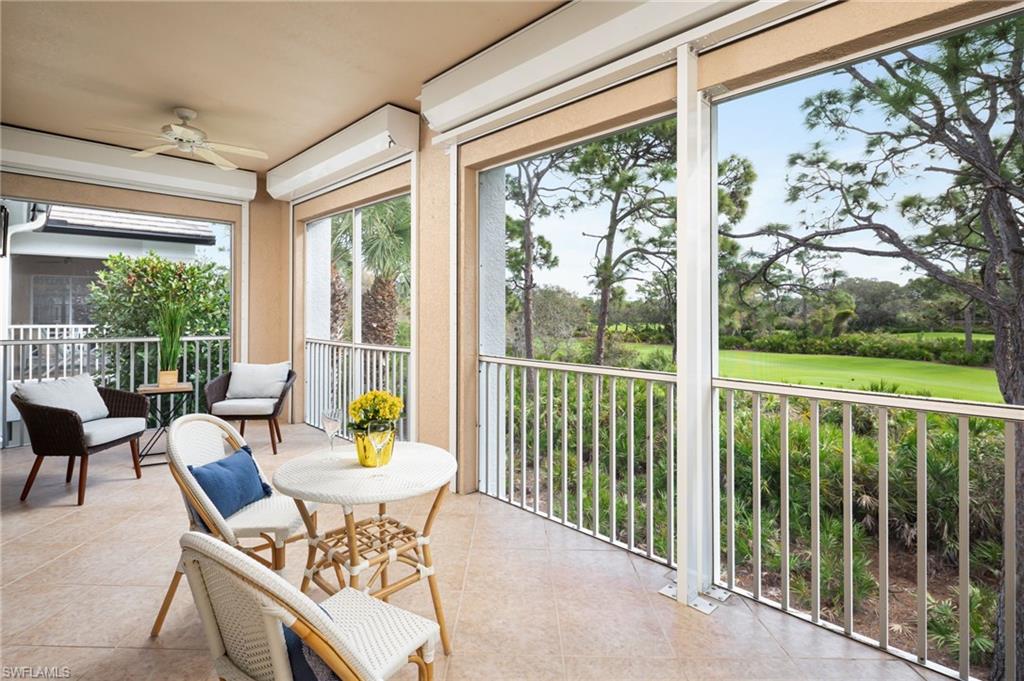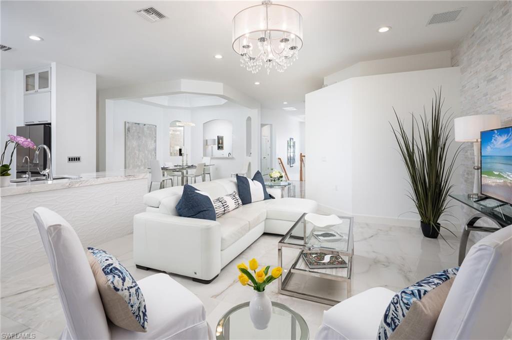 One or more photo(s) has been virtually staged, AI generated or rendered. Welcome to this beautifully remodeled second-floor coach home in Merano at The Colony at Pelican Landing, offering the comfort and privacy of a single-family residence with nearly 2,750 square feet of living space. Completely reimagined with over $450,000 in high-end upgrades (2023u20132025), this residence has been thoughtfully brought up to modern standards with virtually everything renewed for effortless living.Elegant commercial-grade porcelain marble tile flooring flows throughout the main living areas, complementing the expansive floor plan featuring three spacious bedrooms, a light-filled office, a generous den that can serve as a fourth bedroom, a custom bar area, and an oversized two-car garage.The custom gourmet kitchen serves as the centerpiece of the home, featuring premium quartz countertops, a raised and enlarged center island, custom cabinetry with specialty lighting, architectural toe-kick detailing, and a suite of high-end appliances, with plumbing and electrical systems updated to code.The east-facing lanai overlooks the 16th tee box and 17th green of The Colony Golf Course, offering peaceful golf course views and ideal orientation without harsh afternoon sun. Easy-glide sliding doors and automatic storm shutters add both comfort and convenience.Architectural details throughout the home include stacked-stone accent walls, premium chandeliers, custom plantation shutters, and thoughtfully designed living spaces. The primary suite features wood flooring, a custom closet system, and a spa-inspired bath, while the guest bath showcases a hand-painted crystal wall covering by a Naples artist.Additional upgrades include hurricane-impact windows, Trane central A/C, hot water heater (2022), new washing machine, whole-house water filtration, and reverse osmosis drinking system.Merano offers private coach-home living with no shared hallways or interior common spaces, one of the lowest HOA fees within The Colony, and recent community improvements including a new roof (2025), exterior paint (2025), and ongoing landscaping, with no hurricane damage.Ideally located across from the community pool and fitness center, residents enjoy access to the exceptional Pelican Landing and Colony amenities, including the private Bay Club waterfront restaurant, 34-acre private island Beach Club with boat shuttle, tennis and pickleball courts, fitness center, sailing and kayak parks, all just minutes from world-class dining, shopping, and Southwest Florida International Airport.