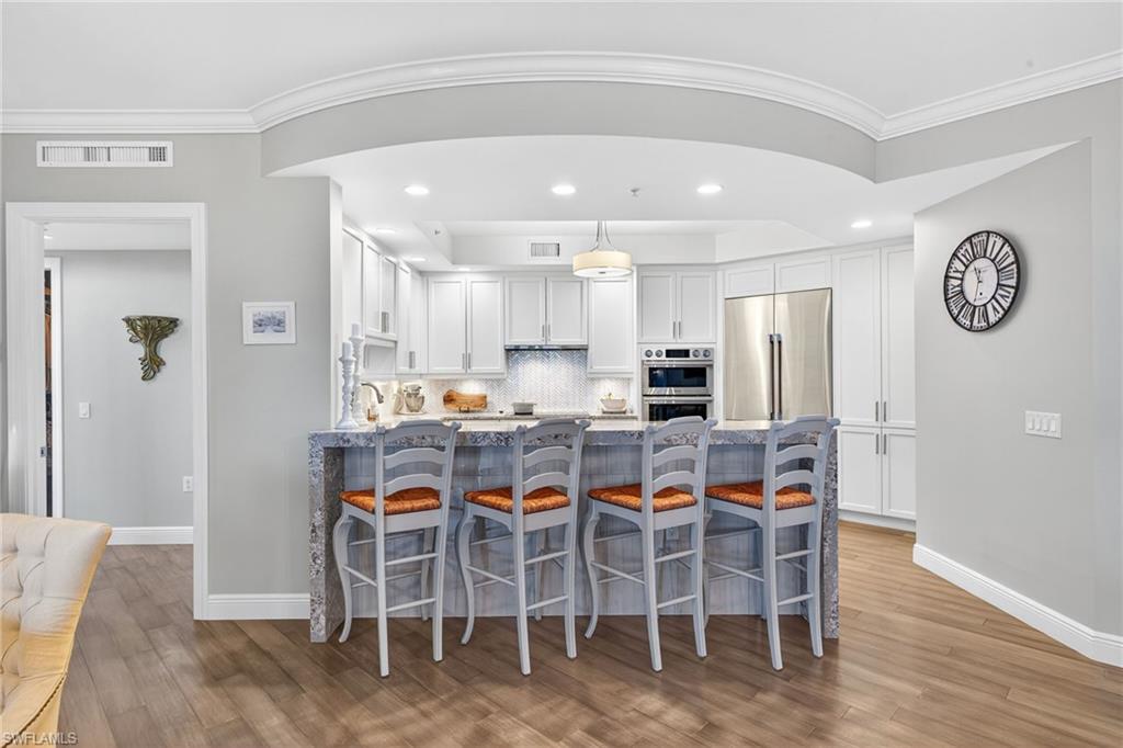 Fantastic Reimagined 11th-Floor Sky Home in Florencia at The Colony Golf & Bay Club!Experience elevated coastal living in this beautifully renovated 3 bedroom, 2.5 bath sky home offering sweeping west, north and southwest-facing views over The Colony Golf Course, Estero Bay, and the Gulf of Mexico. Step off the elevator into your private foyer and immediately feel the differenceu2014new floors throughout main living area, a redesigned kitchen with new appliances including induction cooktop, built-in combination microwave and convection oven, kitchen sink water filter system, and stylish updates in all bathrooms. The open great room and kitchen are perfectly centered between split bedrooms and a flexible den, creating an ideal layout for both everyday living and entertaining. Additional upgrades include electric storm shutters, remote controlled sun shades, 2 new AC units and water heater, front loading washer and dryer, and custom closet in the primary bedroom.Florencia residents enjoy an elegant lobby, resort-style pool and spa, fitness center, social room, updated theater room, and two guest suites for visiting friends and family.Life at The Colony includes dining at the waterfront Bay Club and private beach access to a 34-acre island beach park and pavilion. Optional golf membership is available at The Colony Golf and Country Club.Enjoy an exceptional Southwest Florida lifestyleu2014tennis, pickleball, bocce, canoeing/kayaking, sailing, and moreu2014just minutes from shopping, dining, entertainment, and the SWFL International Airport.