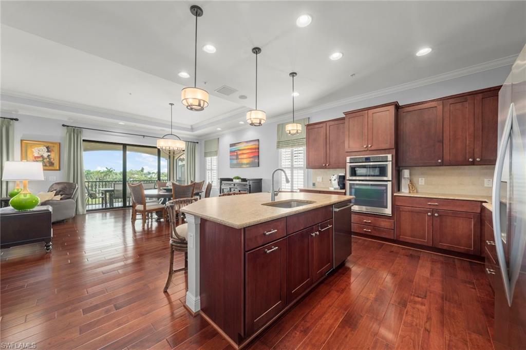 Refined luxury at Terzetto in The Colony at Pelican Landing. Experience elevated living in this rare three-bedroom-plus-den, 2.5-bath residence at Terzetto in The Colony at Pelican Landing, where privacy, sophistication and space blend effortlessly. Encompassing 2,656 square feet of thoughtfully designed interiors, this home lives like a single-family residence, offering a serene retreat just moments from The Bay Club, with added exclusivity of one residence per floor. Arrive in style through your private elevator, opening to a beautifully appointed open-concept floor plan where living, dining and kitchen areas flow seamlessly, ideal for relaxed living and elegant entertaining. A custom wet bar with wine refrigerator elevates every gathering, while luxury upgrades abound such as crown molding, enhanced lighting and electrical features, custom office built-ins and a designer primary closet system. The spacious primary suite and split guest accommodations ensure ultimate comfort and privacy for residents and guests alike. Go onto the expansive main lanai to enjoy tranquil lake views and gentle breezes, whether for morning coffee or sunset cocktails. Designed for peace of mind, the residence features hurricane-rated storm protection, impact-resistant windows and doors, and a private two-car garage finished with epoxy flooring and ample storage space. Residents enjoy access to Terzettou2019s private pool and whirlpool spa. This exquisite residence offers more than a home, it embodies a luxurious, secure and distinctly Southwest Florida way of life. Residents of The Colony enjoy a lifestyle that includes access to a private beach island, canoeing, kayaking, pickleball, bocce and tennis, all included in the monthly fees without additional membership requirements. Optional memberships are also available at The Colony and Pelicanu2019s Nest golf clubs. For dining and social experiences, the Colony Bay Club provides exclusive resident-only access with spectacular views over Estero Bay. Fine restaurants, boutique shopping and entertainment are just minutes away, and Southwest Florida International Airport is a convenient 20-minute drive.
