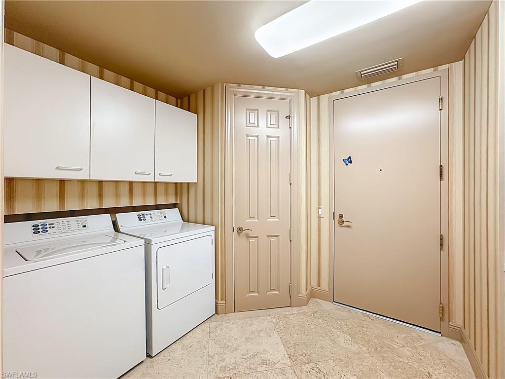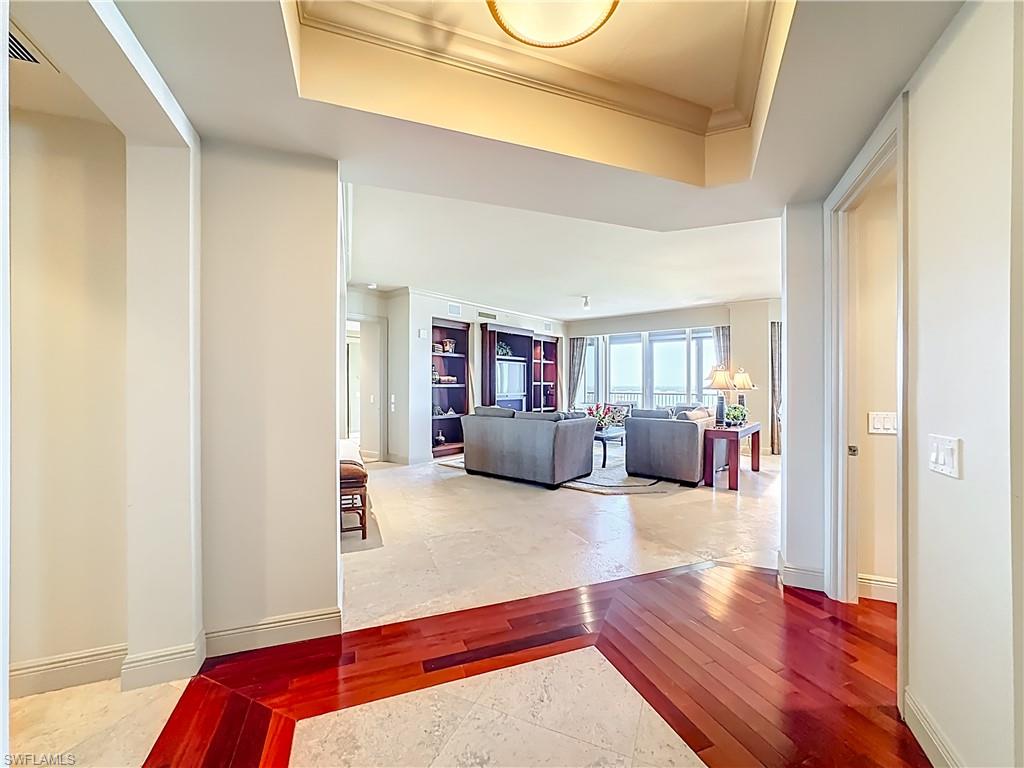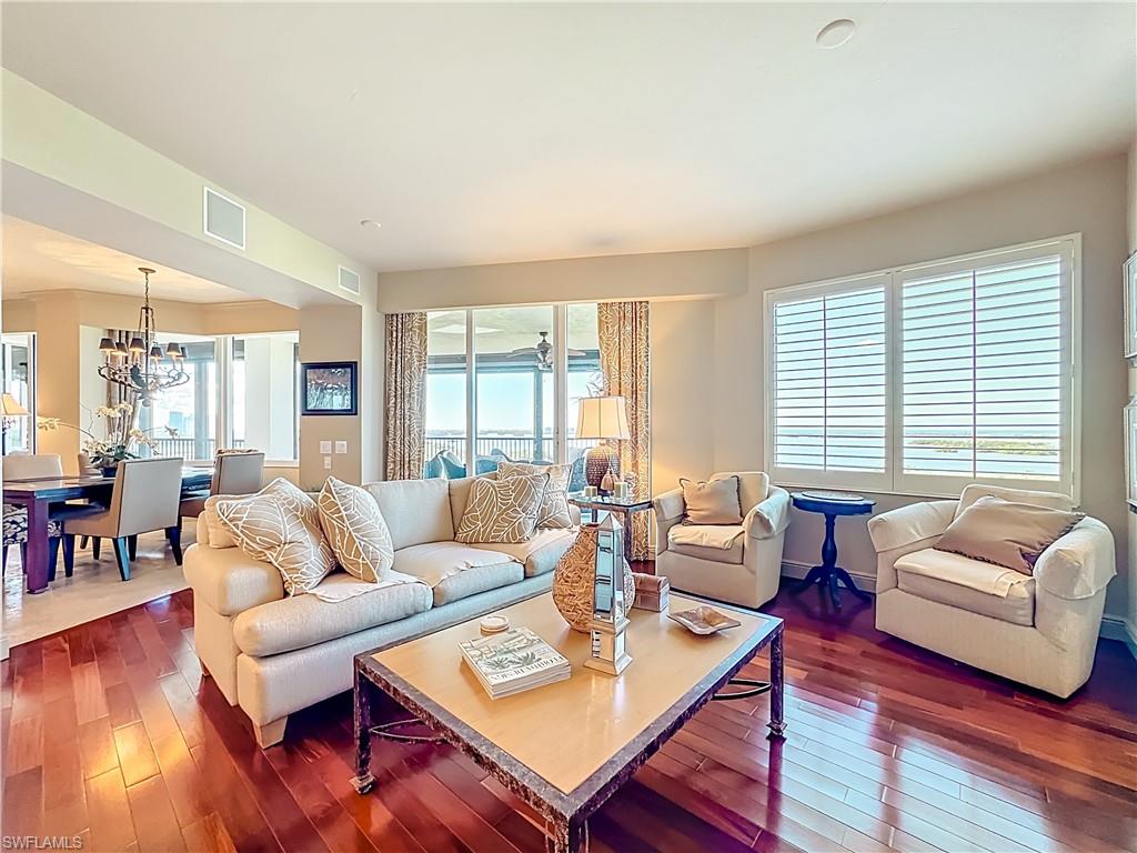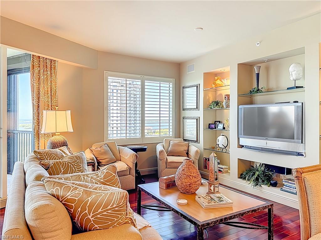 Spectacular panoramic views of the Gulf and Bay await you from this 10th floor professionally designed residence in the highly desirable Palermo at Pelican Colony. The balcony is very spacious and includes electric hurricane shutters. There are beautiful travertine and Brazilian cherry hardwood floors in the main living areas. This unit also includes a rarely available oversized private two-car garage conveniently located directly outside of the garage lobby. Private elevator entry from the unit. Large laundry room with storage cabinets. Great floor plan with 3 bedrooms and 3 full baths. This property is offered as turnkey furnished and is move-in ready! Palermo features a resort-style pool with spa, fitness center, recently renovated social pavilion with full kitchen, two guest suites and a theater. The building is immaculately maintained and recent improvements include a new roof, new exterior paint and remodeled elevator lobbies. Your private membership at Pelican Colony includes access to the Bay Club where you can enjoy both casual and formal waterfront dining on two levels as well as many social events. Another featured amenity is boat shuttle access across the bay to the pristine 34-acre beach park. The community also offers many other activities including a Kayak and canoe park, pickleball, tennis, bocce, a fitness center and so much more. The Colony Golf Club also has optional golf and sports memberships available. Palermo is in a great location just 1.5 miles from Coconut Point Mall and close to many excellent dining, shopping and entertainment options.