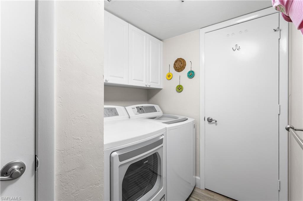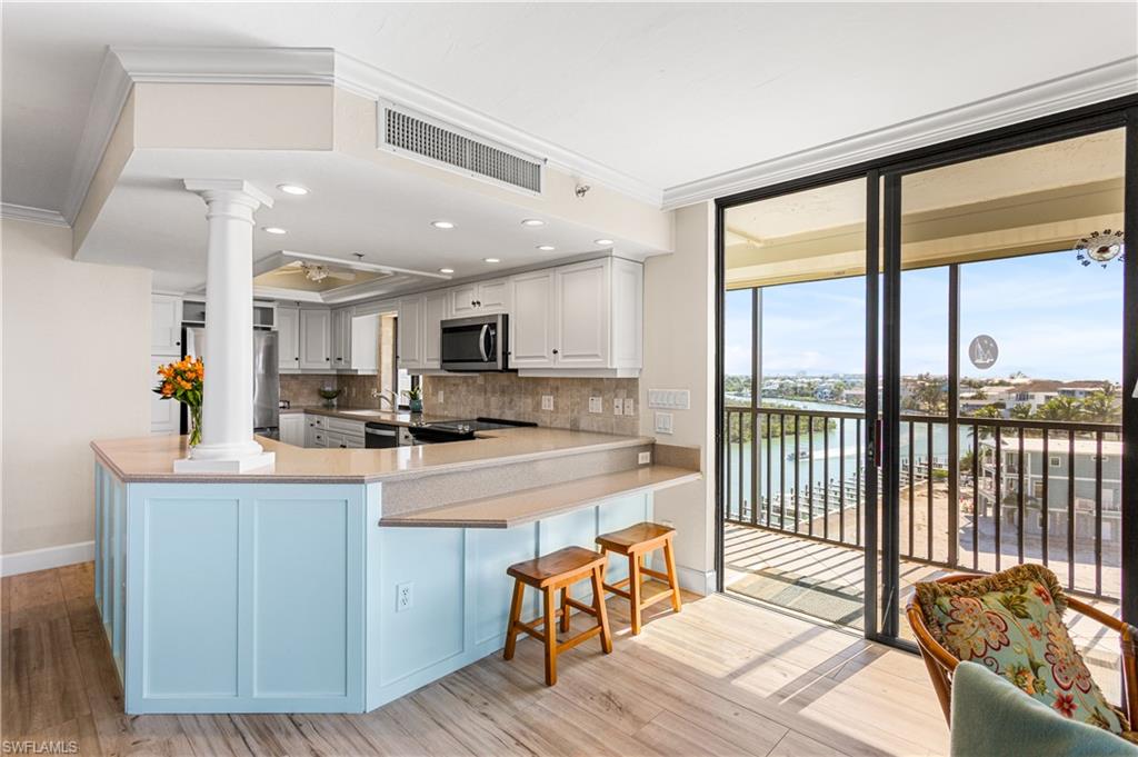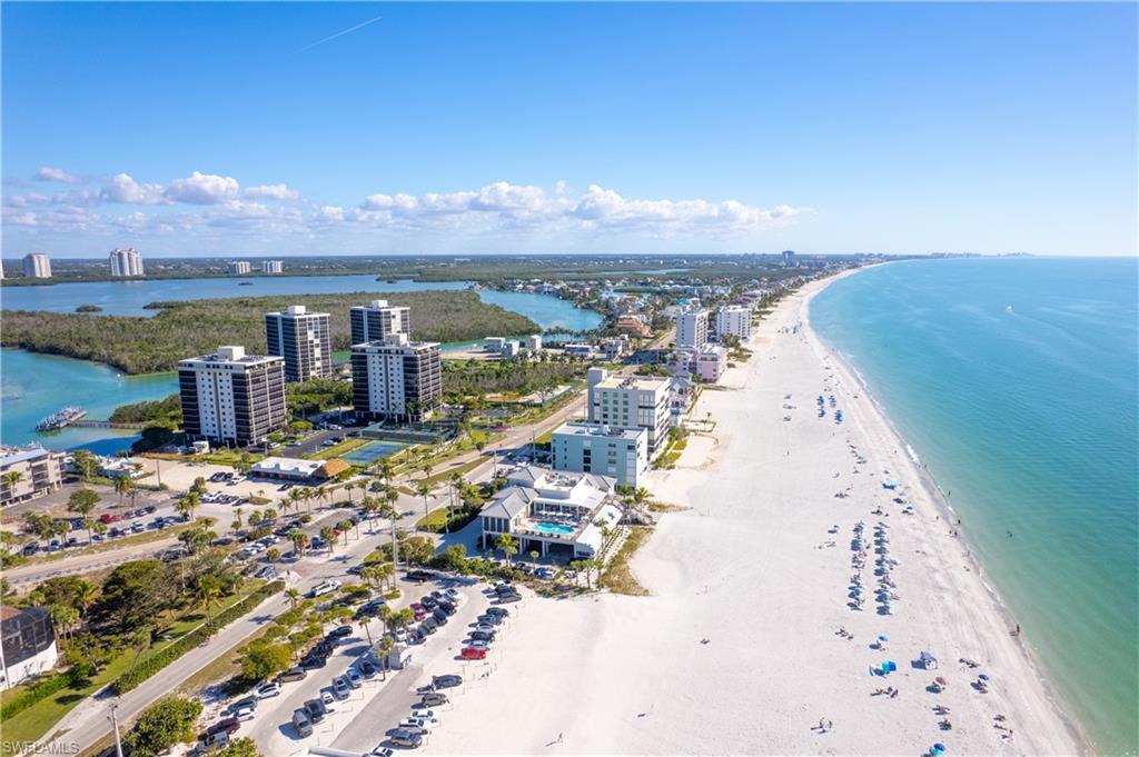 This perfect BEACH RETREAT awaits the most discerning buyer...BOAT DOCK #45 INCLUDED...YES!, STUNNING RENOVATION...YES!, UNDER BUILDING PARKING #28...YES! PANORAMIC BEACH VIEWS...YES!, DEEDED BEACH ACCESS...YES! You can have it all in this spacious (1550 sf) and beautiful, 6th floor corner unit in the prestigious Bay Harbor Club. This unique community offers deeded beach access directly across the street, bayside sparkling pool, 5 acres of lush tropical landscape, community room, sun deck, tennis/pickle ball courts, shuffleboard, and a WELL FUNDED RESERVE. ~THE CONDO~A stunning, tasteful renovation in neutral beach tones with an open and airy floorplan compliment this 6th floor corner unit. A wrap around screened and tiled balcony with electric storm shutters is the perfect place for watching the ever changing Florida Sunsets from the front balcony and the boats, dolphins, and manatees playing in the bay from the side balcony. ~The kitchen opens up to the Great Room/Dining Room/Balconies and boasts LED recessed lighting, breakfast bar, white maple cabinetry, custom woodwork, sand color Corian counters, stainless appliances including a 2024 Samsung refrigerator. An abundance of natural light, ceramic wood-like tile throughout except for custom carpet in primary bedroom, crown molding, a spacious Great Room with built in cabinetry, 2019 A/C, 2024 HWH, ECOBEE Thermostat, and extra storage on the balcony.~The Primary bedroom boasts amazing views, Plantation Shutters, walk-in closet with built in cabinetry, and en-suite bathroom with large shower, glass shower doors, dual sinks plus additional vanity. The Guest Bedroom also has amazing views, detailed ceiling woodwork, Plantation Shutters, and located next to the guest bathroom which has a tub/shower combination and glass shower doors. A separate laundry room with LG washer/dryer complete this wonderful property.~Sold turn-key furnished with some fine Art pieces for you to enjoy including a mosaic table on the balcony, terra cotta `under the sea` vase, Barbara Marcus-McKenna silk screens, Sandy Galoway `Entry to the Beach` water color and several more beautiful pieces. ~One 15 lb. pet allowed, and lenient rental policy 12 x/year with 30 day minimum makes this a great home, Investment or the perfect `Home away from Home`~THE LOCATION~Located directly across from Bonita Beach with deeded beach access across the street, walk/bike ride to dine at Coconut Jacks, The Fish House, and rent water toys at the famous Docs Beach House. A short drive to Coconut Pointe and Mercato Shopping Centers, churches, groceries, doctors, and the airport!~WELCOME TO YOUR BEACH RETREAT...BAY HARBOR CLUB #6D~