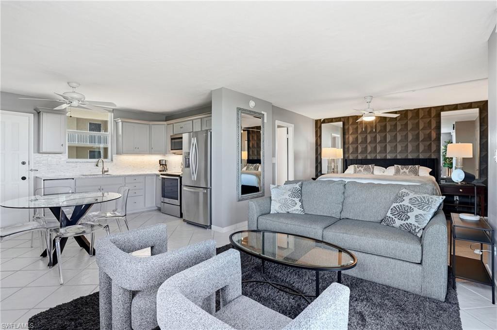 Remodeled and fully turnkey unit! This efficiency condo is conveniently located across from Bonita Beach and Doc's Beach House and offers many amenities including two community pools, tennis courts, pickleball, bicycle storage, and more. This unit also comes with its own all in one washer/dryer, sleeper sofa, new water heater, newer AC, beautiful quartz countertops, under cabinet lighting, and a nicely remodeled bathroom. This is the ultimate beach getaway with gorgeous Bonita Bay views. Great potential as a future investment with relaxed rental restrictions allowing owners to rent 121 times a year for a minimum of 3 days! The white sandy beach awaits, bring your flip flops!