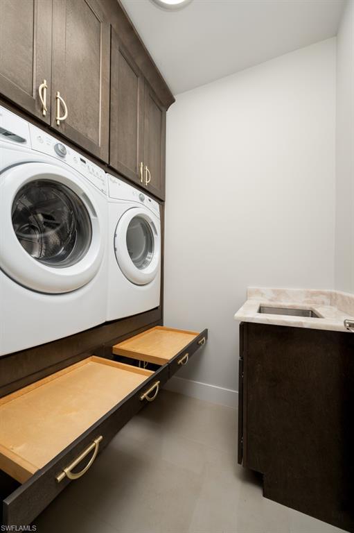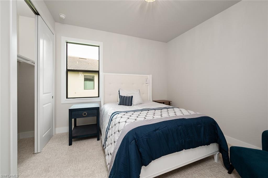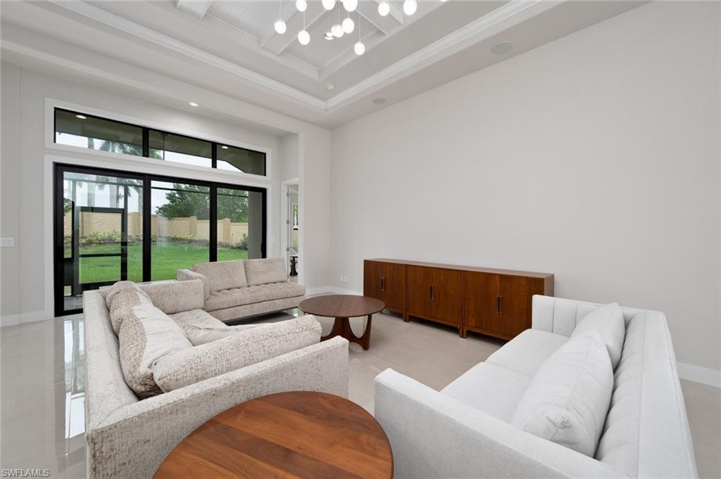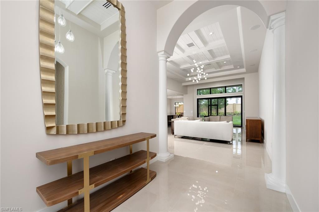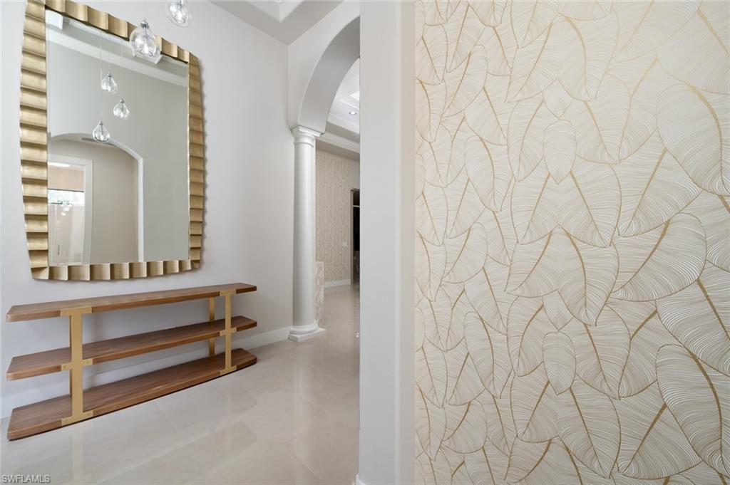 Beautifully upgraded family home blending architectural detail with everyday functionality. Soaring tray ceilings and a columned foyer open to a spacious great room with oversized sliders to a covered lanai and outdoor kitchen. The chefu2019s kitchen features imported Italian stone countertops, custom cabinetry, stainless appliances, oversized island, and a concealed walk-in pantry. The same designer-selected stone used in the kitchen and baths was specified in the Ritz-Carlton Naples lobby bar renovation. The primary suite offers a spa-style bath with soaking tub and walk-in shower. Large fenced backyard with room for a future pool.