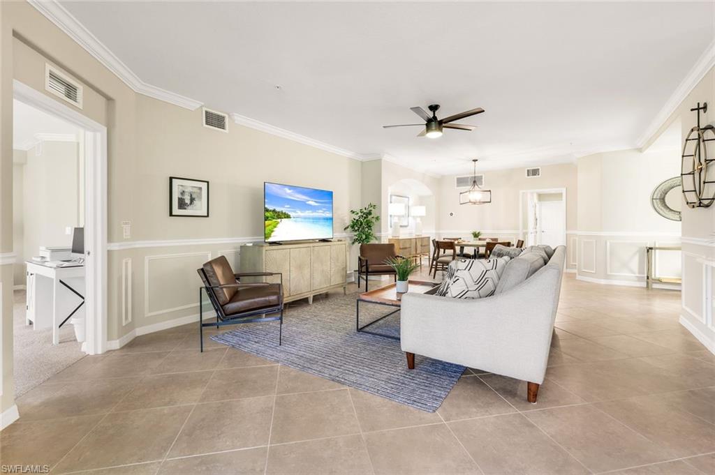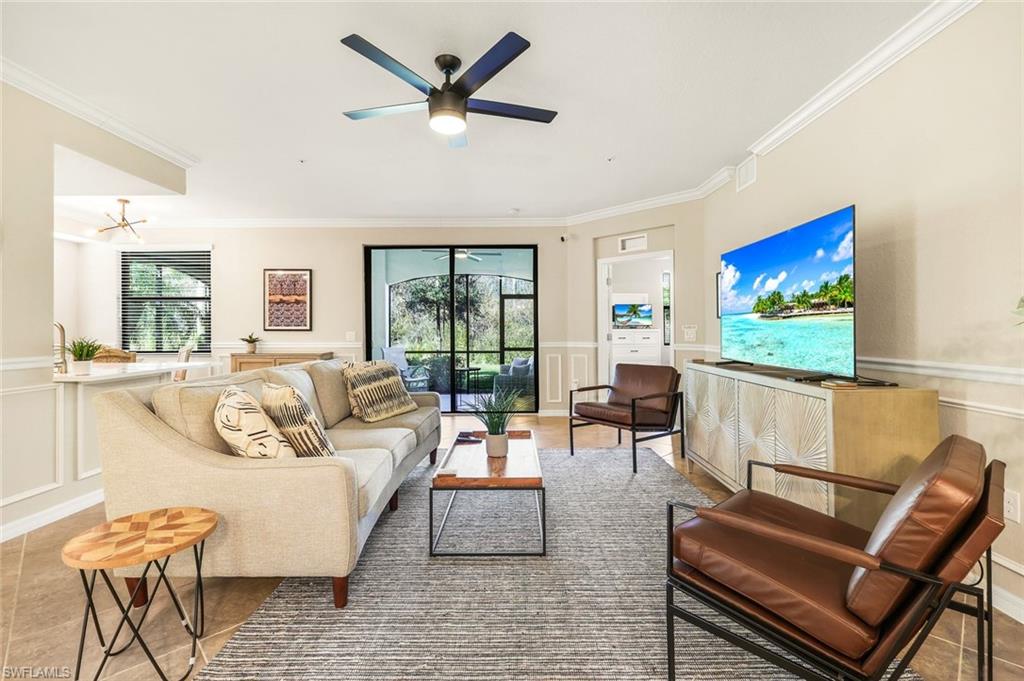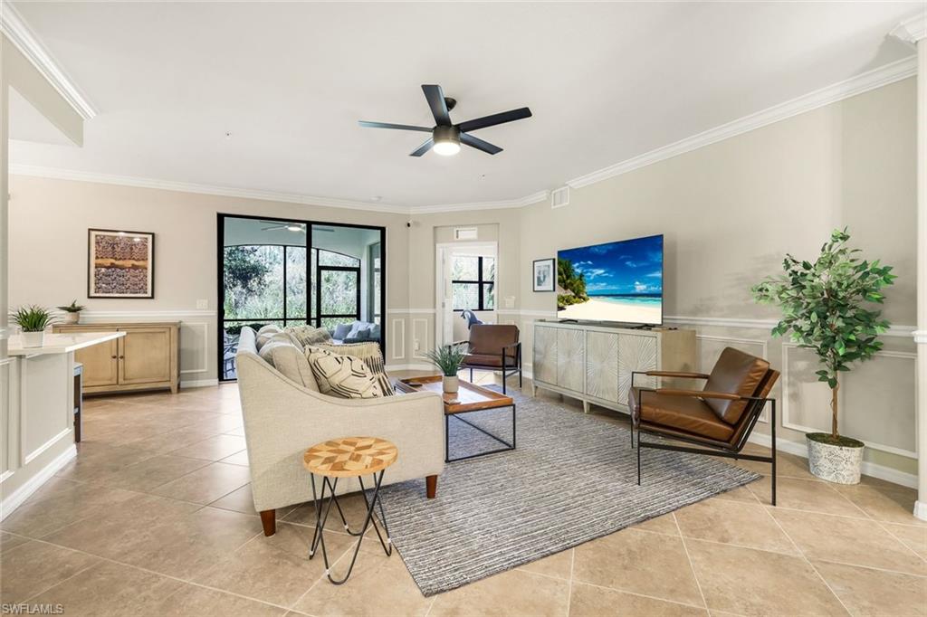 SOCIAL MEMBERSHIP INCLUDED! Step into this beautifully appointed first-floor corner coach home, featuring three spacious bedrooms, two full baths, and a two-car attached garage. The moment you enter, youu2019ll appreciate the exquisite detailsu2014crown molding, elegant wainscoting, and diagonally laid tile flooring. The open Great Room floor plan is perfect for entertaining, while the kitchen is discreetly tucked behind a wall to keep your living spaces neat and inviting. The primary suite serves as a private retreat with dual walk-in closets and a luxurious bathroom featuring an oversized soaking tub, separate shower, and dual vanities. A split-bedroom design ensures privacy for guests with two additional bedrooms and a full bath. Enjoy casual meals or game nights in the charming breakfast nook, and host more formal gatherings in the defined dining area of the Great Room. Unwind on the spacious screened lanai overlooking tranquil wooded views for ultimate privacy. Tucked away on a quiet cul-de-sac, this home offers a peaceful setting to embrace the SWFL lifestyle. Residents have access to an amenity-rich center with a lagoon-style pool featuring a waterfall and lap lanes, poolside cabanas and cafu00e9, a state-of-the-art fitness center, the U-Topia full-service spa and sauna, and a stunning clubhouse offering fine dining, game rooms, and meeting spaces.