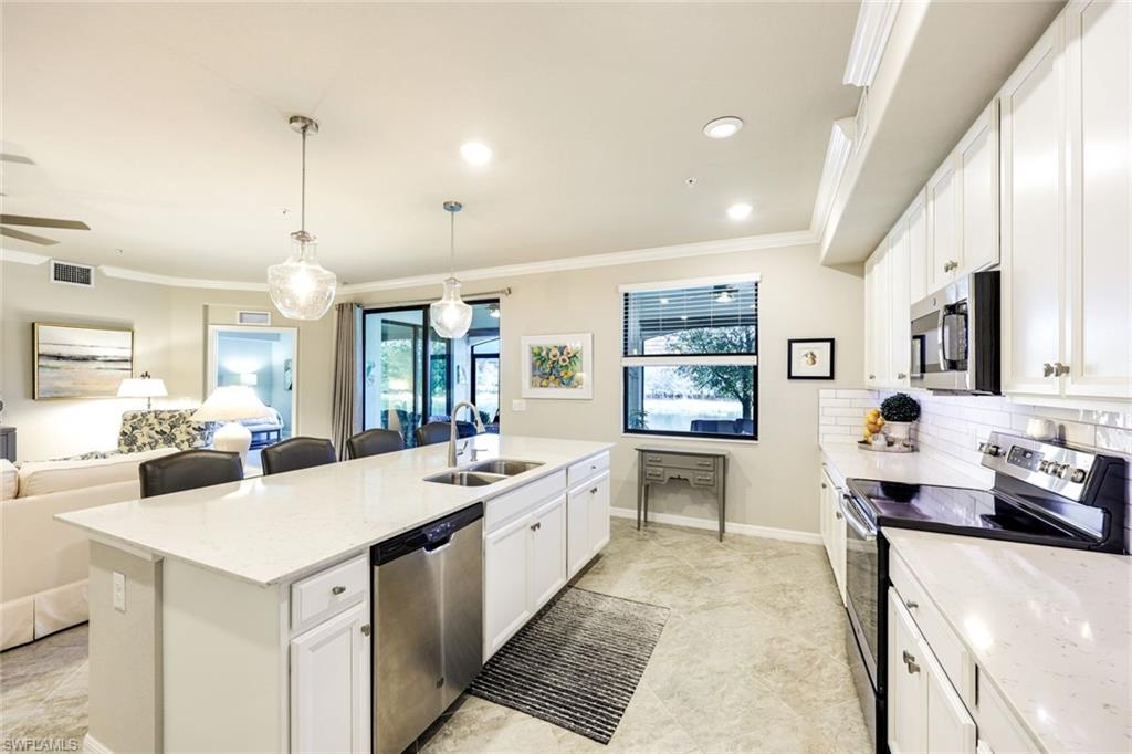 SOCIAL MEMBERSHIP INCLUDED! Welcome to this beautifully appointed 1st-floor corner condo offering 3 bedrooms, 2 full baths, and a 2-car attached garage in the highly sought-after Bonita National Golf & Country Club. From the moment you arrive, the elegant glass insert front door sets the tone for the light-filled interior. Inside, you'll find 18-inch tile laid on the diagonal and crown molding throughout the main living areas, complemented by light grey interior paint for a fresh, modern feel. The open-concept layout flows effortlessly into a spacious kitchen featuring a large island with seating for four, white raised-panel cabinetry, white tile backsplash, and stainless steel appliancesu2014perfect for both entertaining and everyday living. The expansive screened-in lanai is designed for true Florida living, complete with fine mesh screens, roll-down shades, and ceramic wood-look tile, offering plenty of room for dining and relaxing while enjoying peaceful lake views. The generous primary suite features private lanai access, two updated closets, and a luxurious ensuite bath with dual vanities, a large walk-in shower with frameless glass door, and a private water closet. The split floor plan provides privacy for guests, with two front guest bedrooms that can be separated from the main living area with a door. Luxury vinyl flooring enhances all bedrooms for both style and durability. Residents of Bonita National Golf & Country Club enjoy access to resort style amenities including a lagoon-style pool with waterfall and lap lanes, poolside cabanas and cafu00e9, state-of-the-art fitness center, full-service spa and sauna, and a stunning clubhouse with an exciting social calendar offering something for everyone, 21 active clubs you can partake in, two on-site dining venues, game rooms, and more. This exceptional home combines luxury, comfort, and resort-style livingu2014all in one.
