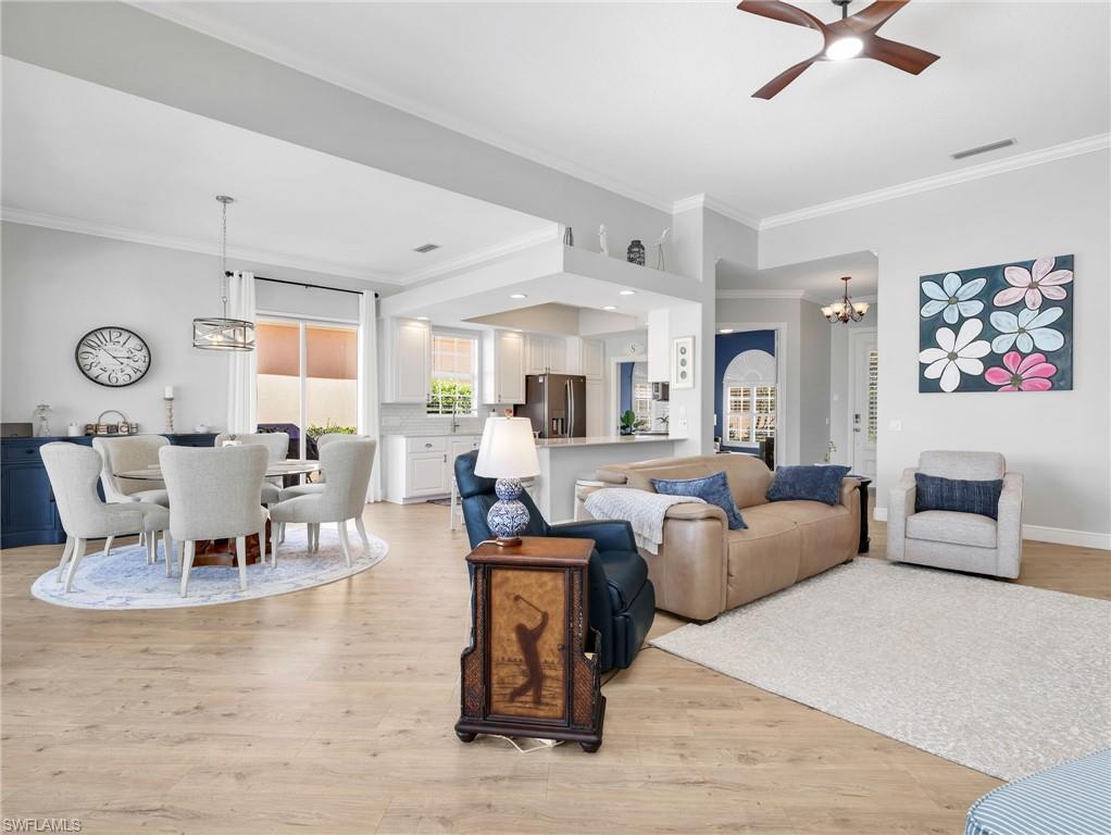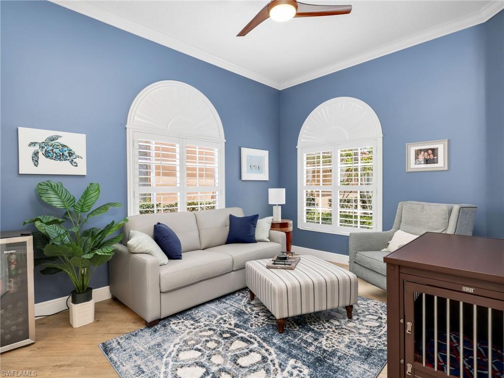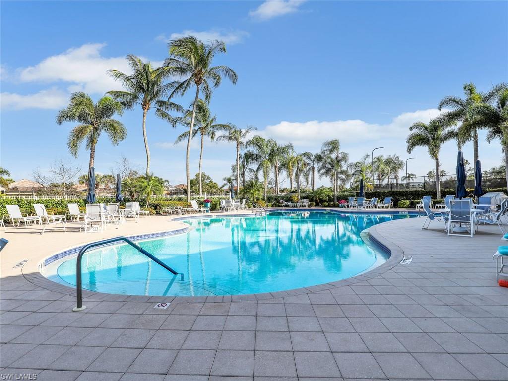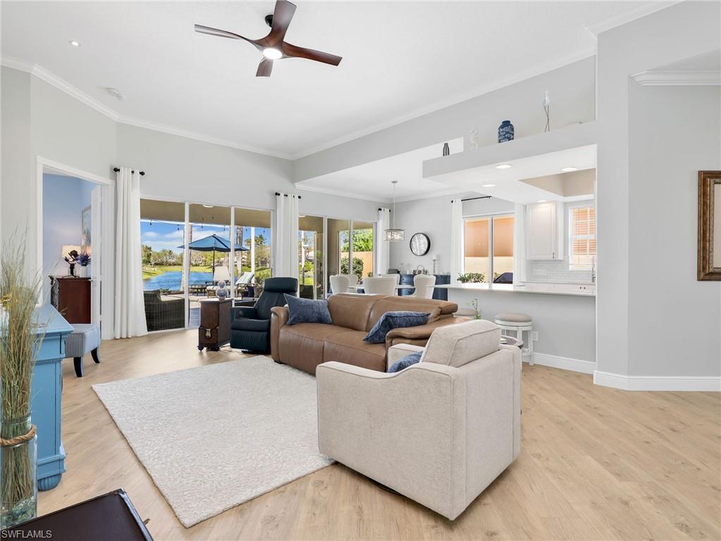 A truly exceptional waterfront setting defines this DiVosta-built Oakmont residenceu2014where three converging canals create a rare, expansive wide-water panorama that immediately captures your attention. Offering 3 bedrooms + den, 2 bathrooms, and a 2-car attached garage, this poured concrete and steel-reinforced home combines quality construction with an open, functional layout designed for both everyday living and entertaining. From the moment you step onto the spacious rear lanai, youu2019re met with sweeping, unobstructed water views, shimmering reflections, and a remarkable sense of openness and privacy. The heated saltwater pool is perfectly positioned to maximize this one-of-a-kind vantage pointu2014an ideal setting for sunset entertaining, quiet mornings, or simply enjoying the serenity of waterfront living. Located within San Remo at Palmira, a charming gated community of just 351 homes in Bonita Springs, the neighborhood is known for its lush tropical landscaping, tranquil lakes, and park-like settingu2014all with NO CDD fees. Inside, the home showcases an open floor plan with diagonally laid laminate flooring throughout the main living areas, a split-bedroom design, and a beautifully updated kitchen featuring Dekton countertops, tiled backsplash, newer gray stainless steel appliances, and a breakfast bar. Additional highlights include custom closets, plantation shutters, crown molding, 5u00bcu201d baseboards, central vacuum, security system, electric roll-down storm protection, and a recently painted exterior. The pool and tile have also been refinished, and the brick paver driveway and walkways enhance the homeu2019s curb appeal. Major updates include a newer roof (2020), A/C system (2021), and pool heater (2023), providing added value and peace of mind. Residents enjoy convenient access to community amenities just a short walk away, including a resort-style pool, fitness center, tennis and pickleball courts, and more. Ideally situated near Bonita Beach and Barefoot Beach, as well as premier shopping and dining at Coconut Point, The Promenade, Waterside Shops, and Miromar Outlets, the locationu2014enhanced by the Logan Extensionu2014offers seamless access to North Naples while maintaining a peaceful, private setting.