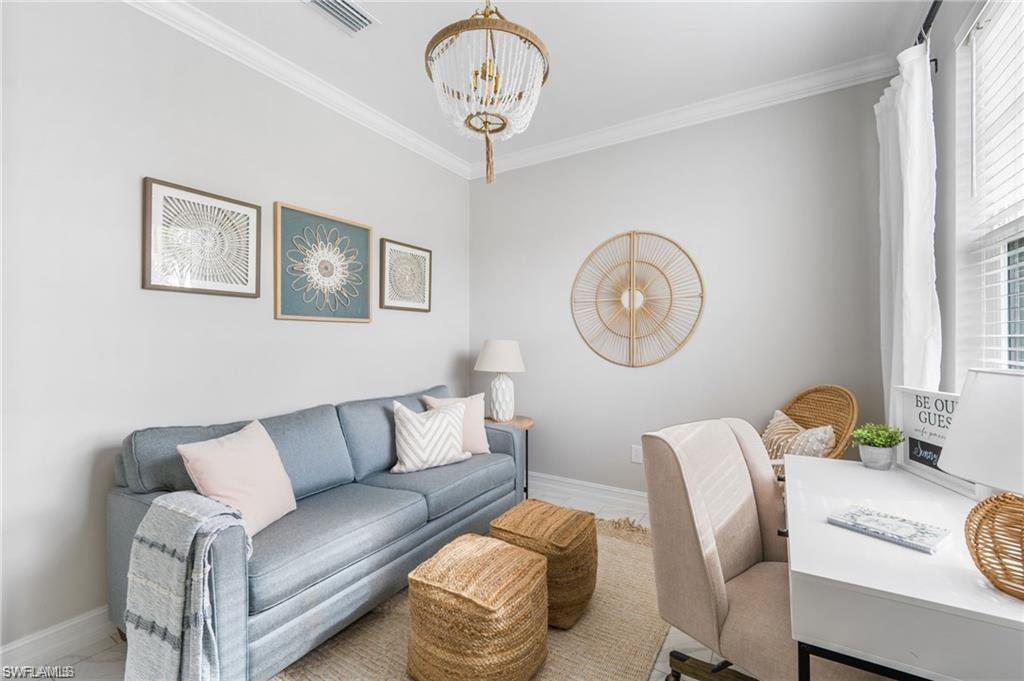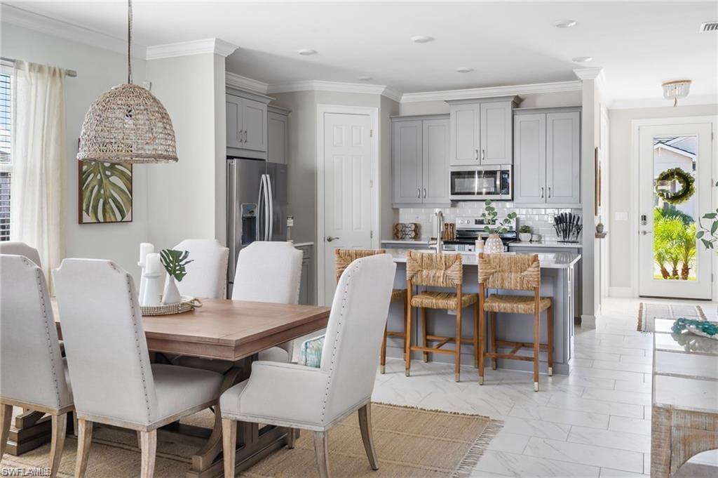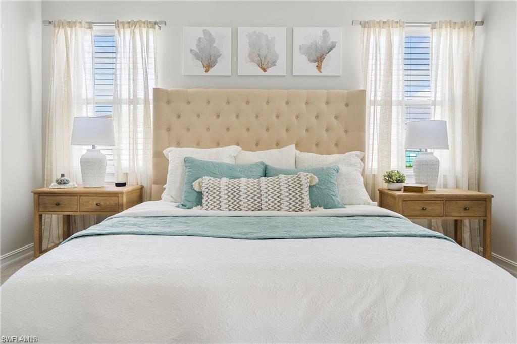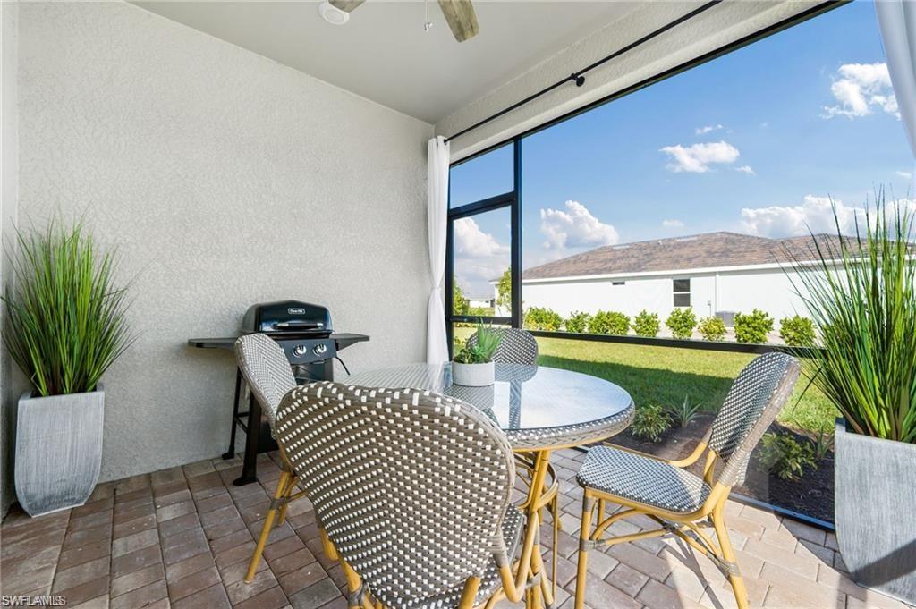 Coastal Modern Turnkey FURNISHED and PET FRIENDLY!!! Available August-Sept 2025 and May-December 2026 at $4000/mo, which includes internet and all utilities ($150/mo electric cap). 2 bedrooms plus a den to sleep up to 6 people! King sized bed and TV in Primary Suite with dual vanity sink and large walk in closet. The Guest Bedroom features a Queen sized bed and the den offers a sofa sleeper, plus a desk if you have to connect with the office. Screened lanai with outdoor dining set and grill. Large 2.5 car tandem garage for extra storage. Spend your days at the resort style amenity center enjoying the lagoon style pool, work up a sweat at the fitness center or meet up with some new friends at the tennis, pickle ball or bocce courts! Take an afternoon walk with your dog to the dog park and enjoy a sunset dinner on your back patio! Also just minutes to several famous Bonita Springs Golf Courses, the hot new Downtown Bonita and Riverside Park for dining and entertainment, Bonita Beach and all the fun Southwest Florida has to offer! Donu2019t miss out on this one! Owners are also listing agents.