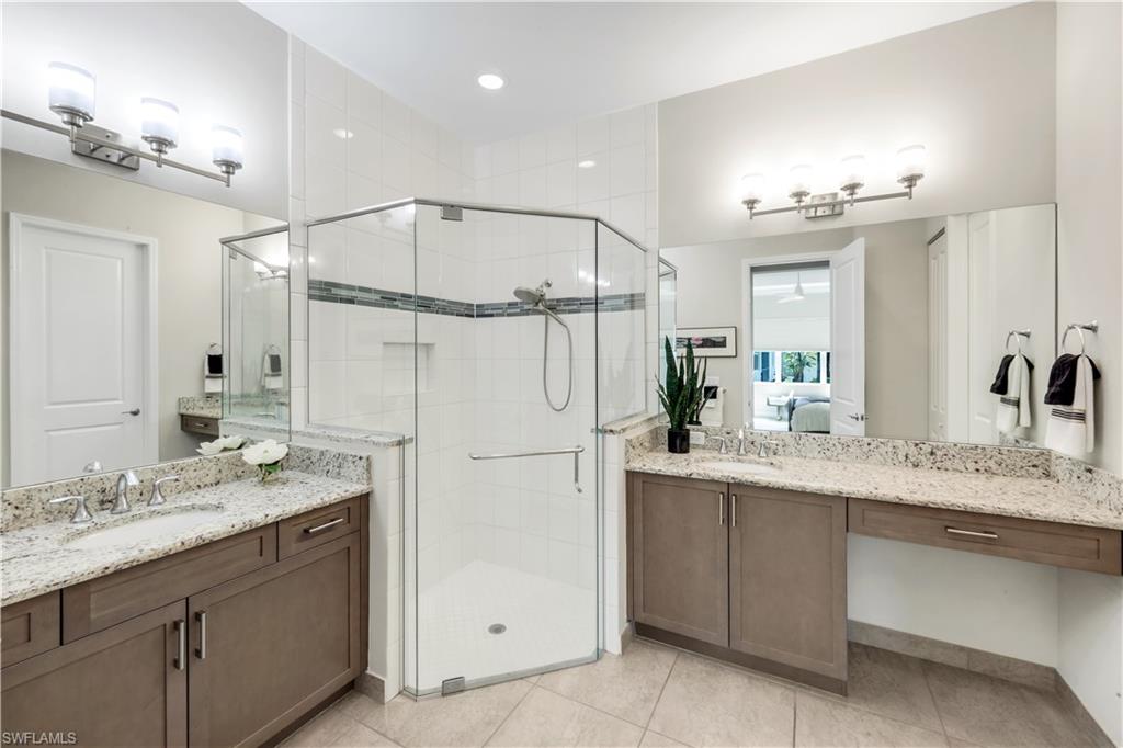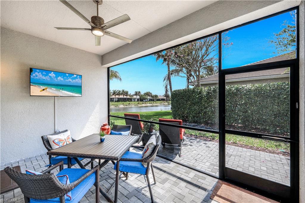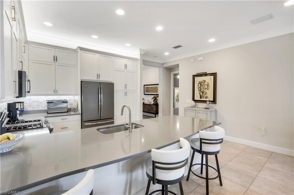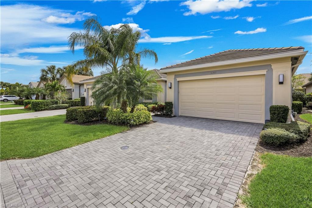 The Brighton floor plan is an attached Villa that offers a private front entry and a spacious open layout with 3 Bedrooms and 3 FULL BATHROOMS along with a 2 car garage. The bright white kitchen features quartz countertops, single bowl stainless steel undermount sink, white shaker style raised panel wood cabinets with builder upgrade upper cabinet boxes, pull outs in kitchen cabinets and pantry, GE builder upgraded slate appliances which includes French door refrigerator, dishwasher, slide in 30u201d 4 burner with griddle natural gas range, microwave vented outside, beautiful stone backsplash, large built in cabinet pantry, above & below cabinet lighting with light valence and molding. 5 1/4 u201c crown molding found in main living areas along with the primary bedroom. 20u201d X 20u201d tiled floors throughout the main living space and plush Berber carpet in the bedrooms . The owner installed a fantastic light fixture package along with ceiling fans. The bathrooms come with large floor tile that includes large wall tile at the bathtub and shower enclosures along with granite countertops and luxury height toilets. There is epoxy coating on the garage floor. Other additions through the builder were upgraded recessed lighting package, IMPACT WINDOWS , tankless hot water heater , decorative glass front entry door and an extended paver patio. Step outside onto your covered paver patio with the additional patio deck where this space provides ample room to entertain or just relax with the opportunity to see a beautiful lake view. All of this is located within Valencia Bonita, a vibrant 55+ community offering unmatched amenities including a spectacular clubhouse, resort-style pools, state-of-the-art fitness center, pickleball and tennis courts, walking trails, full-service salon, restaurant and outdoor bar, and an active calendar of social events and clubs. Donu2019t miss your chance to own this impeccably upgraded villa. Schedule your private tour today and experience the best of Southwest Florida living.
