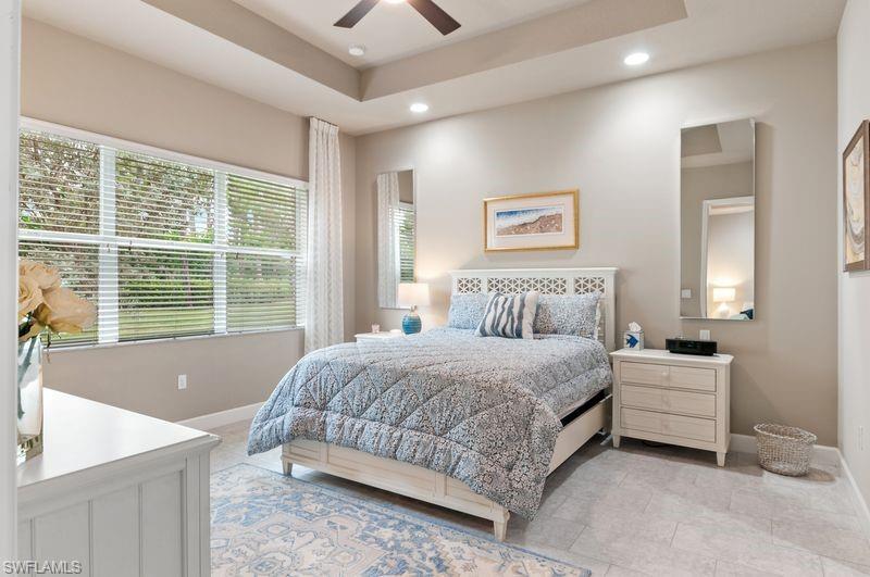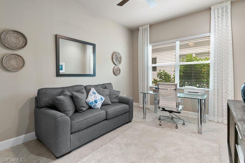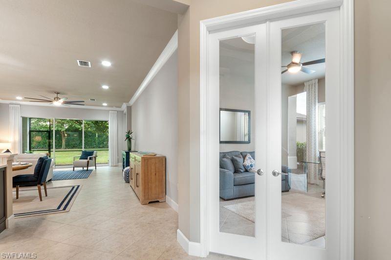 Best Value at Valencia Bonita! Beautifully FURNISHED Villa features 1,839 sq ft of exquisite living space with a bright Kitchen with breakfast area, expansive Great Room for dining and entertaining, 2 Bedrooms, 2 full baths, a Den/Office, 2 car Garage and screened lanai with landscaped views. Upgrades include quartz counters throughout, tile flooring throughout, impact glass windows and doors - front of home, Storm-Smart hurricane/sun protection lanai screening, coffered ceiling in Master, 5 ceiling fans, drapery panels in Den, Kitchen, Master Bedroom and Great Room, Laundry Room with cabinetry and sink, whole house Generator and so much more! Neutrally and tastefully decorated in a private location with lush landscape views. Valencia Bonita residents enjoy an unparalleled lifestyle with a full-time Lifestyle Director, curated daily activities and events. Enjoy dozens of resident clubs with something for everyone. Amenities include: concerts & entertainment in the social hall, indoor/outdoor The Oasis Restaurant & Bar, resort pool, resistance pool, lap pool, hot tub, cabanas, firepits, gym, billiards, card rooms, pottery room, cooking studio, spa featuring skin care, massage and nail salon, 8 pickleball courts, 8 tennis courts, fitness classes, pro-shop, bocce courts & two dog parks. A great opportunity to purchase a beautifully furnished villa with a quick closing at an exceptional price at Valencia Bonita, Southwest Florida's premier active 55+ lifestyle community.