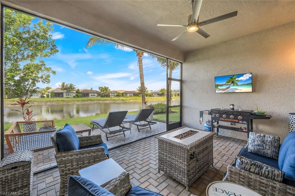 Welcome to this exquisite, highly sought-after York floor plan villa home, offering 2 spacious bedrooms, a large den, and 2.5 bathrooms, spanning over 2,000 square feet of open living space. Porcelain tile flows throughout, giving the home a polished, clean aesthetic that is easy to maintain. Thoughtful details such as fresh interior paint, crown molding, and custom decorator touches, including a built-in floating entertainment center in the great room, elevate the space. The chef's kitchen is a true standout, featuring white shaker cabinets, natural gas cooking, quartz countertops, ambient lighting, and stainless-steel appliances. You will appreciate the ample storage, including a pantry, multiple drawers, pull-outs in cabinets, and a deep single sink with an upgraded faucet. The large kitchen island is perfect for gathering with friends and family. The primary suite, with a serene lake view, is a true retreat, offering two walk-in closets with custom built-ins and a private en suite bath. The spacious guest room, complete with its own en suite bathroom, provides ultimate comfort for visitors. The oversized den offers endless possibilities, from a home office to a cozy entertainment room. Step outside to your screened lanai, where you can watch the sunset over the sparkling lake, a truly breathtaking view that changes with every season. The tranquil waters provide the perfect backdrop for relaxation and the `no-see-em` picture screen ensures you can enjoy the outdoors in comfort. Additional features include a finished laundry room with sink and cabinets, a screened front porch, plantation shutters, decorator lighting, ceiling fans, EV charger & extra high-hat lighting throughout. This home offers enhanced protection with hurricane impact windows and doors. Additionally, the lanai is equipped with an electric hurricane screen, offering an added layer of security & peace of mind. This home offers the perfect blend of space, function, and the coastal lifestyle youu2019ve been dreaming of. Located in Valencia Bonita which is more than just a community; it's a vibrant 55+ resort lifestyle where every day feels like a vacation. Nestled in Bonita Springs, this exclusive GL Homes community offers exceptional amenities, including a 45,000-square-foot clubhouse with a gourmet restaurant, poolside bar, and resort-style pool, as well as a lap pool and resistance pool. Enjoy a wide variety of activities, from tennis, pickleball, and bocce to more tranquil pursuits like yoga, art classes, and cooking studio sessions. Stay active in the state-of-the-art fitness center, unwind in the salon or socialize in the sports lounge and card rooms. For entertainment, the community features a theater with live performances, ensuring there's always something exciting to enjoy. With a dynamic calendar of events, a dog park, and a social hall, there's always something happening at Valencia Bonita. Visit today and see for yourself why this house is the perfect place to call home.
