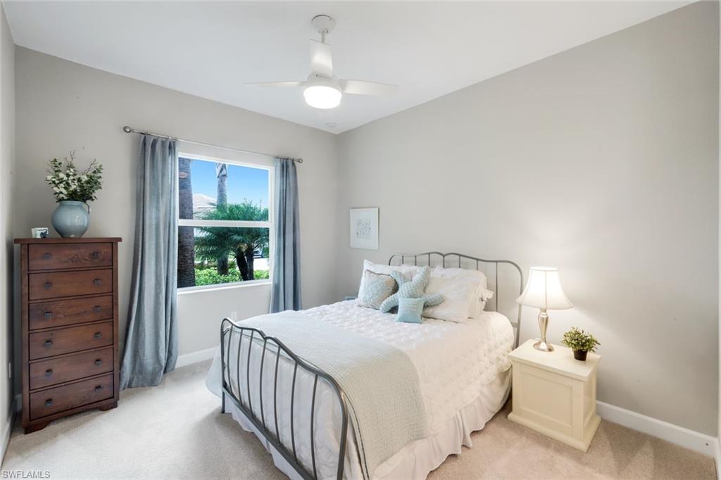 SPECTACULAR VILLA, HOMESITE AND VIEW! This attached villa, the very popular York plan is sitting on a pie shaped homesite providing that additional space between your neighbors. You will also have the benefit of a beautiful lake view and sunsets. This home provides you with an open layout with 2 Bedrooms, large den, 2 full Bathrooms, half bath along with a 2 car garage. The kitchen features white raised panel shaker cabinets with large built in pantry, above & below cabinet lighting, quartz countertops, glass subway tile backsplash, large stainless steel undermount sink, GE stainless steel appliances which includes a natural gas range, GE Profile Series Refrigerator, microwave which is vented out. 12u201d X 24u201d tiled floors throughout the main living space. More upgrades include a screened front entry and lanai no-seeum screen and top down / bottom up large cell shades for heat protection and flexibility for privacy and view of the property. The owner installed a fantastic light fixture package along with ceiling fans. The bathrooms come with white raised panel wood cabinets, large floor tile that includes large wall tile with listello accents at the bathtub and shower enclosures along with quartz countertops and luxury height toilets. Other additions through the builder were upgraded recessed lighting package, laundry room sink with base cabinet and upper cabinets, IMPACT GLASS WINDOWS, glass front entry door and an extended paver patio. Step outside onto your covered paver patio with the additional patio deck where this space provides ample room to entertain or just relax when looking at that beautiful lake view. All of this is located within Valencia Bonita, a vibrant 55+ community offering unmatched amenities including a spectacular clubhouse, resort-style pools, state-of-the-art fitness center, pickleball and tennis courts, full-service salon, restaurant and outdoor bar, and an active calendar of social events and clubs. Donu2019t miss your chance to own this impeccably upgraded, move-in-ready home. Schedule your private tour today and experience the best of Southwest Florida living.