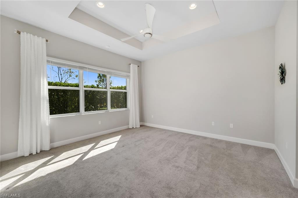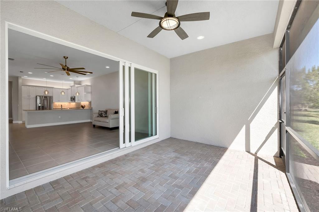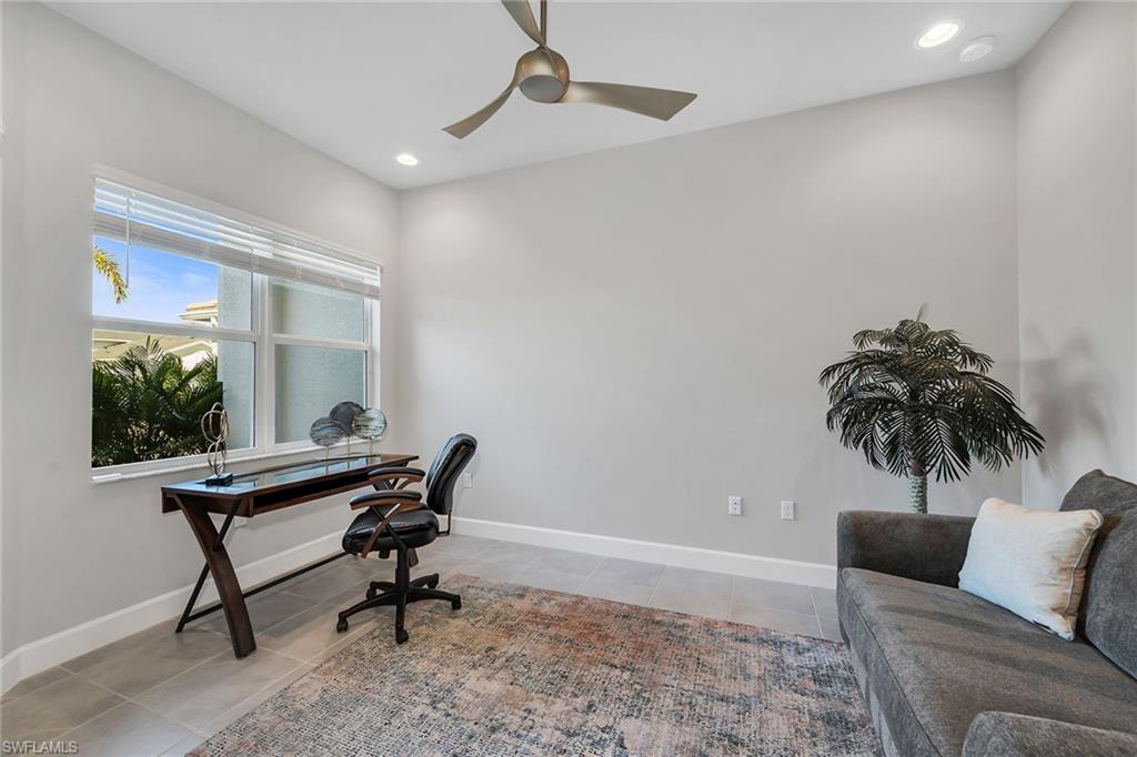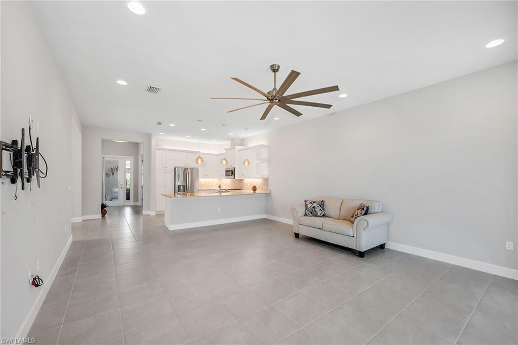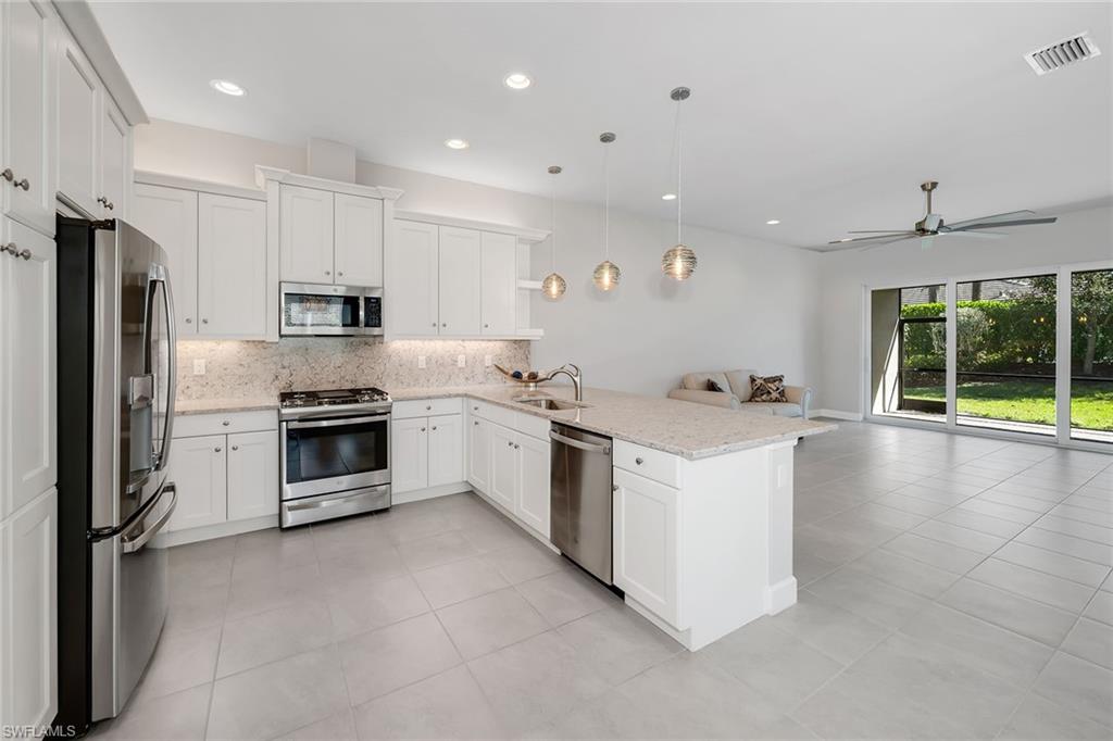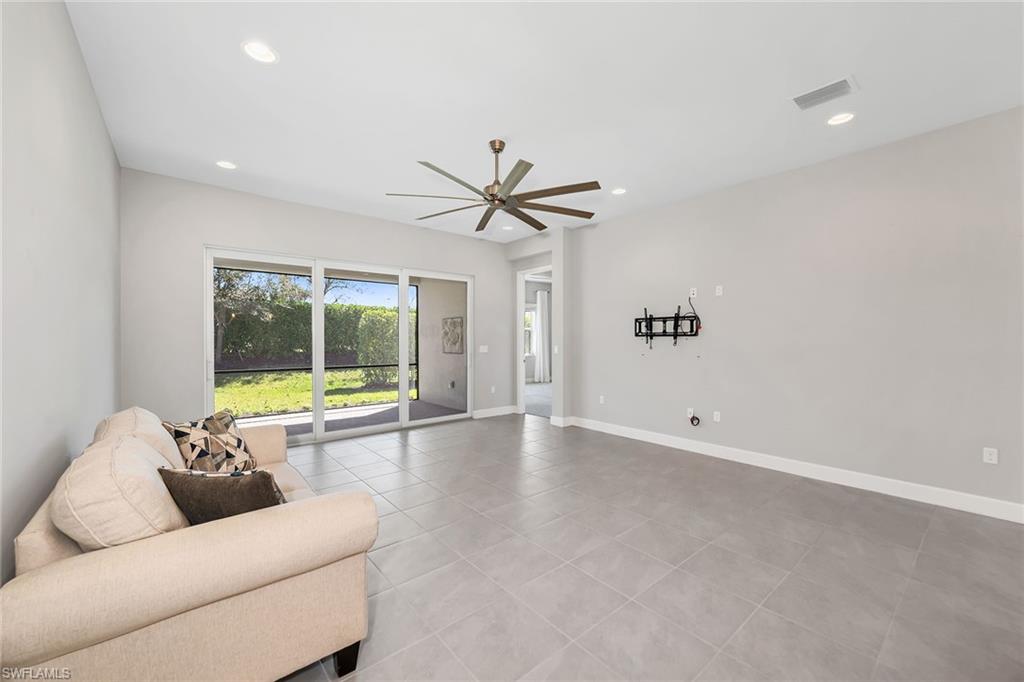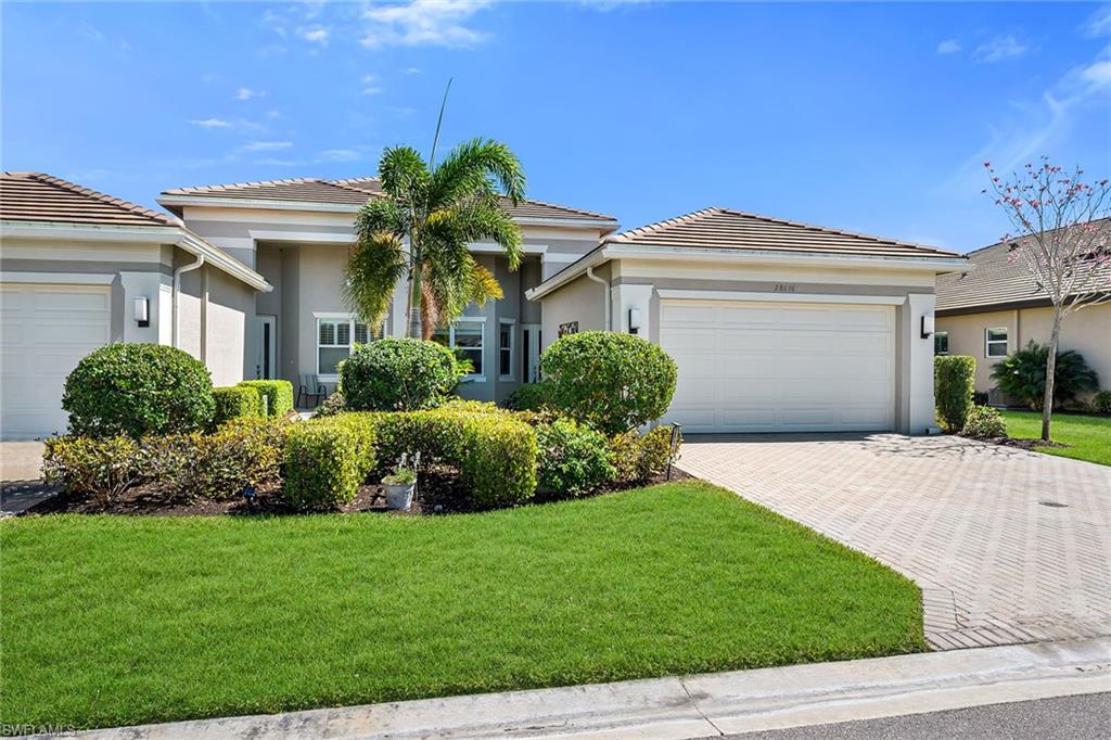 Enjoy serene privacy and lush landscaping views in this light-filled villa in the sought-after community of Valencia Bonita. Ideally on an oversized homesite, the property features an extended side yard on the south side of the home, providing additional green space and enhanced privacy rarely found in the neighborhood. With desirable eastern rear exposure for soft morning sun, this thoughtfully designed residence offers two bedrooms plus a den, two baths and a two-car garage, blending comfort, function and effortless Florida living. Inside, tile flooring flows throughout the main living areas, enhancing the bright and cohesive design. The open-concept living room is highlighted by recessed lighting and tranquil views of the paver lanai and lush landscaping beyond. A spacious formal dining room accommodates a table for six and features recessed lighting and a large window that fills the space with natural light. The den, accessed through double entry doors, provides flexibility for a home office or media room and includes recessed lighting for a refined finish. The kitchen is stylish and functional, appointed with white cabinetry, under-cabinet lighting, accent fixtures, and GE stainless steel appliances, including a gas range and French-door refrigerator. A four-seat bar offers casual dining, while the layout provides peaceful views of the lanai and surrounding greenery, ideal for entertaining or everyday enjoyment. Positioned at rear of the home, the primary suite serves as a relaxing retreat featuring a tray ceiling, recessed lighting, abundant natural light and lush landscape views. Two walk-in closets provide generous storage, while the en-suite bath offers dual vanities, a glass-enclosed shower and a linen closet. The guest bedroom is on opposite side of the home for added privacy and includes a ceiling fan and walk-in closet. A well-equipped laundry room with GE washer and dryer, upper cabinetry and utility sink adds everyday convenience. Go outside to the spacious paver lanai, where eastern exposure and mature landscaping create a peaceful outdoor setting ideal for morning coffee or evening relaxation. Valencia Bonita is a premier 55-plus community featuring a 45,000-square-foot resort-style clubhouse with a member-only restaurant, social hall, fitness center, spa, culinary studio, arts and crafts studio, card rooms and billiards lounge, along with a full calendar of clubs and activities. Outdoor amenities include pickleball, tennis and bocce courts, a resort pool with cabanas, lap and resistance pools, heated spa and dog park. Conveniently near Interstate 75, beaches and downtown Bonita Springs favorites like Sugar Shack and The Rooftop at Riverside, and approximately 45 minutes from Fifth Avenue South, Artisu2014Naples and The Baker Museum, it offers resort living year-round.