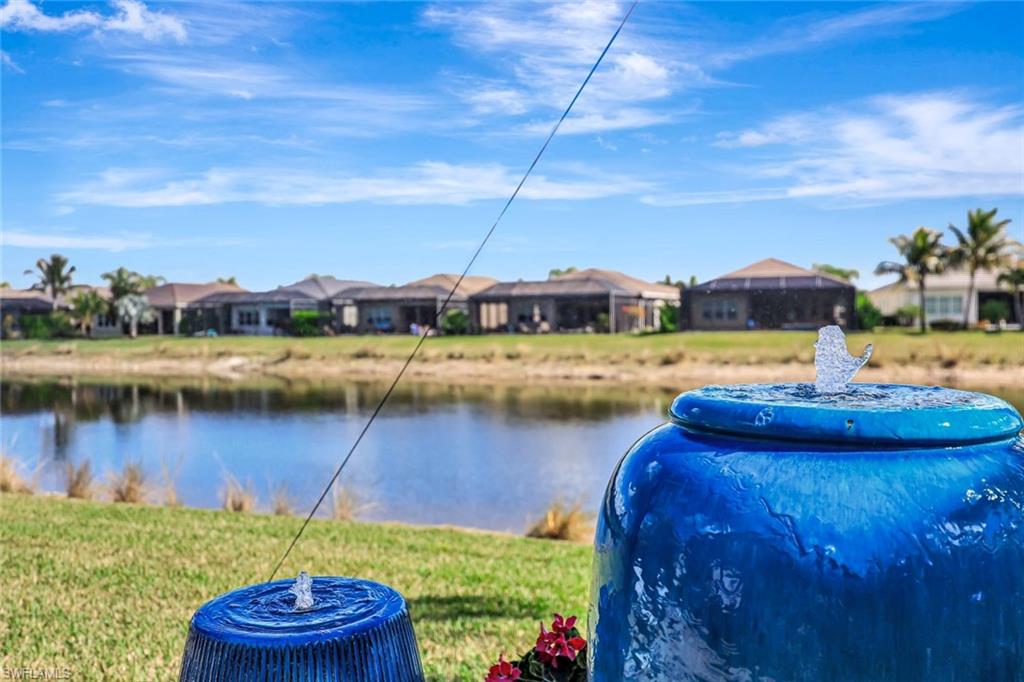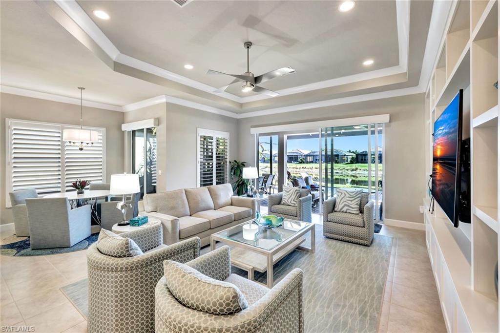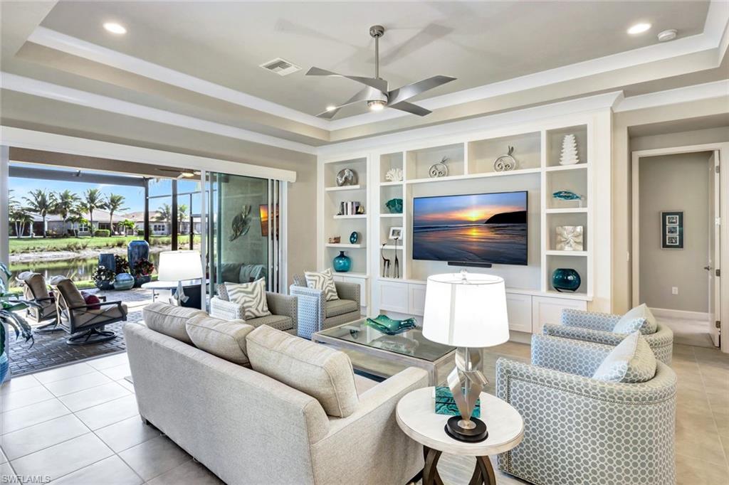 Offered TURNKEY! This tastefully decorated, very popular Chandon plan comes with stunning furniture and accessories. From the moment you enter this home, you are greeted by a light-filled open floor plan that provides 4 bedrooms (or 3+Den) 3 full bathrooms and a 2 car garage. The gourmet kitchen features quartz countertops, glass subway tile backsplash, white raised panel wood cabinets with some pull out drawers, GE stainless steel appliances which includes a natural gas range, large built-in cabinet pantry, above and below lighting & Kinectico RO System for kitchen sink. The spacious living area showcases a custom built-in entertainment center adding both functionality and flair. Throughout the main living areas including the den and primary bedroom, you will find 5 1/4` crown molding along with 18 x 18 tile floors throughout the main living space and den. Additional features include an epoxy-coated garage floor, workbench and cabinets in the garage and a beautiful laundry room with sink & cabinetry allowing for all the storage space you could desire, a tankless hot water system, many electrical options added by the builder such as additional outlets and recessed lighting, plantation shutters, spectacular lighting fixtures and ceiling fans, custom drawer additions, primary bedroom closet organizers and much more. Step outside onto your covered patio with an additional patio deck enclosed with a picture window screen providing a large space to entertain or just relax while looking at the serene lake view. Motorized shades at great room sliders. Enjoy all of this in Valencia Bonita, a vibrant 55+ community offering unmatched amenities including a spectacular clubhouse, resort-style pools, state-of-the-art fitness center, pickleball and tennis courts, walking trails, full-service salon, restaurant and outdoor bar and an active calendar of social events and clubs. Don't miss your chance to own this impeccably upgraded, move-in-ready home! Schedule your private tour today and experience THE BEST OF SOUTHWEST FLORIDA LIVING.
