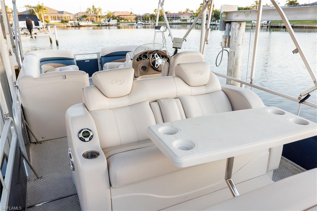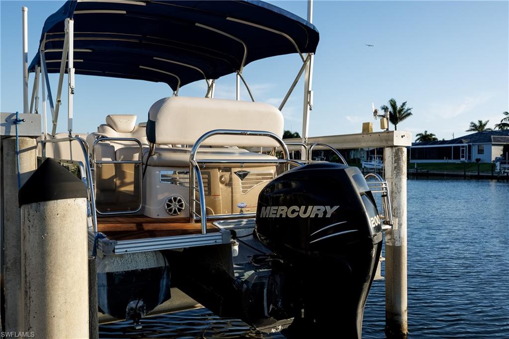 Experience the Florida waterfront lifestyle in this stunning Gulf access home located in the highly desirable Burnt Store Isles. This spacious residence features four bedrooms plus a den or loft, and three bathrooms, all designed with comfort and luxury in mind. The bright, open floorplan boasts soaring 20' ceilings in the living area and tile flooring on the first level, all solid core interior doors, complemented by impact windows and doors, electric roll-down shutters, and accordion storm protection, ensuring safety and peace of mind. The home has been recently updated with a new Brava synthetic tile roof (2024) with a transferrable lifetime warranty and a fresh coat of exterior paint (2025), new pool pump (2025) along with plantation shutters throughout. The chefu2019s kitchen is equipped with a 6 burner gas Viking range, granite countertops, stainless steel appliances, soft-close cabinetry, and a breakfast bar, opening to a dining area that overlooks the intersecting canal, perfect for enjoying the abundant water views. The spacious master suite features a tray ceiling, French doors to the pool area, dual walk-in closets with custom organizers, and a luxurious bathroom with a walk-in shower and jetted soaking tub. On the first floor, there is an additional bedroom and bathroom with lanai access, while upstairs youu2019ll find two more bedrooms, a guest bathroom, a loft overlooking the living area, and a balcony offering remarkable water and sunset views. Both the balcony and pool lanai are equipped with retractable sunshades, providing comfort and shade. Outside, enjoy a heated pool with a waterfall feature and spill-over spa, a lanai with a beverage bar, and a meticulously landscaped yard with paver walkways leading to the 60-foot concrete dock, which includes water, electric, and a 16,000 lb boat lift. The 2011 Manitou 25u2019 Tritoon with only 253 hours on the 200 HP Mercury engine is included with the home. With one of the lowest price/sqft ($318/sqft), this home offers an exceptional outdoor living environment ideal for entertaining or relaxing while watching breathtaking sunsets with western exposure. Located minutes from Charlotte Harbor and the Gulf with no bridges to navigate, it provides quick access to endless water adventures. Residents can also enjoy the privileges of the exclusive Twin Isles Golf & Country Club, offering various membership options, or explore nearby Punta Gordau2019s vibrant downtown, Fishermanu2019s Village, beaches, shopping, dining, and outdoor recreation. This exceptional waterfront property truly combines luxury, comfort, and lifestyleu2014an opportunity not to be missed.