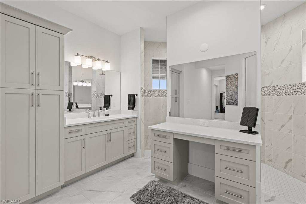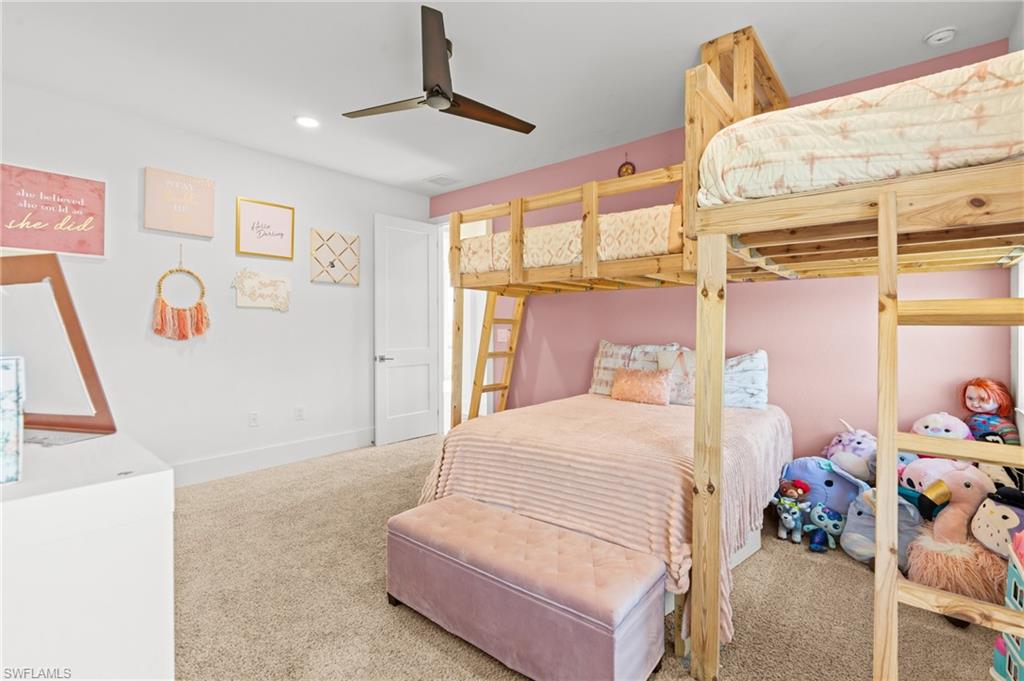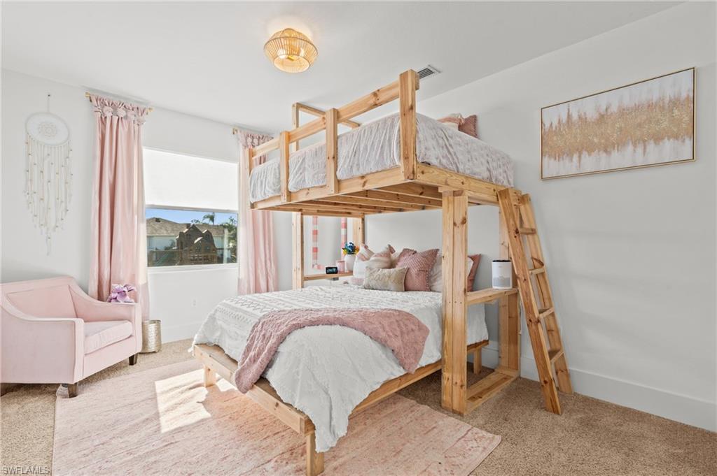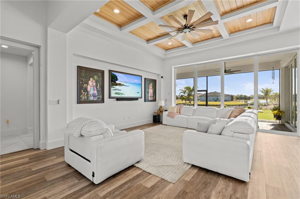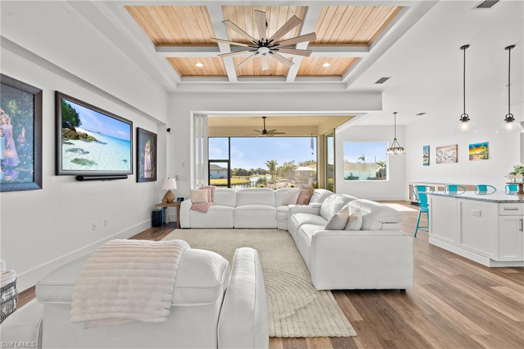 Wow, what a beautiful house! As you arrive, the home's curb appeal welcomes you with a beautifully oversized paved driveway leading to an impressive French Door entryway. Step inside to find a spacious, open-concept living area, highlighted by a breathtaking 12-foot double-tray custom coffered ceiling. The room is designed for relaxation and entertainment, making it an ideal spot for entertaining or peaceful evenings. The zero-corner sliding glass door seamlessly integrates indoor and outdoor spaces creating the perfect spot for relaxing, entertaining or closing out the evening with a toast to end the day. The home is already equipped with a rod-iron fence for the fur babies or small ones. No need to worry about putting those manual shutters up as this home has hurricane-impact windows for your protection. The upgrades in this home go on and on. No need to worry about that high electric bill as this home has Samsung solar panels to fuel the whole house with a fixed monthly bill. Also additionally added is a full panel/whole house surge protector. This four-bedroom home includes two luxurious suites and a versatile den/study that serves as an enjoyable workspace with a 3-car attached garage. This home is nestled on one of the larger lots in the community, bordering a serene freshwater lake. It's a peaceful escape from the hustle and bustle, yet provides easy access to Punta Gorda and Cape Coral. The owneru2019s suite is a haven featuring two walk-in closets and a linen closet. The luxurious bathroom is a true retreat, with triple granite-topped vanities, and an exquisite Roman shower With the split floor plan, one of the guest rooms has a full bathroom, and both bedrooms have spacious closets and built-in bunk beds, which can be taken down if the buyer requests. The kitchen is every chef's dream, offering island seating, a stylish farm sink, and fixtures by Moen. The 42u201d wood cabinets with glass uppers and granite countertops create a perfect blend of function and aesthetics. With a pantry prepped for all your culinary gadgets and sleek stainless appliances, itu2019s ready for your next cooking adventure.