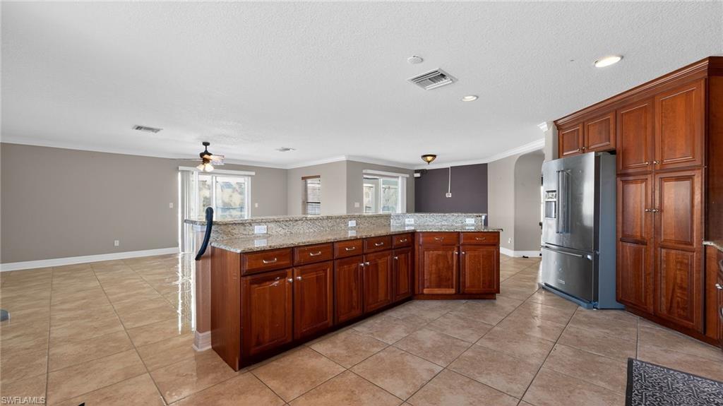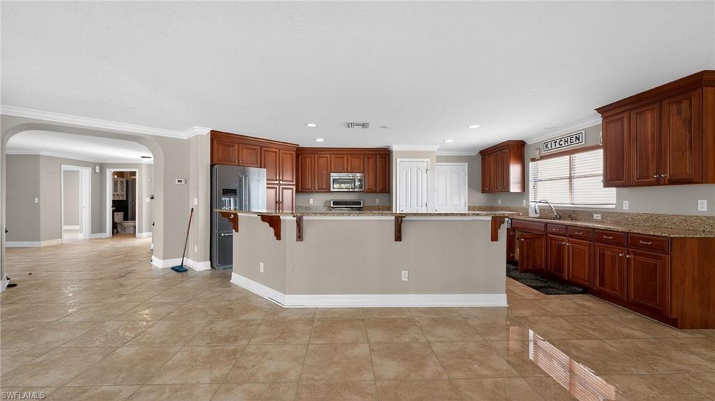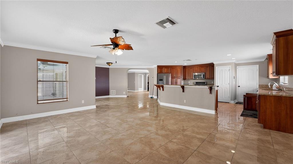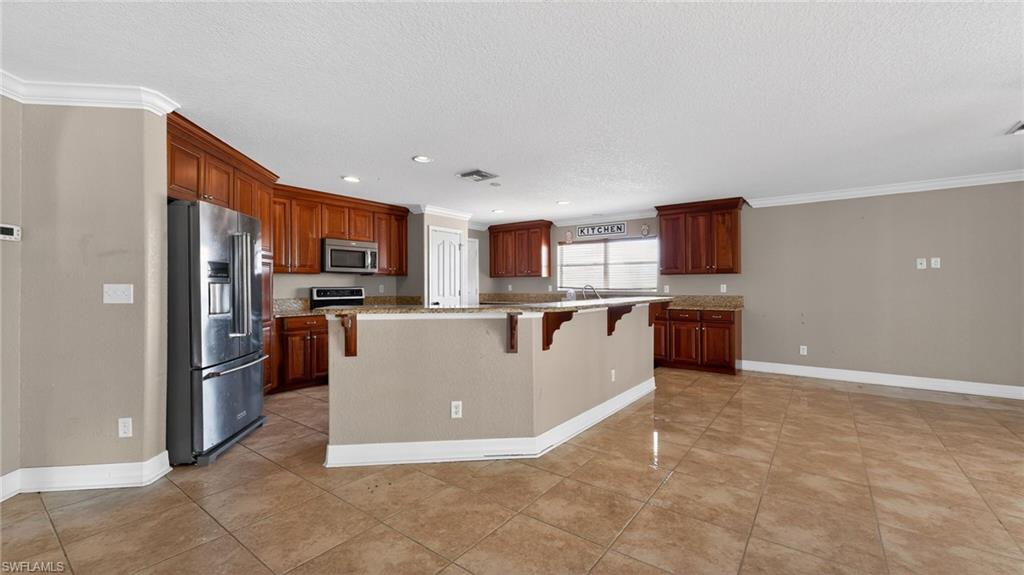 This expansive 3,700-square-foot residence in the Burnt Store Lake community offers generous living space and beautiful western sunset views. The home includes 4 to 5 bedrooms, four bathrooms, and a three-car garage. Outdoor living is enhanced by an oversized covered lanai and a private pool with a waterfall feature, creating an ideal setting for relaxation and entertaining.The main level provides an impressive layout anchored by a gourmet kitchen equipped with granite countertops, custom cabinetry, stainless-steel appliances, and a spacious dining area. Adjacent living spaces include an exceptionally large living room, a den or art studio, and a full bathroom conveniently located near the kitchen.Upstairs, the home continues to offer substantial space. The primary suite features a sitting area, an oversized walk-in closet, and a bathroom with dual vanities. A 14u2019 x 14u2019 loftu2014large enough to function as a secondary living roomu2014sits alongside three additional guest bedrooms, a full bathroom, and a nearby laundry room for added convenience.Residents also enjoy access to a gated community park that includes a kayak launch, walking trails, and a playground. The property is located close to Burnt Store Marina, offering boating and waterfront dining, while downtown Punta Gorda is approximately a 12-minute drive away. Interstate 75 and Southwest Florida International Airport are also easily accessible.