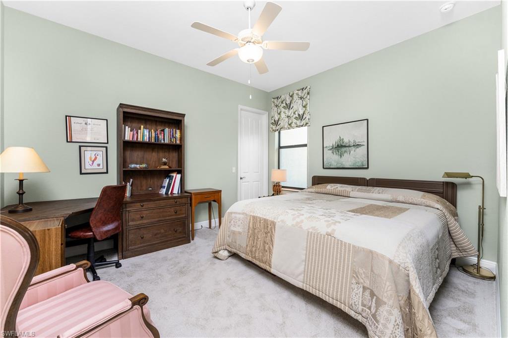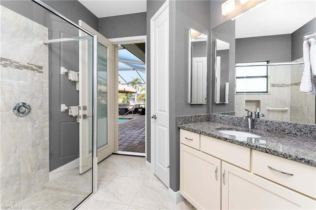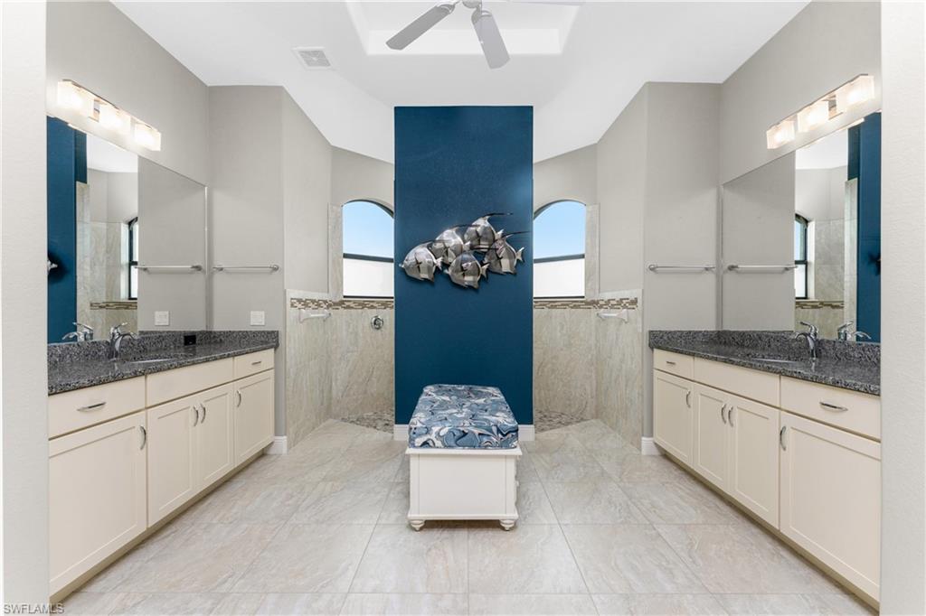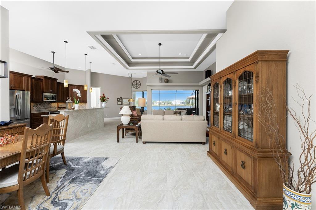 Witness intoxicating daily sunsets and majestic Florida wildlife over your expansive private waterfront vista. Perched at the end of a quiet cul de sac, this impressive customized Majestic model by Paul Homes enjoys 175' of pristine waterfrontage and boasts great curb appeal...starting with the pleasing front elevation with a handsome variegated tiled roof. Experience a true sense of grandeur when you step inside, and enjoy the tropical breeze as the disappearing 8' impact glass door wall draws you to the expansive lanai with panoramic lake views. Soaring 13-14' tray ceilings add to the grandeur of the striking great room plan! Tasteful oversized tile floors are complemented by the soothing color palette that nicely accentuate the pleasing architectural features. Custom leaded glass transoms add interest to the inviting dining area and foyer with stylish light fixtures that add to the ambiance of the space. Shaker style custom warm wood cabinetry offers an attractive focal point in the kitchen with abundant drawer storage, and custom spice pull outs with dual pantries to accommodate all your cooking & baking supplies. Sprawling stone counters make for great work surface for the family cook with stainless GE appliances including a double oven-convection to whip up your favorite dishes! This split plan offers a spacious primary suite with 11' tray ceiling, 8' sliding impact glass doors that allow you to wake up to serene water views, dual walk in closets, and a sensational ensuite bath. Expansive split vanities connect to the pass through shower that invites in cheery Florida sunshine. The guest wing offers two generously sized rooms. The owners cleverly converted the 13x14' room (with a view) to a multipurpose space with convenient queen size built in murphy bed and adjoining office that can also be a killer closet! The third guest room also offers an oversized closet making for phenomenal storage in this home. The inviting lanai epitomizes the Florida lifestyle, with a 33' expanse and 12' ceilings, the perfect venue for a large waterfront gathering. The heated saltwater lap pool with waterfall feature is great for a swim and is surrounded by an expansive paver deck. The handy guest bath doubles as a pool bath , plus a convenient sink and grilling area are handy when entertaining! Planting beds share the irrigation system with the picturesque yard, which draws the water from the lake. This home not only offers impact glass throughout but also features a whole house water filter & softener, in-wall pest control, new water heater (12/25), three years old AC, oversized 3 car garage with epoxy floor and kayak hoisting system.