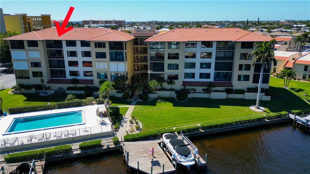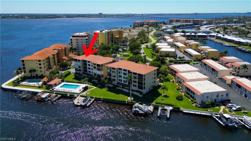 THIS PENTHOUSE VIEW DOESNu2019T WHISPERu2026 ITu2019S A SHOW-OFF. Commanding panoramic water views from nearly every angle, this 5TH-FLOOR PENTHOUSE places you in a front-row seat to the ever-changing beauty of the CALOOSAHATCHEE RIVER. With NO NEIGHBORS ABOVE and endless blue horizon stretching before you, this residence feels like your own private retreat in the sky. Nearly 1,300 sq ft of smartly designed living space makes this penthouse live more like a single-family home than a typical condo. The expansive 27u2019 WIDE GREAT ROOM immediately draws your attention, where large windows frame the river like a living work of art. Sunrises pour into the space, filling your home with natural light and creating a bright, open atmosphere throughout the day. Your 15u2019 x 7u20196u201d tiled balcony becomes the perfect place to begin the morning with coffee over the wateru2014much like standing on the deck of a luxury cruise ship, only without the crowds. Dolphins and manatees occasionally glide through the water below while kayakers and plenty of boaters drift peacefully along the river. The kitchen offers generous storage, granite countertops, newer appliances and a convenient pass-through to the dining area, making entertaining easy. The spacious great room-style layout creates an open, airy environment that flows effortlessly for both relaxing evenings and gatherings with friends. A split-bedroom floor plan provides privacy for guests. The primary suite serves as a comfortable retreat with balcony access, a large walk-in closet, dual sinks, walk-in shower and private commode. Evenings bring their own magic as summer storms roll across the river and holiday fireworks light up the sky, giving you front-row seats to natureu2019s most spectacular light show. Two additional front porch sitting areas provide even more space to relax and enjoy the peaceful surroundings. Practicality meets convenience with an in-unit laundry room, extra ground-floor storage unit and a reserved UNDER-BUILDING PARKING SPACE that keeps your vehicle cool and protected from the Florida sun. This intimate 24-UNIT COMMUNITY is tucked away at the end of a quiet cul-de-sac and surrounded by lush, park-like grounds with mature shade trees. Residents enjoy a heated pool and scenic community terrace ideal for sunset gatherings. The association has reserves and NO SPECIAL ASSESSMENTS. Upcoming fully funded improvements include a new elevator and a waterfront walking path. Next door, the BRAND NEW $16+ MILLION JAYCEE PARK opening VERY SOON will create one of Cape Coralu2019s most beautiful waterfront destinations, featuring a new riverfront walking trail and shaded seating areas overlooking the water. Minutes to beaches, shopping, dining, RSW Airport & more. LOCATION, LOCATION, LOCATION u2014 the first rule of real estate. Opportunities to own a penthouse riverfront residence like this are rare. Secure your front-row seat to the rhythm of the river before someone else does. WAKE UP TO THE WATER. EVERY. SINGLE. DAY!