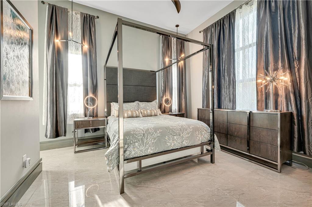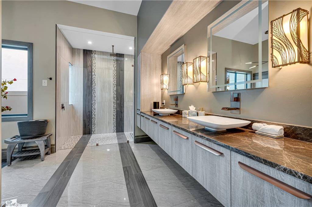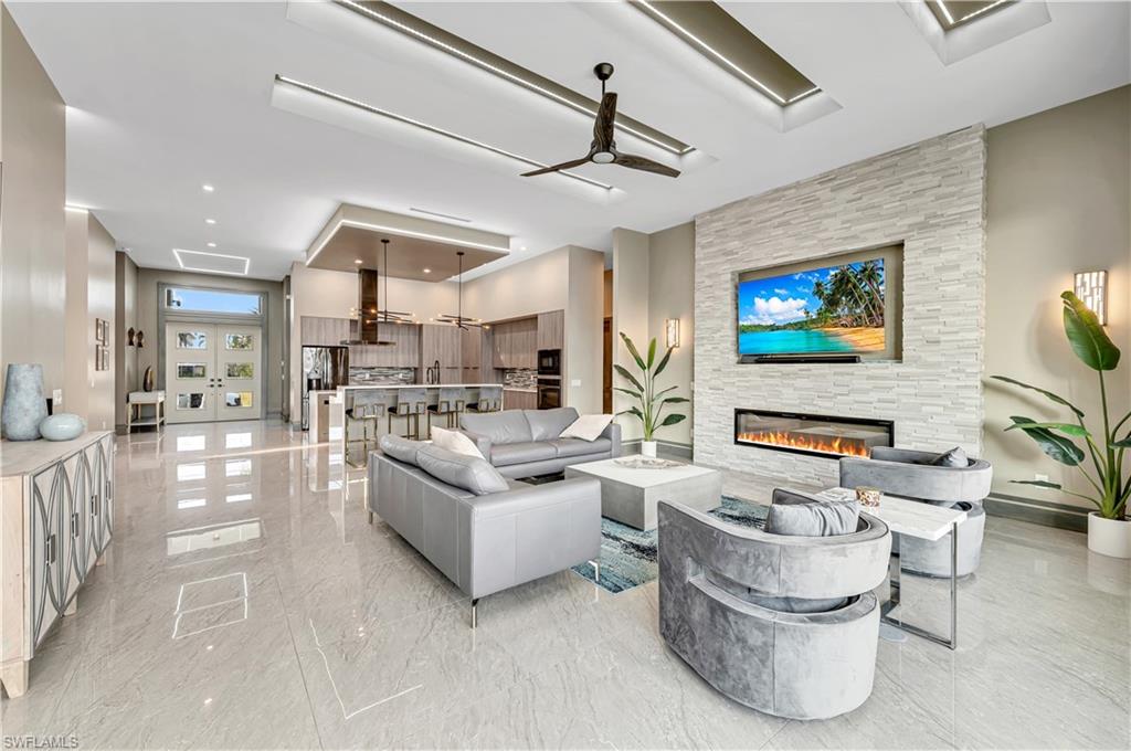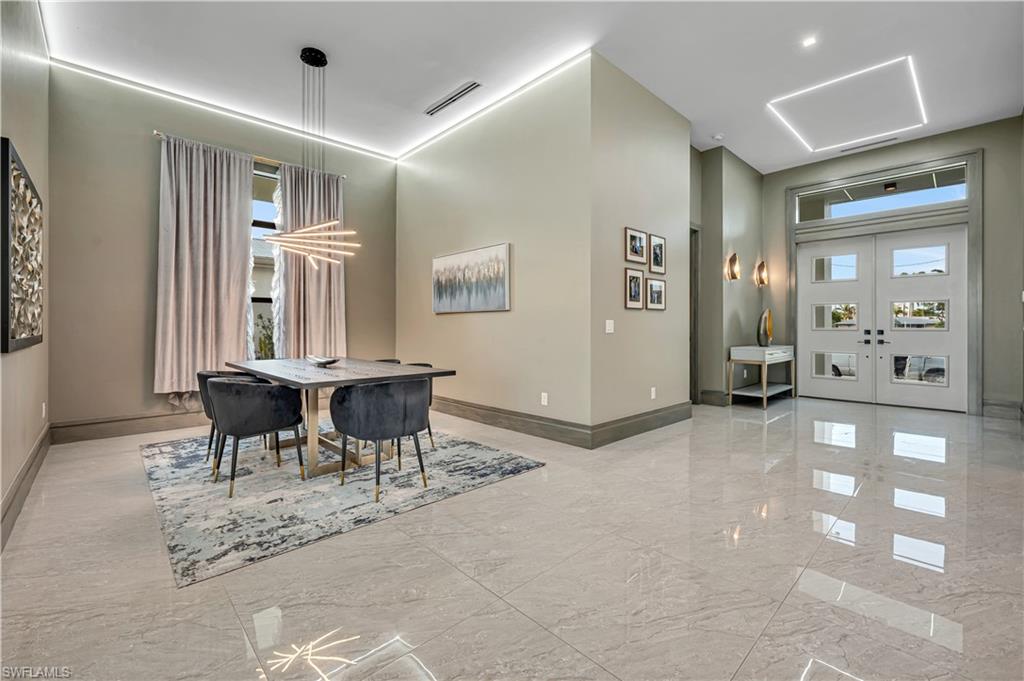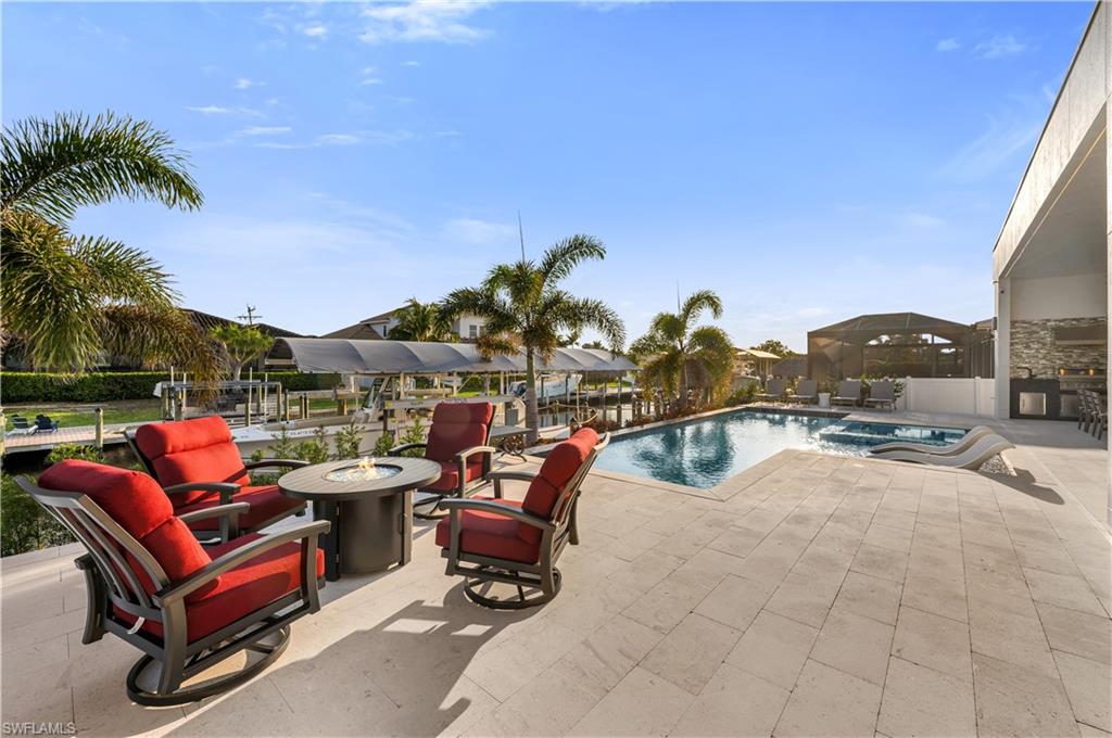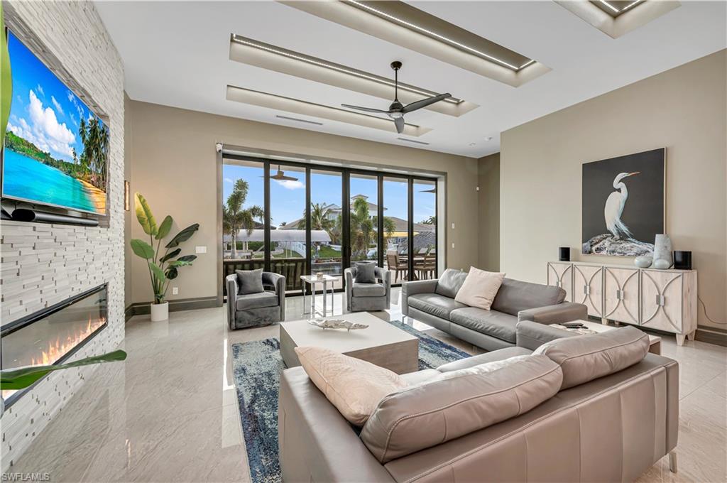 Nestled in the prestigious Yacht Club neighborhood, this 2021-built waterfront residence combines sleek modern design with the relaxed elegance of coastal living. With direct Gulf access and a private dock, it offers the ultimate lifestyle for boating enthusiasts and those who love the water. Step inside to soaring 13-foot coffered ceilings, walls of glass, and an open-concept floor plan that fills the home with natural light. The layout features 3 bedrooms plus a den, designed with both comfort and sophistication in mind. The primary suite is a serene retreat, showcasing sweeping water views, a sitting area, and a spa-like bath with floating vanities, a freestanding soaking tub, and a walk-in shower. Two guest suites open to a private decku2014an inviting spot to enjoy sunrise over the water. Indoor and outdoor living flow seamlessly together with pocketing glass doors leading to the expansive lanai. Outfitted with coffered ceilings, stylish lighting, and generous lounging and dining areas, this space frames the resort-style pool and spa beyond. Custom water features, a sun shelf, and lush tropical landscaping complete the private outdoor oasis. A newly built dock with boat lift makes heading out for a day on the water effortless, while the large dock area also doubles as an entertainment space perfect for evening cocktails or family gatherings. Highlights include:gourmet kitchen with dual waterfall islands, custom cabinetry & designer fixtures, resort-style pool & spa with water features and sun shelf, expansive lanai for dining & entertaining, southern exposure for year-round sunshine and stunning views, meticulous hardscape & landscaping for a polished tropical setting. This residence is more than a homeu2014itu2019s a statement of luxury, designed for those who want the very best in Cape Coral waterfront living.