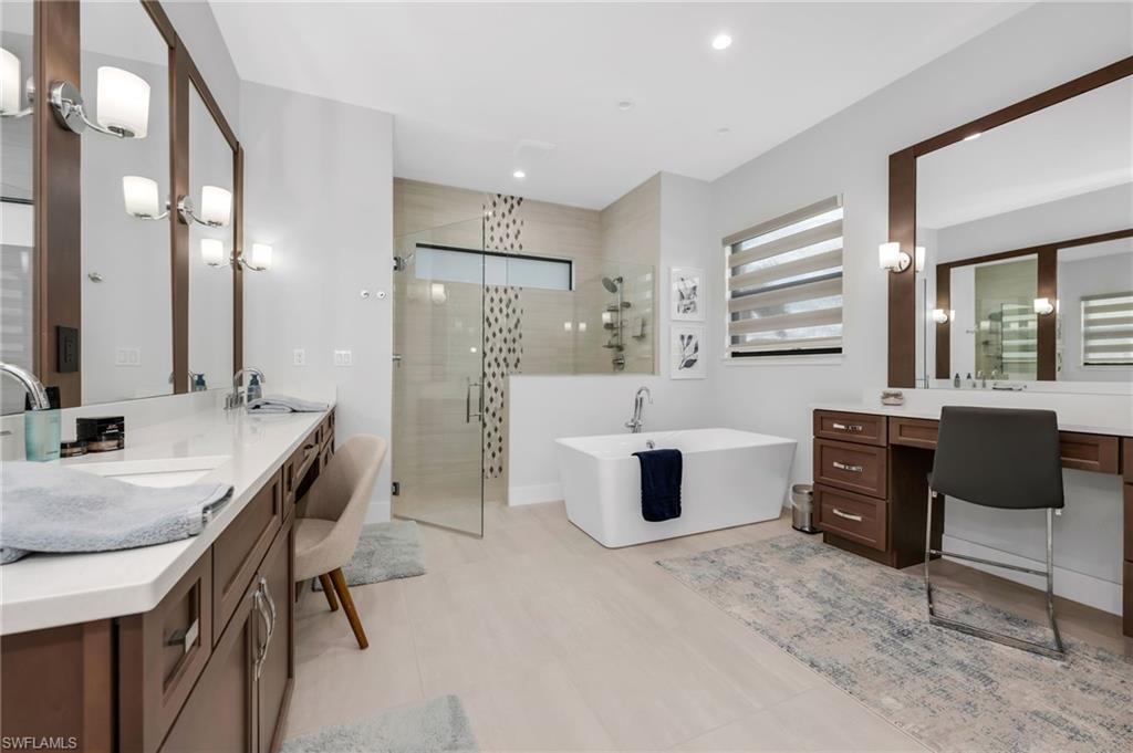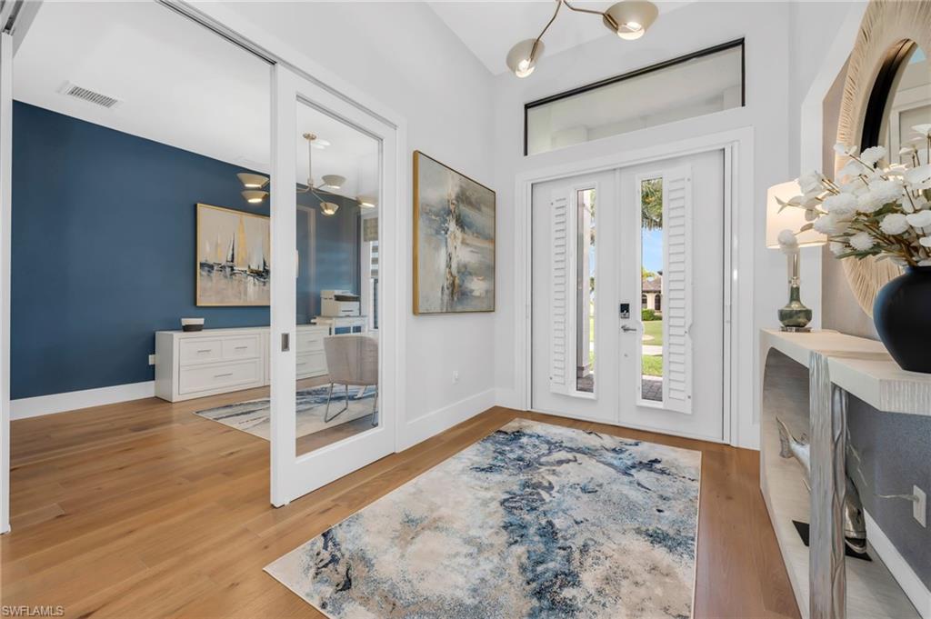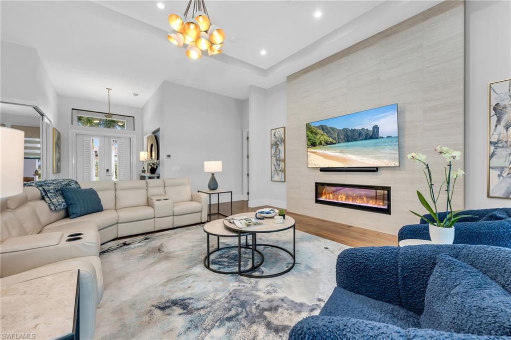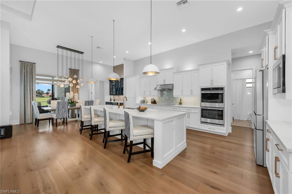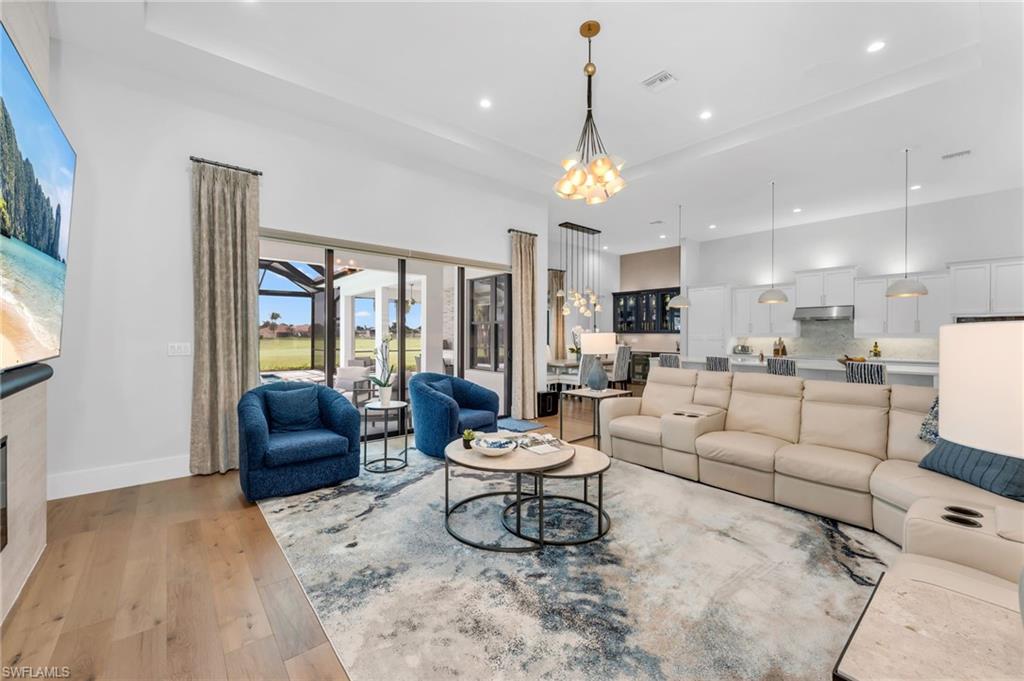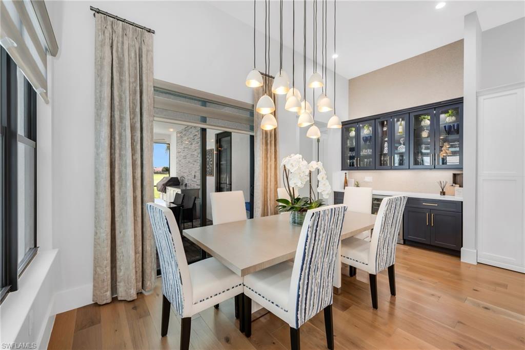 Located along the scenic Prince 3 fairway of the exclusive Cape Royal Golf Course, this elegant southern-exposure residence blends timeless design with modern comfort. Offering 3,000 sqft. of refined living space, the home features 4 bedrooms plus a den and 3 full baths, crafted with meticulous attention to detail throughout. The expansive 3-car garage with epoxy flooring, perfect for additional storage or a collectoru2019s vehicle. Inside, soaring 12-foot ceilings, 8-inch baseboards, and a seamless mix of hardwood and porcelain tile flooring set the stage for an open, inviting interior. The kitchen serves as the heart of the home, designed for both culinary inspiration and effortless entertaining. Highlights include Bosch appliances, a 36` induction cooktop, convection double ovens, Cambria quartz countertops, and an oversized island that anchors the space. A hidden walk-in pantry provides abundant storage, while a chic beverage bar with glass-front cabinetry and wine fridge extends the kitchenu2019s entertaining appeal.The primary suite is a private sanctuary with direct access to the lanai, a spacious custom walk-in closet, and a spa-inspired bath featuring dual vanities, a separate makeup area, soaking tub, and a grand walk-through shower with dual shower heads. Step outside to an entertaineru2019s dreamu2014an expansive pavered lanai overlooking the lush greens, complete with a heated saltwater pool and outdoor kitchen. Whether hosting guests or savoring a quiet sunset, the outdoor living space embodies the essence of Florida living. Cape Royal is a gated, luxury golf community offering championship fairways, super low HOA fees, and a serene atmosphere just minutes from Cape Coralu2019s best dining and amenities. Discover the perfect blend of sophistication, comfort, and resort-style livingu2014your private showing awaits.