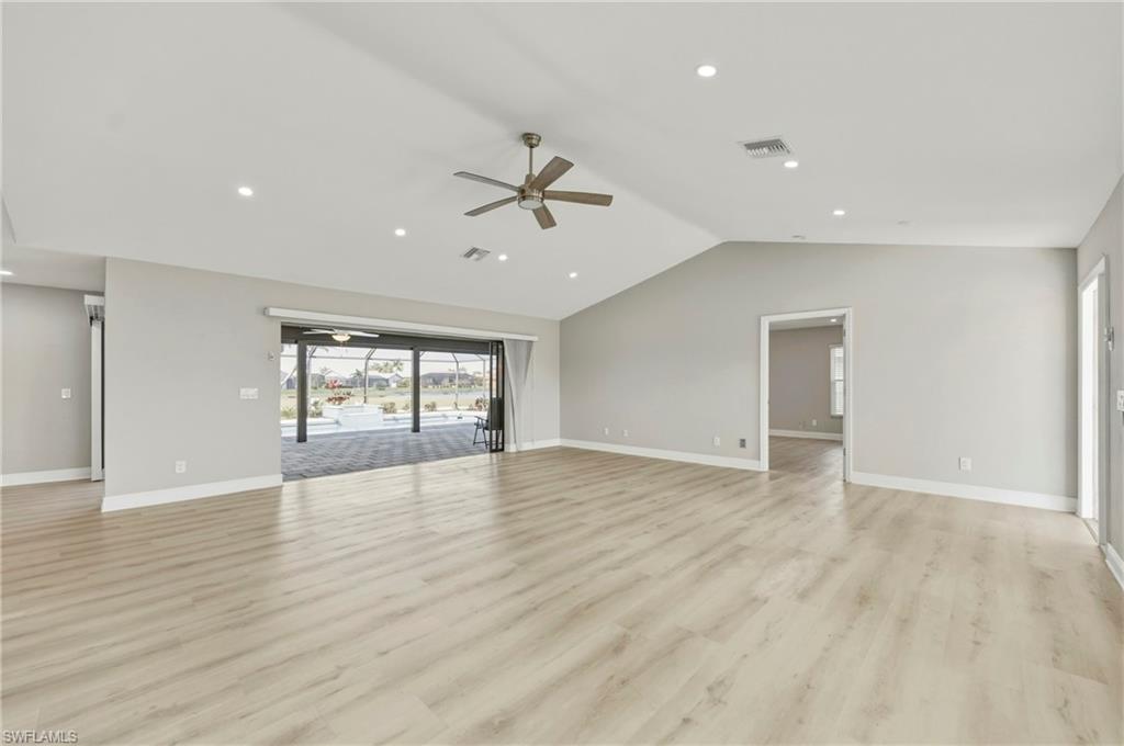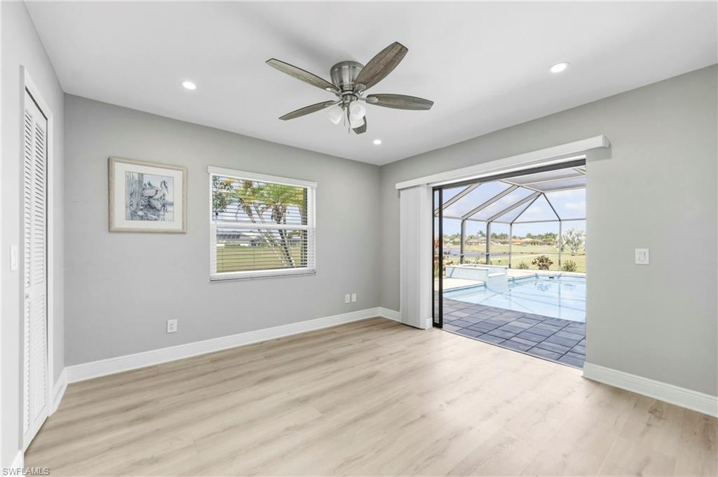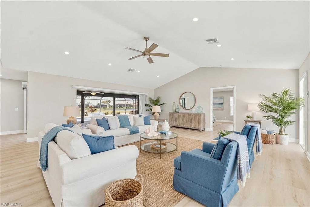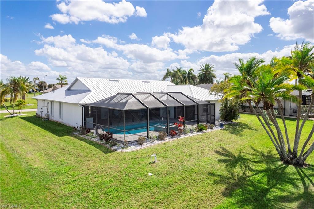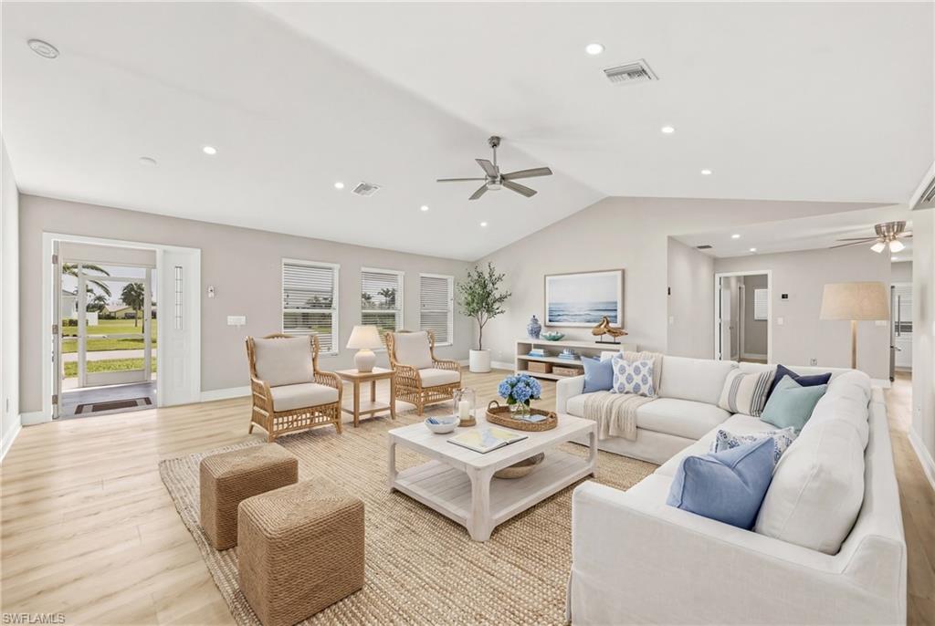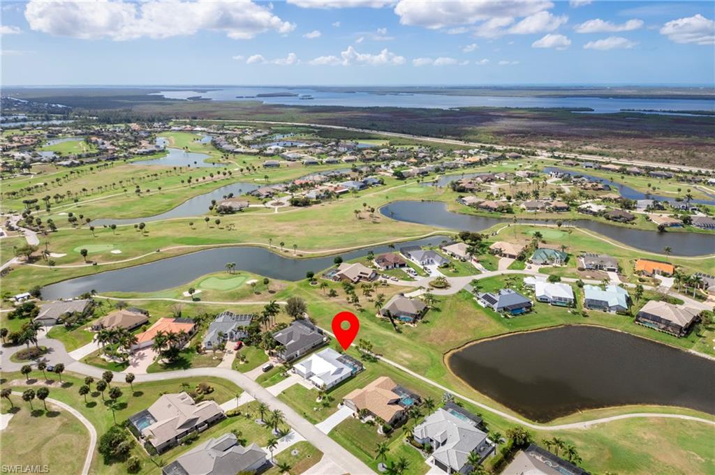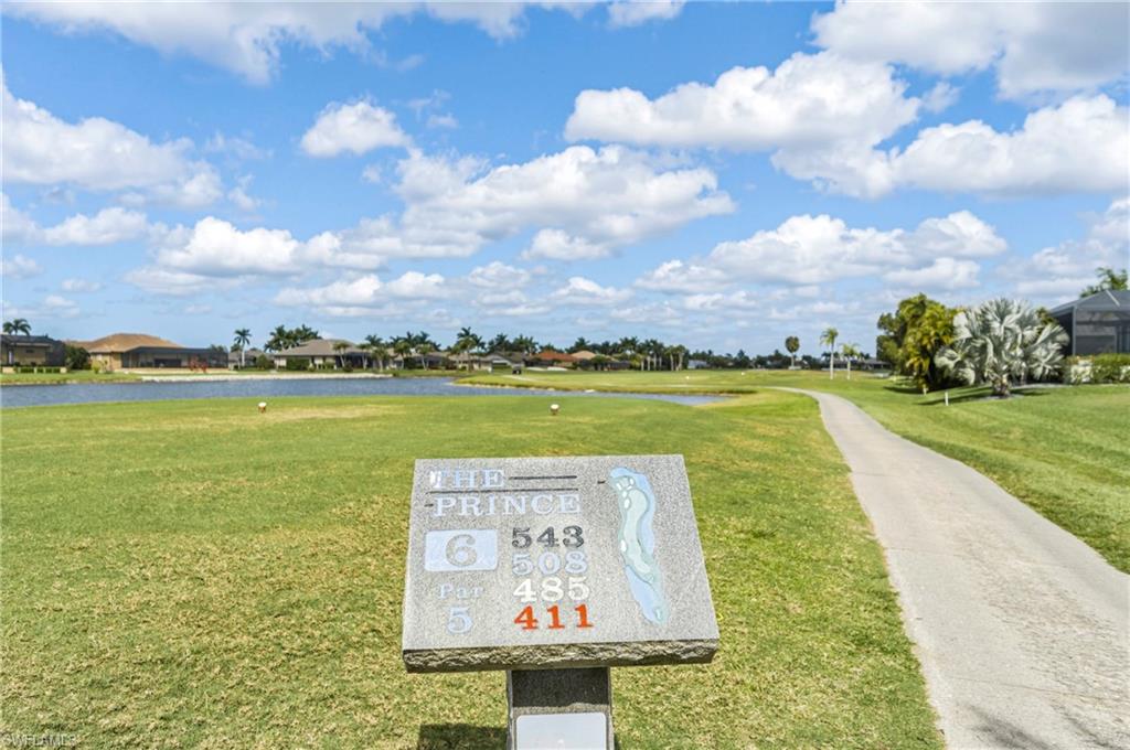 Wake up to sweeping golf course and water views in this beautifully maintained pool home located in the gated Cape Royal Golf Community. Perfectly positioned on a quiet cul-de-sac with no through traffic, this 3-bedroom, 2-bath residence overlooks the 6th tee box and captures some of the most peaceful scenery in the community.Designed to embrace the Southwest Florida lifestyle, the home features an open floor plan with multiple sliding glass doors that lead to the expansive screened lanai. The heated saltwater pool creates a spectacular outdoor living space where you can relax, entertain, and enjoy colorful Florida sunsets overlooking the fairway and lake.The spacious kitchen features quartz countertops and flows comfortably into the main living and dining areas, creating a bright and functional layout. A desirable split-bedroom floor plan provides privacy for guests, while the primary suite offers direct access to the lanai and pool area.Additional highlights include some hurricane-impact windows, remote-controlled hurricane shutters protecting the large lanai, and accordion/manual shutters for the remainder of the home for added storm protection and peace of mind. The home also features a newer HVAC system and updated pool equipment.Cape Royal offers a true country club lifestyle with 27 holes of championship golf set across more than 450 acres with scenic freshwater lakes, yet no mandatory golf membership. Residents enjoy a gated entrance, clubhouse, restaurant and bar, pro shop, pickleball courts, putting and chipping areas, and a short golf cart ride to community amenities. The low HOA fee includes cable and internet.Located in unincorporated Lee County along the Pine Island Corridor, this home benefits from city water service and county-only taxes, while remaining close to shopping, dining, and convenient access to Fort Myers and surrounding areas.Experience resort-style golf course living with spectacular views in one of Cape Coralu2019s most desirable gated communities.