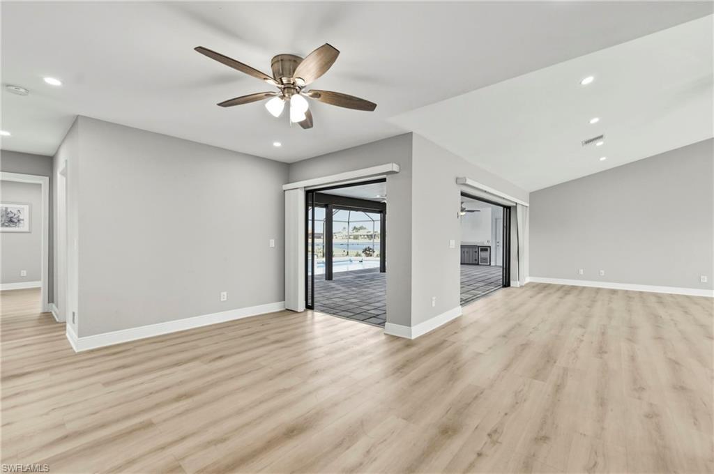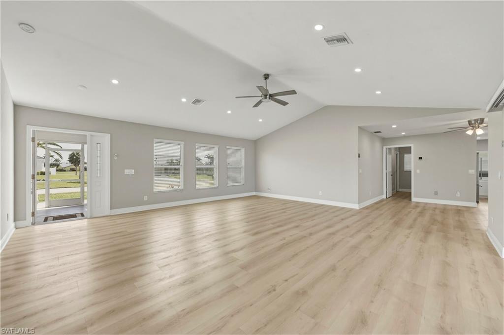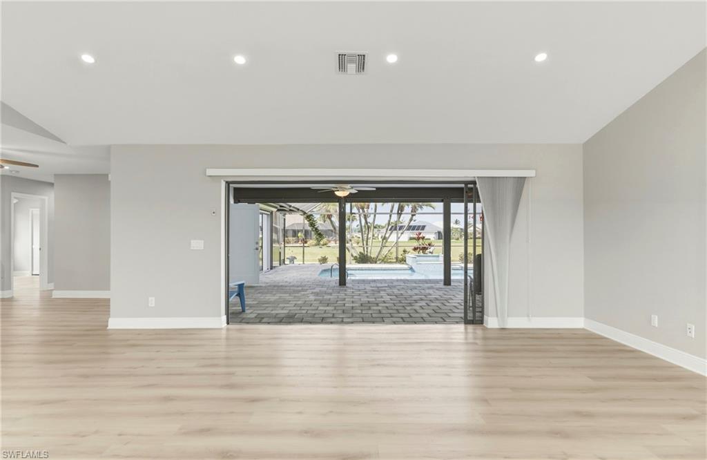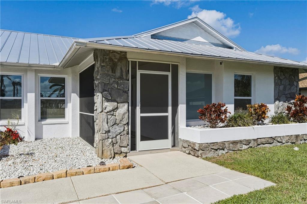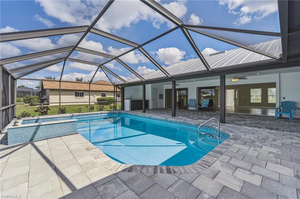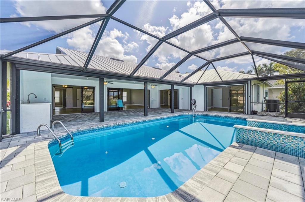 Wake up to sweeping golf course and water views in this beautifully maintained pool home located in the gated Cape Royal Golf Community. Perfectly positioned on a quiet cul-de-sac with no through traffic, this 3-bedroom, 2-bath residence overlooks the 6th tee box and captures some of the most peaceful scenery in the community.Designed to embrace the Southwest Florida lifestyle, the home features an open floor plan with multiple sliding glass doors that lead to the expansive screened lanai. The heated saltwater pool creates a spectacular outdoor living space where you can relax, entertain, and enjoy colorful Florida sunsets overlooking the fairway and lake.The spacious kitchen features quartz countertops and flows comfortably into the main living and dining areas, creating a bright and functional layout. A desirable split-bedroom floor plan provides privacy for guests, while the primary suite offers direct access to the lanai and pool area.Additional highlights include some hurricane-impact windows, remote-controlled hurricane shutters protecting the large lanai, and accordion/manual shutters for the remainder of the home for added storm protection and peace of mind. The home also features a newer HVAC system and updated pool equipment.Cape Royal offers a true country club lifestyle with 27 holes of championship golf set across more than 450 acres with scenic freshwater lakes, yet no mandatory golf membership. Residents enjoy a gated entrance, clubhouse, restaurant and bar, pro shop, pickleball courts, putting and chipping areas, and a short golf cart ride to community amenities. The low HOA fee includes cable and internet.Located in unincorporated Lee County along the Pine Island Corridor, this home benefits from city water service and county-only taxes, while remaining close to shopping, dining, and convenient access to Fort Myers and surrounding areas.Experience resort-style golf course living with spectacular views in one of Cape Coralu2019s most desirable gated communities.