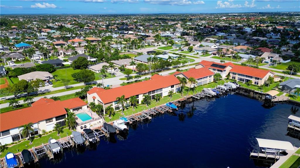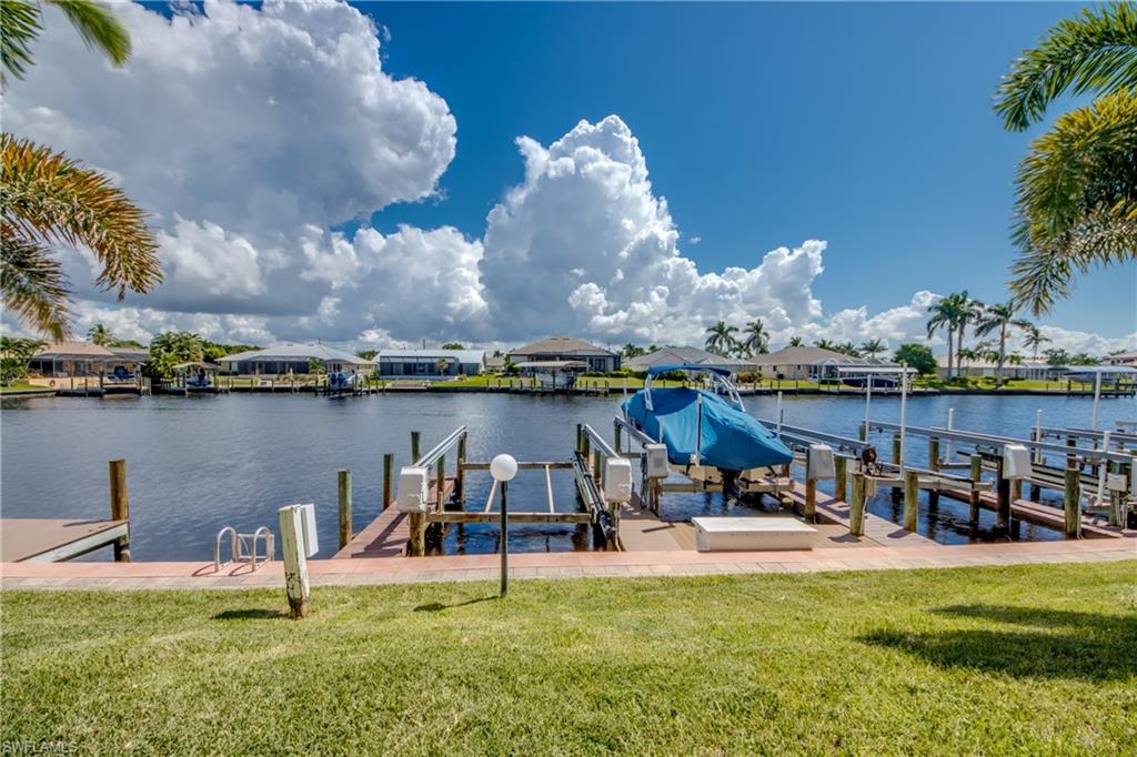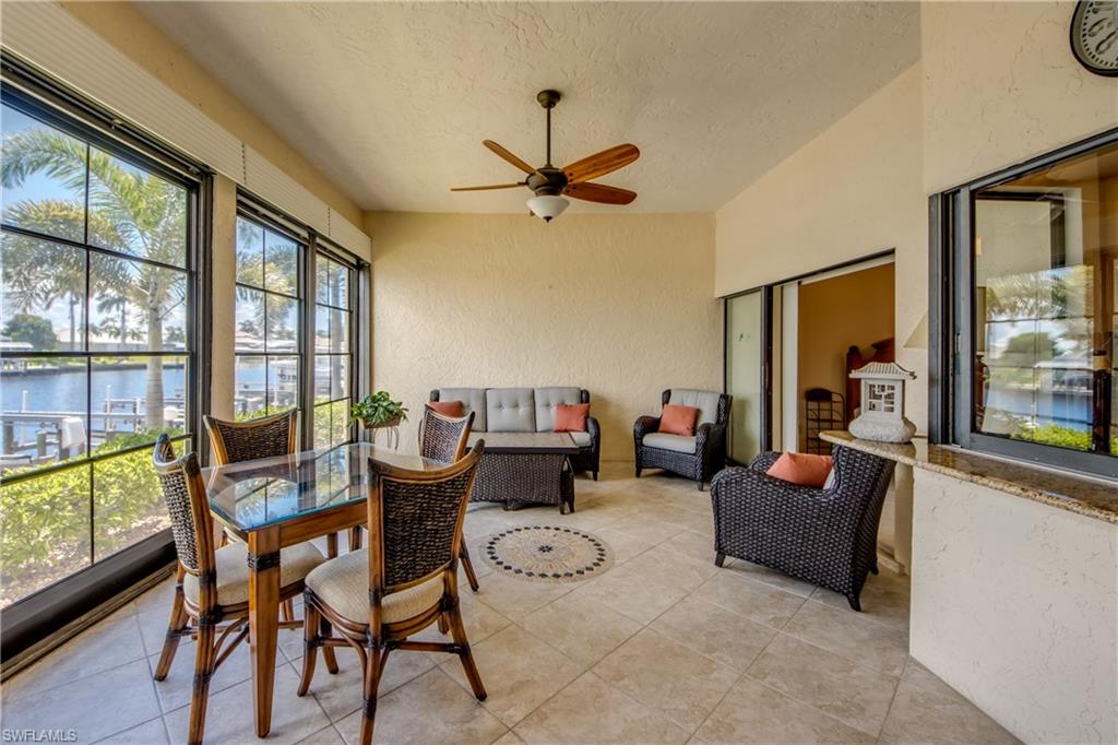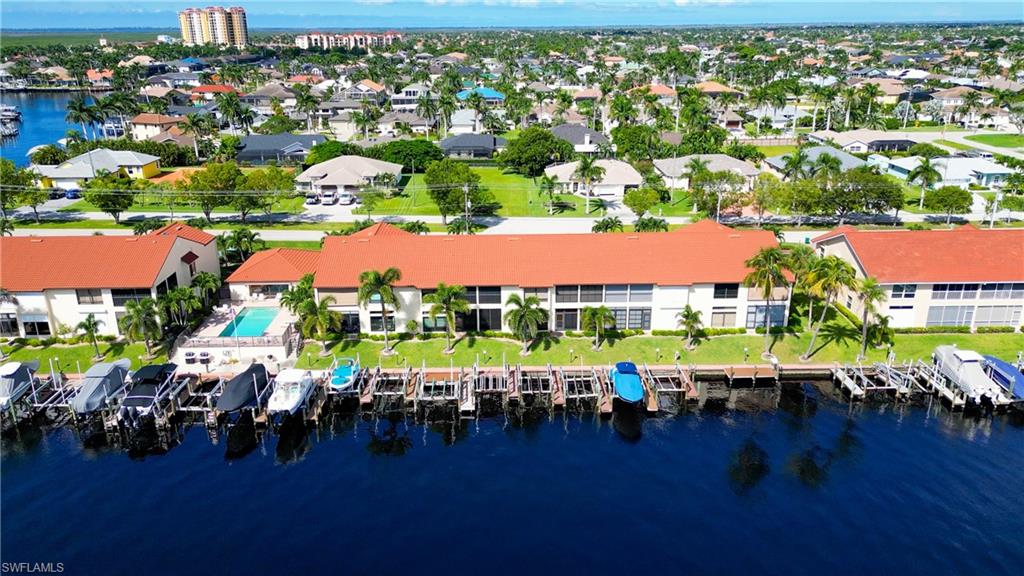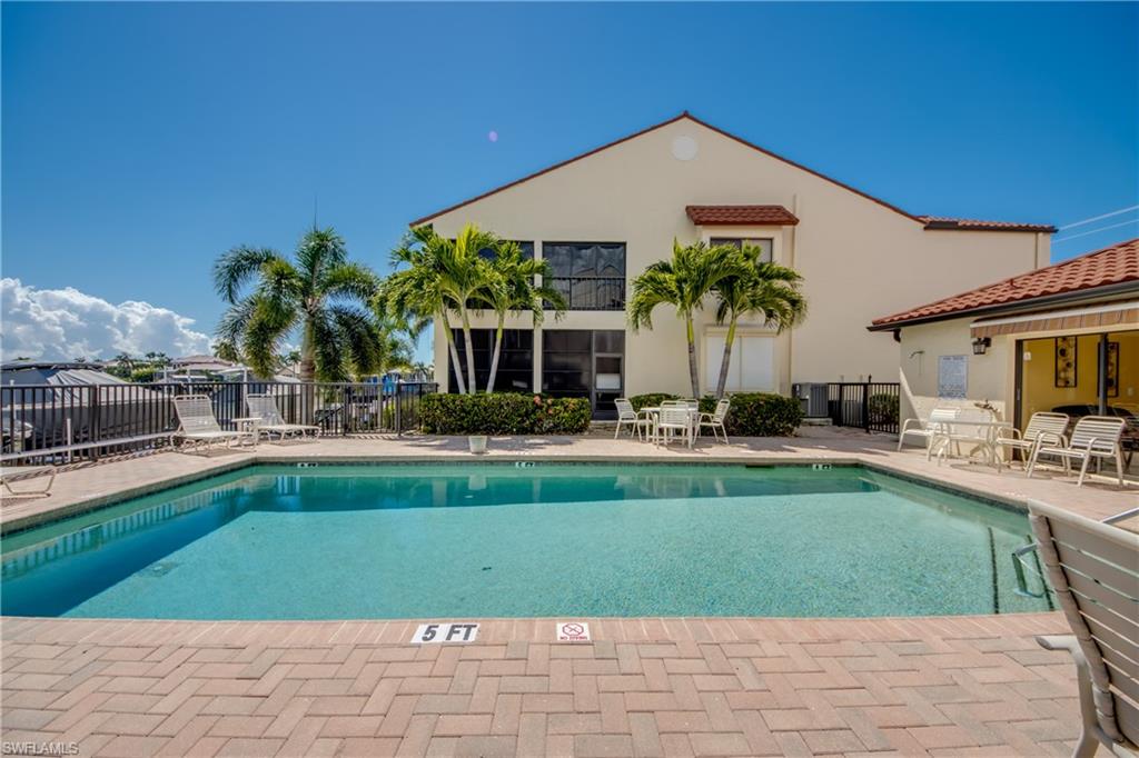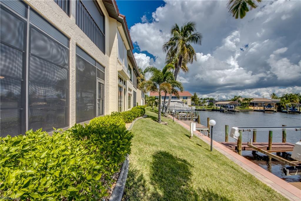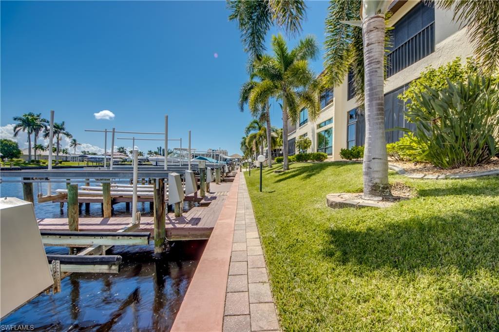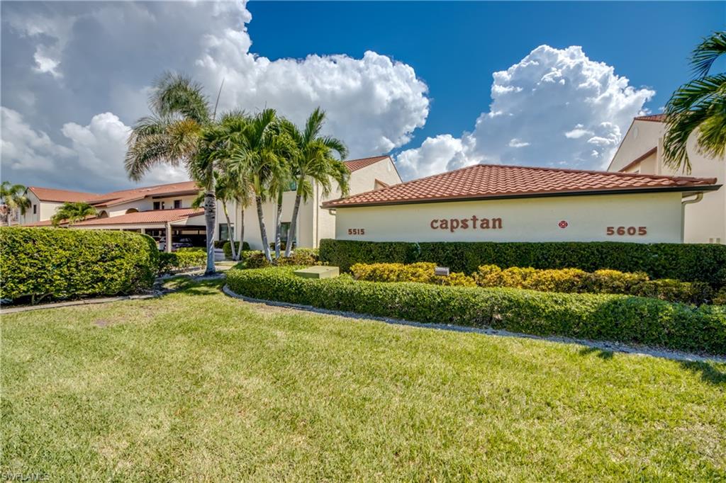 From dawn to dusk, THIS WATERFRONT living carries a TIMELESS CALMu2014mornings begin with sunrises and coffee on the lanai, afternoons drift by with a book you canu2019t put down, and evenings bring a cocktail before a leisurely cruise to dinner by boat. Life at Capstan Condos is all about the waterfront lifestyle on a stunning 200u2019 WIDE CANAL. Open the door to this spacious two-bedroom, two-bath retreat with covered parking and youu2019ll immediately notice what sets it apart. Soaring VOLUME CEILINGS and oversized windows flood the home with golden light, creating an airy, welcoming atmosphere that feels both grand and inviting. This isnu2019t your typical condou2014it was BUILT AHEADS OF ITS TIME, with a UNIQUE DESIGN that makes the kitchen the heart of the home while still giving privacy to both the guest suite and the master retreat. The kitchen is tastefully designed with 36u201d wood cabinets accented by glass doors, crown and rope molding, soft close pull out drawers, granite counters, backsplash and pantry. Entertain with ease as the pass-through opens to the lanai, so you never miss the conversationu2014or the view. The greatroom flows effortlessly to the oversized lanai, where pocketing sliders dissolve the boundary between indoors and out. The master suite is a peaceful retreat on the water, complete with walk-in closet and a spacious bath featuring dual granite vanities with soft-close features. Guests enjoy their own private space on the opposite side of the home, ensuring comfort and privacy. This condo comes with its own ASSIGNED BOAT DOCK AND 6K LB LIFT (and new dock boards) perched on the 200u2019 wide Bronco Canal just around the corner from TARPON POINT and CAPE HARBOR. With only one bridge out, youu2019ll be enjoying the Gulf of America in no time at all. Imagine days spent cruising to Sanibel and Captiva, stopping for lunch at waterfront restaurants, fishing off your dock or simply enjoying the sight of dolphins and manatee playing in your backyard. Dinner by boat isnu2019t just possibleu2014itu2019s YOUR NEW NORMAL. Peace of mind comes standard here!. The building has a BRAND-NEW ROOF, storm-ready doors and windows with a mix of ELECTRIC AND MANUAL ROLL DOWN SHUTTERS. NO water intrusion with any storm. Flood insurance wonu2019t keep you up at night, with a TRANSFERABLE POLICY at just $734/year (subject to insurance co. approval). Capstan is a 55+ community known for its BEAUTIFULLY MAINTAINED GROUNDS AND WELCOMING ATMOSPHERE. Residents enjoy a heated saltwater pool, clubhouse, BBQ area, fish cleaning station, exterior storage, covered carports and pavered parking lot. Tucked among million-dollar waterfront homes, the location is as desirable as it is convenientu2014close to shopping, dining, marinas and just minutes out to the Caloosahatchee River & beyond. This isnu2019t just a condo, itu2019s your well-earned escapeu2014sun-drenched mornings, barefoot boating afternoons and evenings where neighbors become friends and every sunrise feels like a celebration. SUNRISE TO SUNSET, PURE PARADISE!