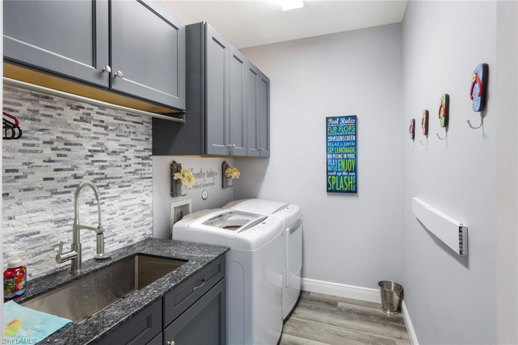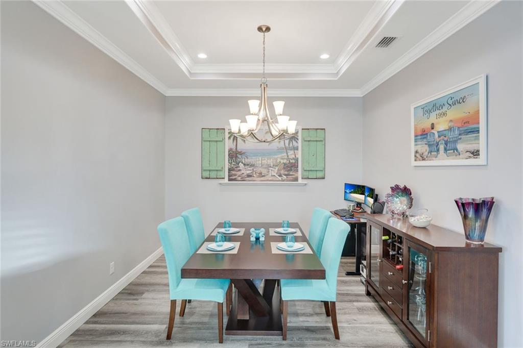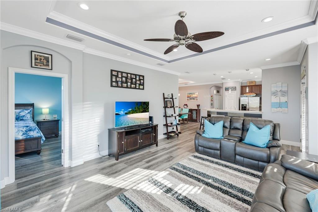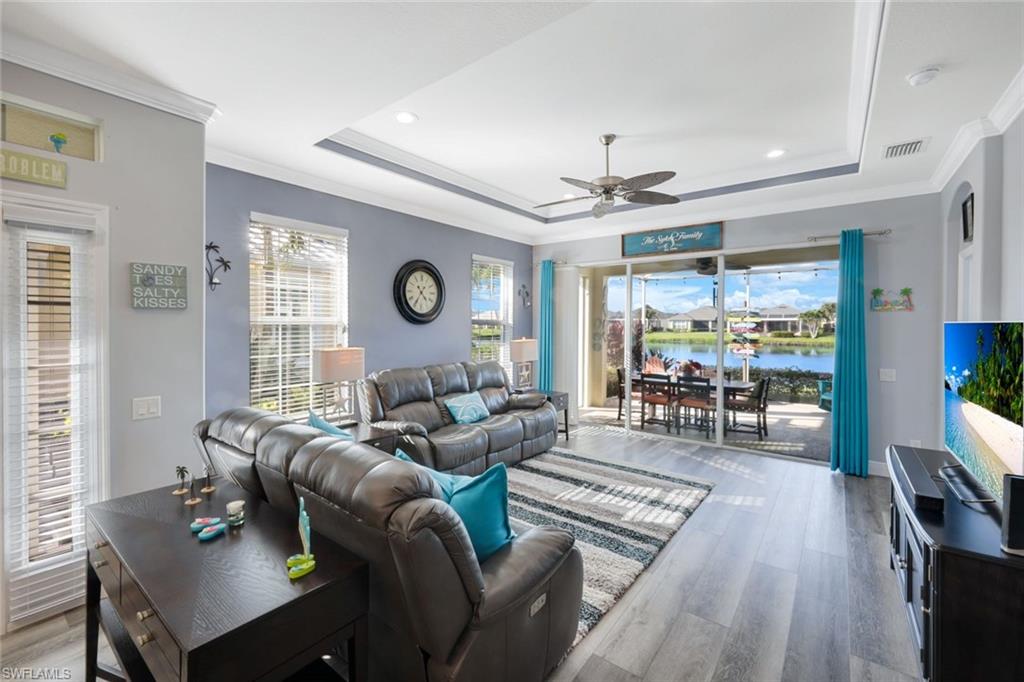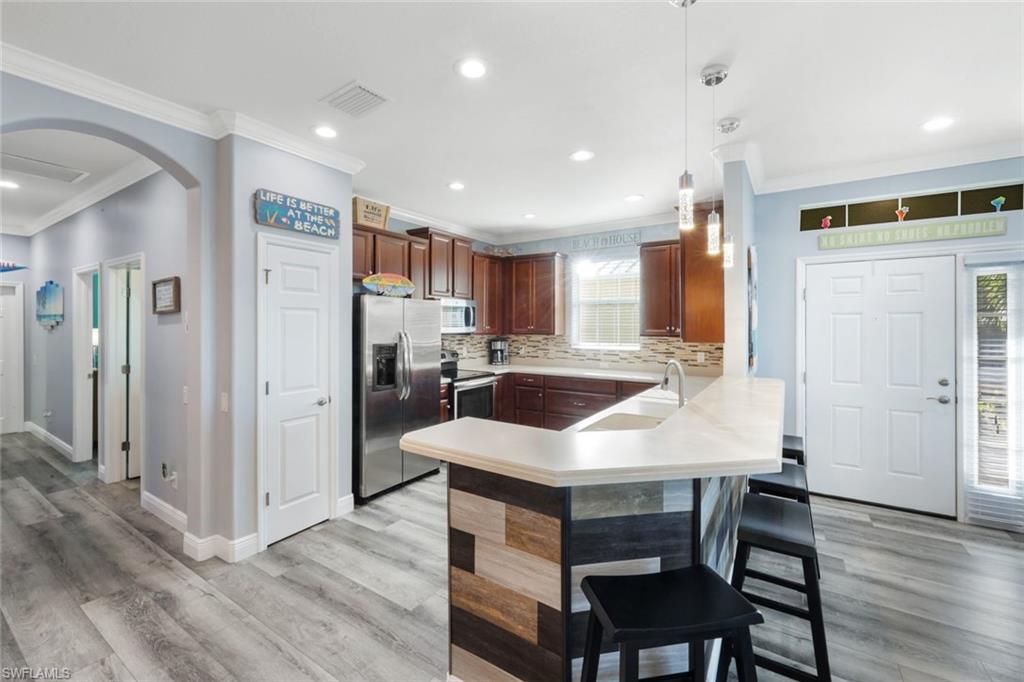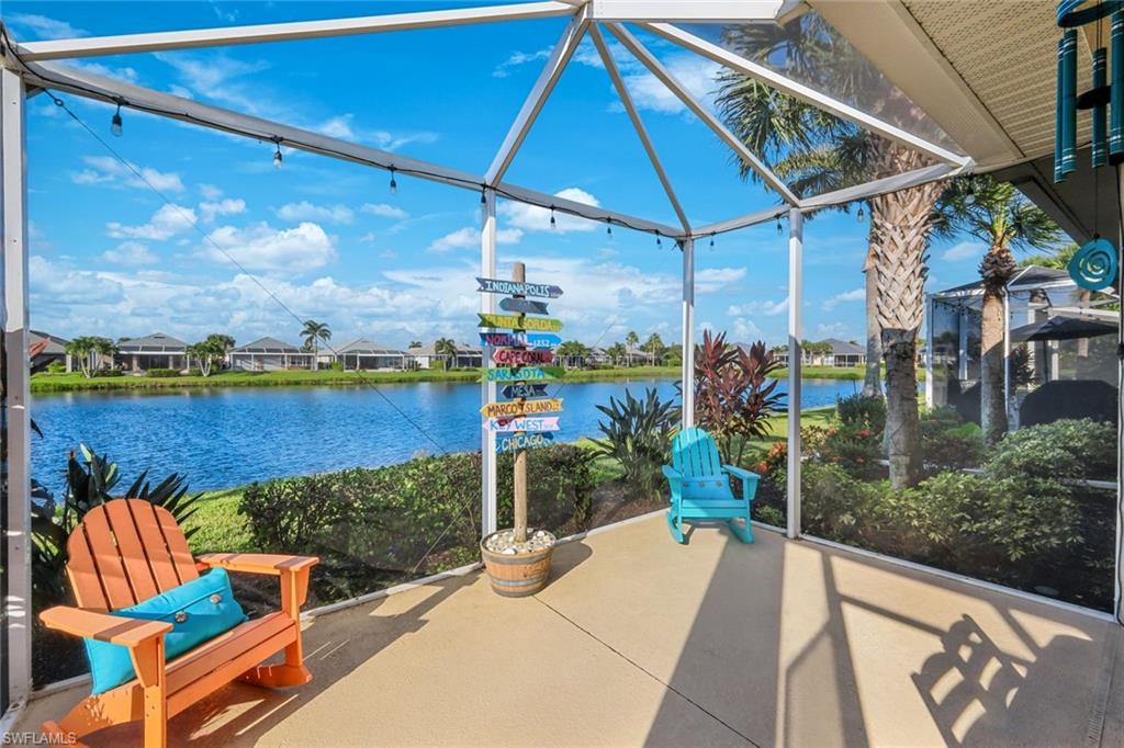 Lakefront Living in Sandoval u2014 Resort-Style Gated Community! Welcome to Anguilla Drive, where lakefront serenity meets elevated Florida living inside the prestigious, resort-style community of Sandoval. This beautifully upgraded 2-bedroom + den, 2-bathroom villa with a 2-car garage is designed for those who value both luxury and comfort in equal measure. Step inside to an open-concept floor plan enhanced by upgraded luxury vinyl flooring and crown molding throughout, exuding warmth and sophistication. The professionally painted interior and upgraded 5u00bd-inch baseboards create a crisp, modern aesthetic that complements every space. The gourmet kitchen features ample cabinetry, a custom pantry, and generous counter spaceu2014ideal for everyday meals or entertaining. The primary suite offers a private retreat with a custom-designed closet, dual vanities, and a spacious walk-in shower. Enjoy Florida living at its best with one of the largest, extended lanais on the twin villasu201410 feet longer than the builderu2019s extensionu2014perfect for hosting friends or savoring quiet mornings overlooking the tranquil lakefront view. Outside, a screened front entry, epoxy-coated garage floor, roof rack storage system, and extended brick paver walkway with decorative border add both convenience and style. Every detail has been thoughtfully curatedu2014from the custom storage upgrades to the seamless indoor-outdoor living designu2014creating a true move-in-ready home that feels as beautiful as it is functional. Nestled in one of Cape Coralu2019s most desirable gated communities, residents enjoy access to Sandovalu2019s world-class amenities, including a lagoon-style pool with waterslide, tennis and pickleball courts, dog parks, playgrounds, sand volleyball, basketball, and miles of scenic walking and biking trails. Perfectly located off Veterans Memorial Parkway, this home offers easy access to dining, shopping, top-rated schools, and Southwest Floridau2019s renowned beaches. Experience the ultimate in lakefront livingu2014schedule your private showing today and make this Sandoval gem your next home.