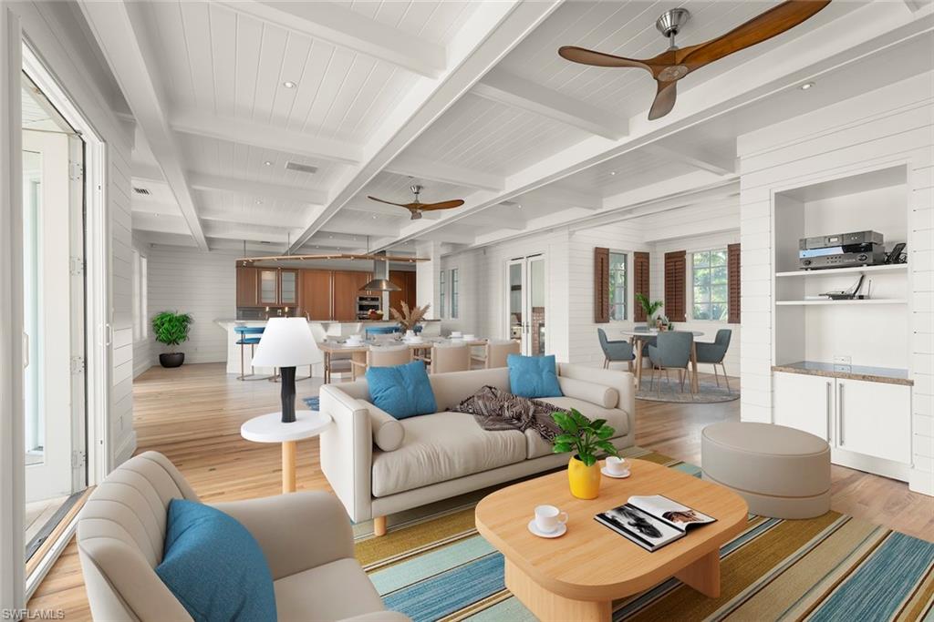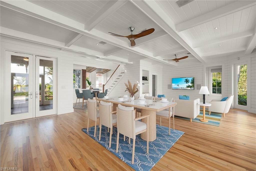 Far-A Way. Long admired as an iconic Captiva residence, this exceptional waterfront estate occupies a coveted position along the Platinum Coast, where timeless island architecture meets refined coastal living. Stretching from the Gulf to the Bay you can have it all! Resting on a high beach ridge with 10 ft of elevation and expertly landscaped by R.S. Walsh, the grounds feature vivid plantings and exceptional specimen trees sourced from around the globe, along with meanderingu00a0paths beautifully framing the home. Inside, an expansive great room is framed by a dramatic wall of French doors that capture serene water views and flood the space with natural light. The ceilings areu00a0 highlighted by exposed white beams and shiplap detailing create an atmosphere of refined coastal elegance, complemented by solid hardwood oak floors that ground the airy scale of the room. Designed for effortless entertaining, the open layout flows seamlessly to the pool and terrace beyond, blurring the boundaries between indoor and outdoor living. Sculptural wood-blade ceiling fans and crisp architectural millwork complete this exceptional island retreatu2014where craftsmanship, light, and lifestyle converge in perfect harmony. Chef's will admire the open and large finely appointed kitchen. The guest rooms are located on the main level along with the library, office and utility room. A striking lap pool runs elegantly alongside a covered patio, creating a resort-caliber outdoor experience designed for both relaxation and entertaining. At sunrise and sunset, the setting becomes truly breathtaking. Golden light washes across the residence as sweeping views extend over calm bay waters to the shimmering Gulf beyond. A private pier stretches gracefully into the water, inviting boating and sunset cruises, while layered tropical foliage frames the scene with natural elegance. As the sun slips below the horizon, the sky is painted in soft shades of amber, coral, and lavenderu2014gentle coastal breezes stirring the palms and reinforcing the timeless romance of bayfront living paired with spectacular Gulf sunsets.