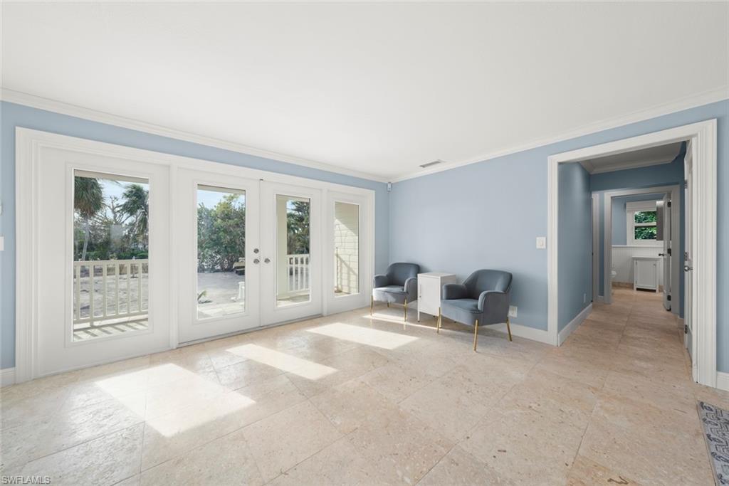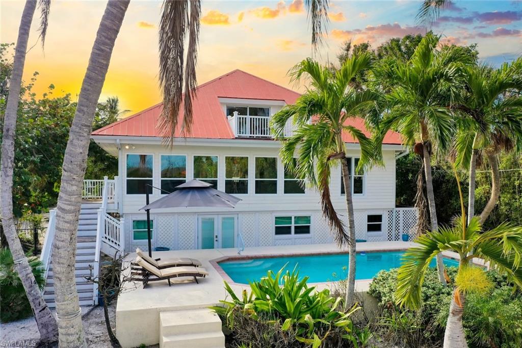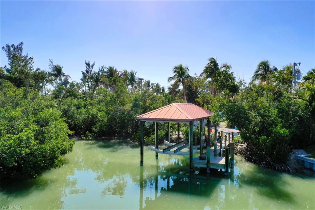Welcome to your Captiva Island oasis! This Gorgeous home is the perfect island get-a-way- situated on Roosevelt channel offering direct Gulf access from your private dock and a rare boathouse with 20,000lb. boat lift- the natural shoreline adds privacy and allows for a great kayak/SUP launch area. Just a short stroll to one of the best beaches and shelling locations! This 3 bedroom, 3 bath, pool home has Travertine floors throughout main living level and hardwood floors in the private, 2nd floor primary suite. The primary suite has vaulted/beamed ceiling & a private sunning deck w/water views. Primary bathroom has double sinks and custom glass tile. The kitchen has been completely renovated and cleverly designed to maximize storage and flow in the main living area, adding a custom island and space for a 60` range and hood, custom built-ins added in all bedroom closets, this home is light, bright and everything you want in an island home. After a day on the water, take a swim in the sparkling concrete elevated pool surrounded by lush tropical vegetation offering a feeling of seclusion and privacy. Newer Septic system, 2 a/c's 2022, washer & dryer 2025. Enjoy Island living, boating, fishing, shelling, sunning and stunning sunsets on Captiva Island. Property sold furnished, main living area and bedroom images are virtually staged adding accessories and artwork. Furniture is in place. 60` Range and hood in kitchen is virtually staged, propane tank installed and piped ready for range to be installed.
