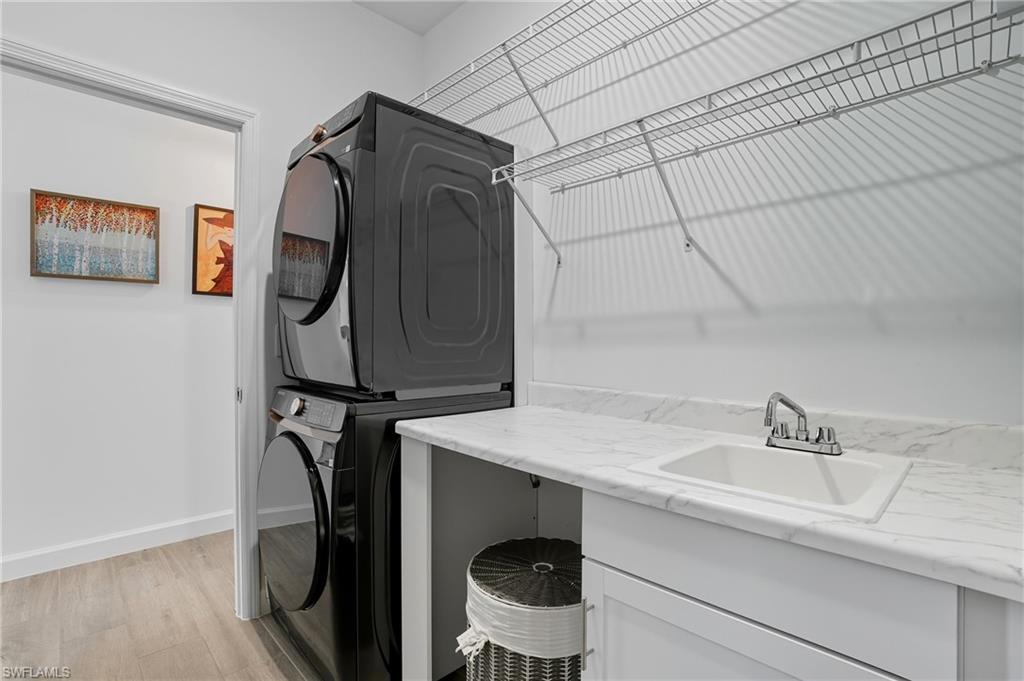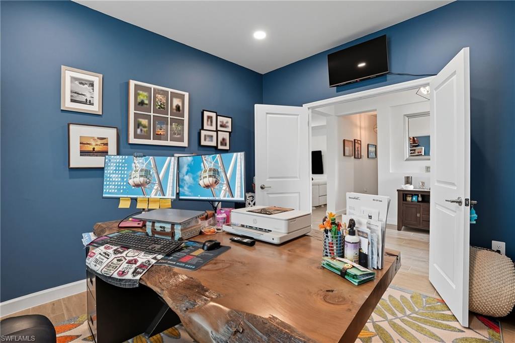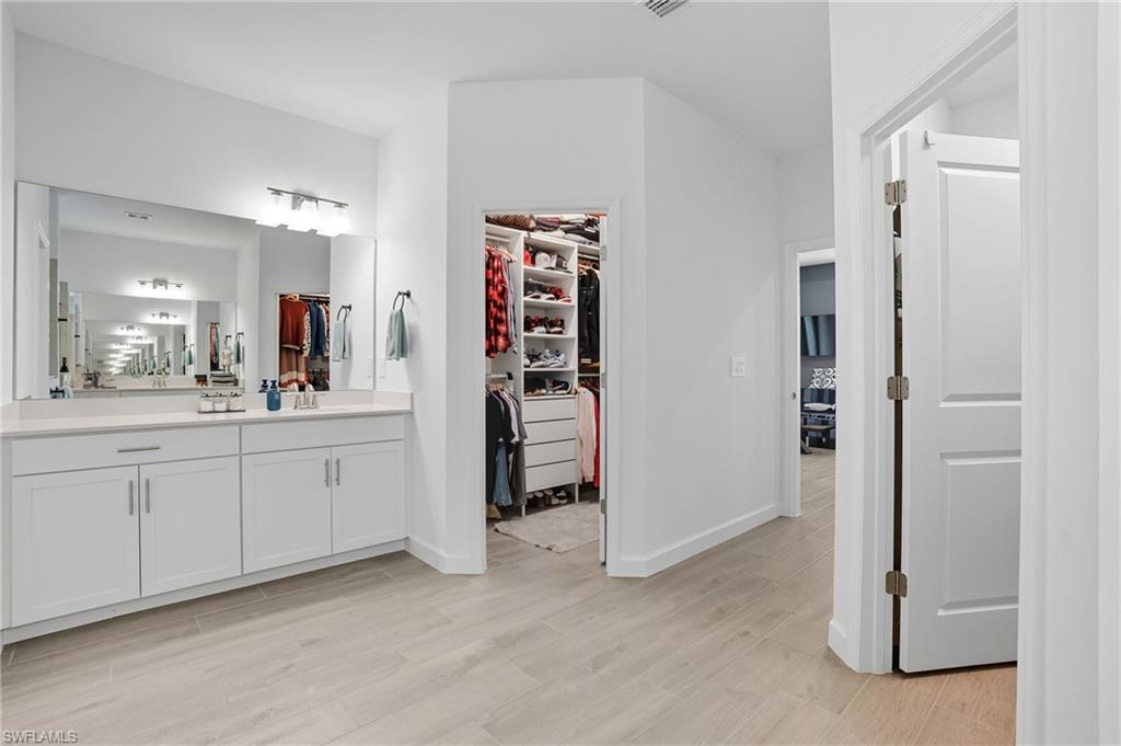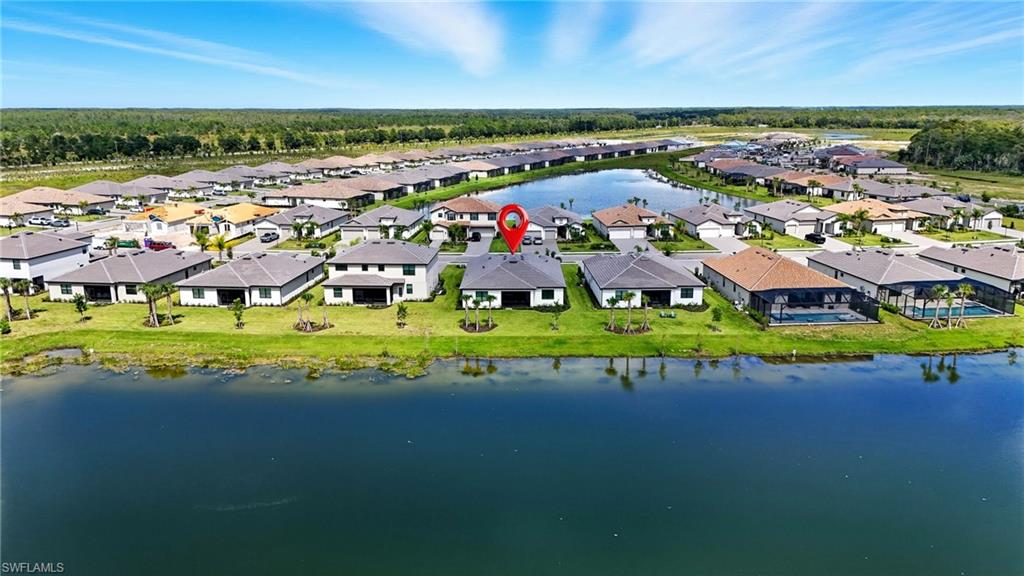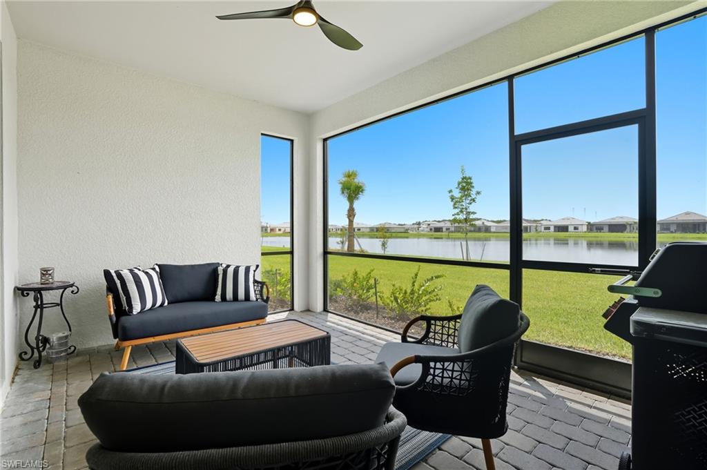 Stunning lakefront Summerville floor plan in Verdana Village featuring 3 bedrooms plus den, 3 full bathrooms, and a spacious 3-car garage. This open-concept home welcomes you with elegant double glass door entry and offers breathtaking western sunset views over one of the largest lakes in the community. Inside, you'll find thoughtful upgrades throughout, including a full gutter system around the entire roof, sealed driveway and lanai with two coats of paver seal, and custom built-in shelving in the primary closets. The laundry room is fully upgraded with a Samsung stacked washer and dryer, utility sink, countertop, and added shelving for storage. Recessed lighting with dimmer switches enhances the ambiance in all bedrooms and the living room, while wall outlets are pre-wired for mounted TVs in each bedroom and the main living area. The kitchen features a stylish backsplash, and the lanai includes a ceiling fan for added comfort. The garage is finished with epoxy flooring and wall-mounted shelving for optimal organization. This home is located in a natural gas community and includes a gas stove and oven as well as an on-demand tankless hot water heater for energy-efficient living.Living in Verdana Village means access to unmatched amenities for every lifestyle. Enjoy 4 indoor and 14 outdoor pickleball courts, 2 indoor and 6 outdoor tennis courts, and indoor sports facilities designed for players of all levels. Stay active in the state-of-the-art fitness center or unwind at the resort-style pool and poolside bar. On-site dining is available at the Drift Restaurant & Craft Lounge. The community also features a kidu2019s playground, dog park, and convenient golf cart access to nearby retail including Publix, Dunkinu2019, UPS Store, Fifth Third Bank, and New York Pizza & Pasta. All of this, just a short drive from Southwest Floridau2019s finest beaches, shopping, dining, and RSW International Airport. This is your opportunity to enjoy the Florida lifestyle in a move-in ready, beautifully upgraded home where every day feels like a vacation. Schedule your private showing today!