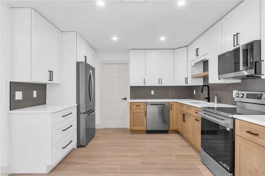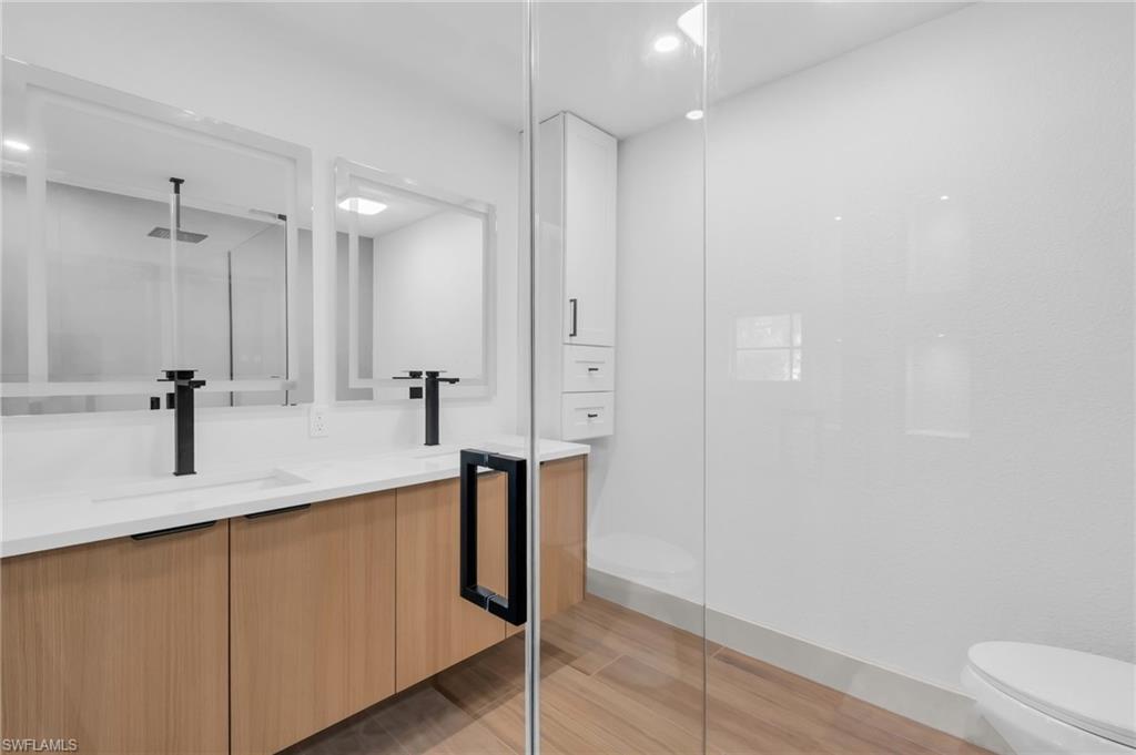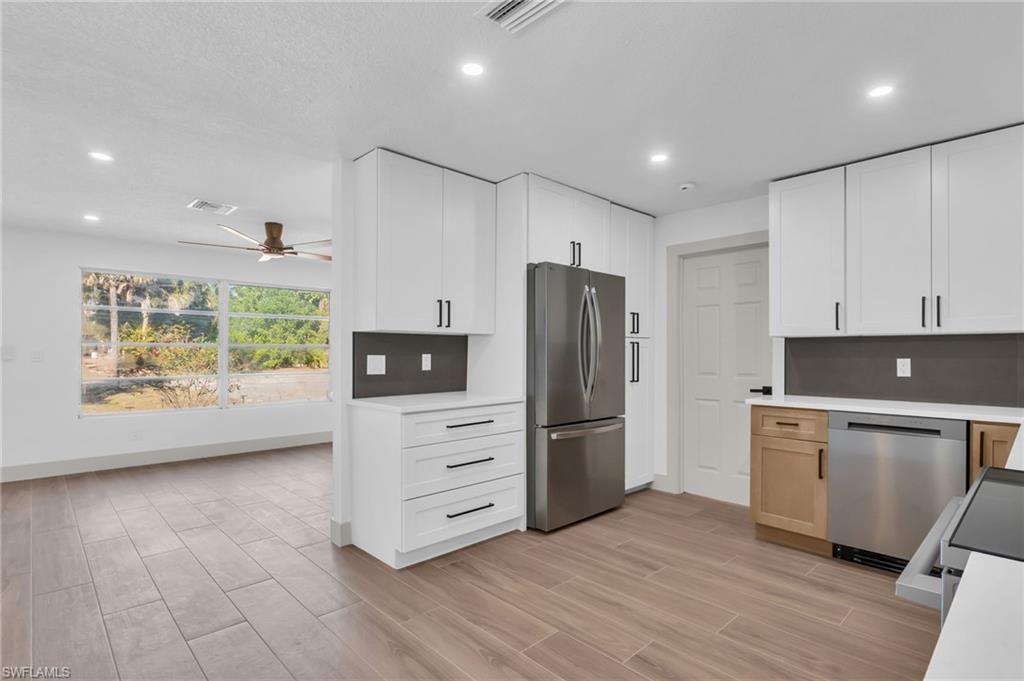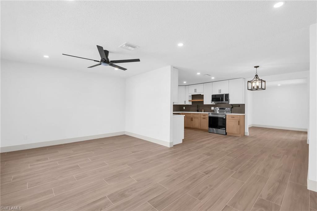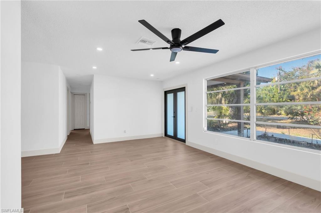 WELCOME to 2114 Davis. This Gorgeous, spacious, remodeled from top-to-bottom transformation in this stunning 4-bedroom + Den/Bonus, 2-bath home on a sprawling corner lot in Fort Myers Shores. Reimagined for absolute peace of mind, this property underwent a full professional renovation. Walk through the grand double front entry and feel the welcoming of home. Lead yourself into a showcase of luxury modern elegance, featuring seamless Italian porcelain tile floors accented by 5-inch premium wood baseboards throughout. A gourmet kitchen serves as the heart of the home, outfitted with solid wood cabinetry, quartz countertops, and a brand-new suite of LG appliances. Both bathrooms offer a spa-like retreat with European floating vanities, quartz counters, and showers with double shower heads.Structural and mechanical upgrades provide total fortification, including a newer roof (2023), all-new soffits, and gutters. New AC and handler with all-new ductwork for superior air quality. New Water Heater, New hurricane-impact front entry and garage doors. Automatic garage openers. Epoxy Garage Floors. Outside, the property is a botanical oasis with exotic landscaping illuminated by custom low-voltage lighting. Irrigation for all your plant needs. Best of all, enjoy the boating lifestyle without the waterfront price tag, as a Gulf-access boat ramp is located a few houses down the road. With no HOA, premium finishes, and `better-than-new` infrastructure, this is the premier turn-key offering in the Shores.