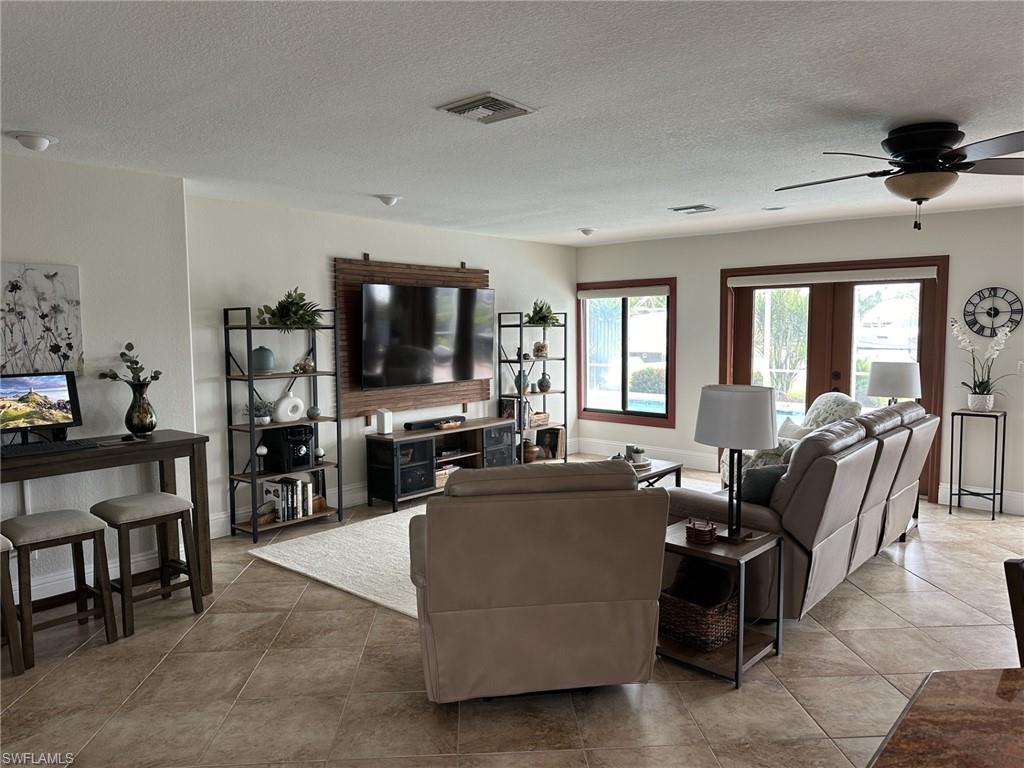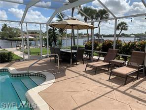 Enjoy this direct gulf access pool home with a spectacular Caloosahatchee Riverfront view. The spacious fenced yard on a double lot paired with a large screened-in pool area with lanai is perfect for entertaining, grilling out, and viewing the sunrise and sunset. This homey open concept floor plan brings together the living, dining and kitchen area. You'll love the gas-powered kitchen with incredible counter space where you can enjoy cooking with views of the pool and river. Live comfortably with three bedrooms complete with king, queen, and full sized beds as well as two bathrooms and a double car garage. Conveniently located just 8 minutes away from the Boathouse Tiki Bar & Grill and 20 minutes down the road from Downtown Fort Myers. Direct gulf access pool home, spectacular riverfront location with boat dock and boat lift. Large screened in pool, fenced yard.