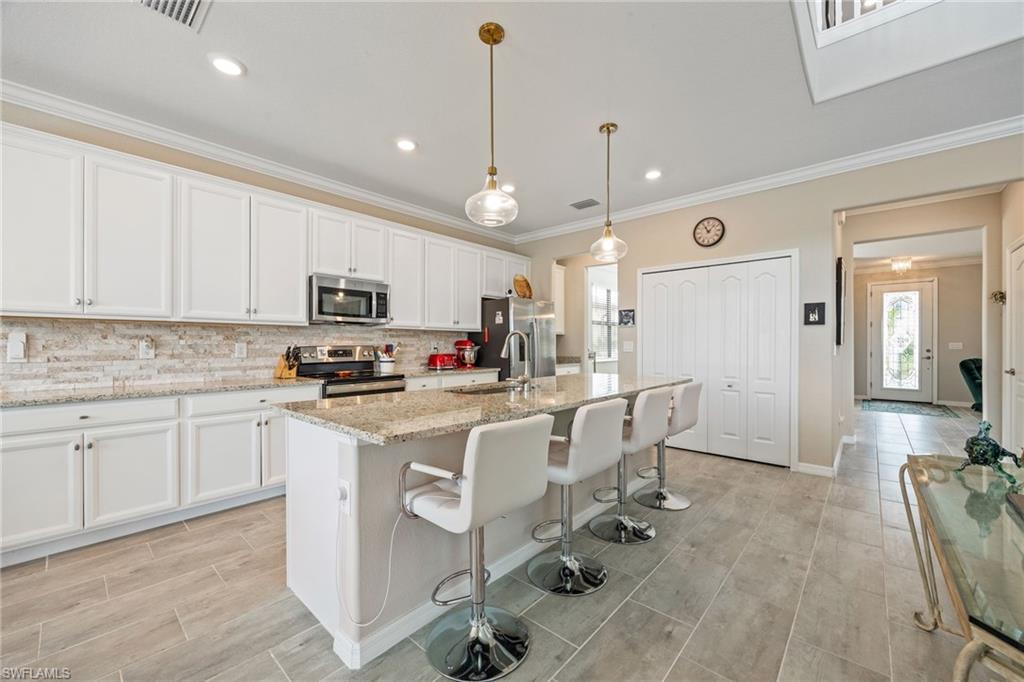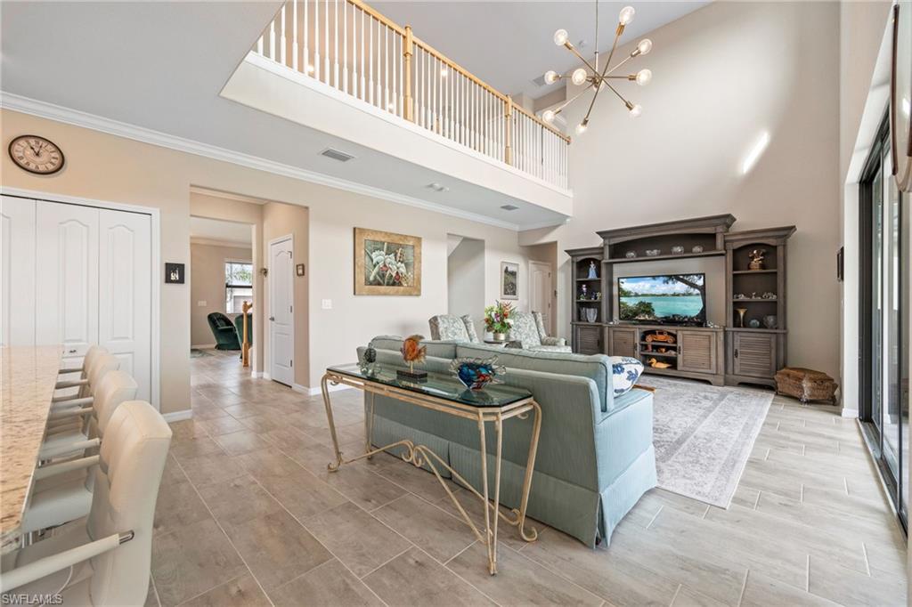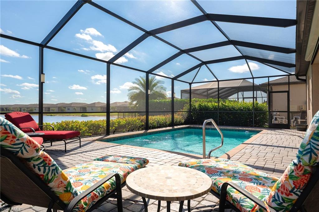 This is the kind of home that makes a statement the moment you walk in, and keeps impressing you every day you live there.Set on one of the most breathtaking long-lake lots in Portico, this expansive five-bedroom plus loft, four-and-a-half-bath pool home offers space, flexibility, and views that are truly hard to come by. From sunrise to sunset, the water becomes the backdrop to daily life, creating a calm, resort-like feel youu2019ll never get tired of.Built in 2021 and thoughtfully designed with everyday living in mind, this Sorrento floor plan is one of the largest and most sought-after in the community. The main level feels open and inviting, finished with beautiful wood-look tile throughout and accented by crown molding that adds a polished touch. The kitchen sits at the heart of the home, designed for both connection and function, with white cabinetry, granite countertops, stainless steel appliances, extended cabinetry in the dining area, and a wine cooler that makes entertaining effortless.One of the standout features is the full guest suite on the first floor, ideal for visiting family, multigenerational living, or a private retreat. The en-suite bathroom even offers direct access to the pool, making indoor-outdoor living feel seamless.Step outside and youu2019ll find a true lakefront escape. The oversized lanai, finished with custom pavers, overlooks the heated pool and wide water views, creating the perfect setting for relaxing, entertaining, or simply unwinding at the end of the day. Motorized hurricane-rated Kevlar screens provide storm protection, privacy, and shade year-round, so this space can be enjoyed in every season.Upstairs, the home continues to impress with four additional bedrooms and a spacious loft that easily adapts to your lifestyleu2014whether you need a second living area, home office, media room, or play space. Two HVAC systems keep the home comfortable and efficient, while thoughtful upgrades like epoxy garage floors, insulated garage doors, a whole-house water softener, gutters, enhanced landscaping, and designer lighting and ceiling fans add to the move-in-ready feel.This home was built with peace of mind at the forefront. Located in the X flood zone with no flood insurance required, and equipped with additional roll-down and accordion shutters along with impact-rated windows, itu2019s a storm-ready home you can feel confident in.Located in the gated community of Portico in the Buckingham area of Fort Myers, the neighborhood feels established and welcoming, with mature landscaping and beautifully maintained streets. Residents enjoy a clubhouse, oversized community pool with lap space, tennis and basketball courts, fitness room, and a childrenu2019s play areau2014all just minutes from shopping, dining, and everyday conveniences.If youu2019ve been waiting for a move-in-ready lakefront pool home with space to grow, stunning views, and one of the best layouts in Portico, this is it.