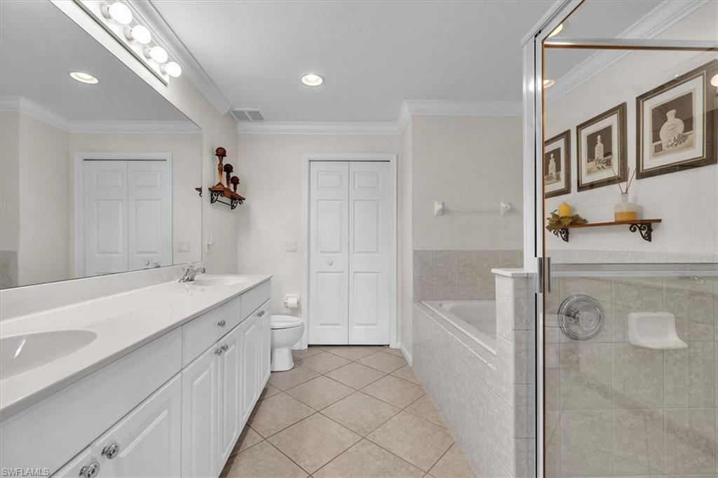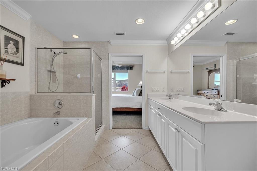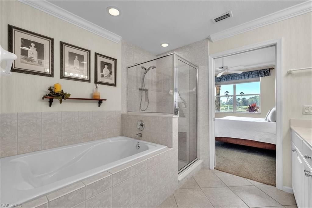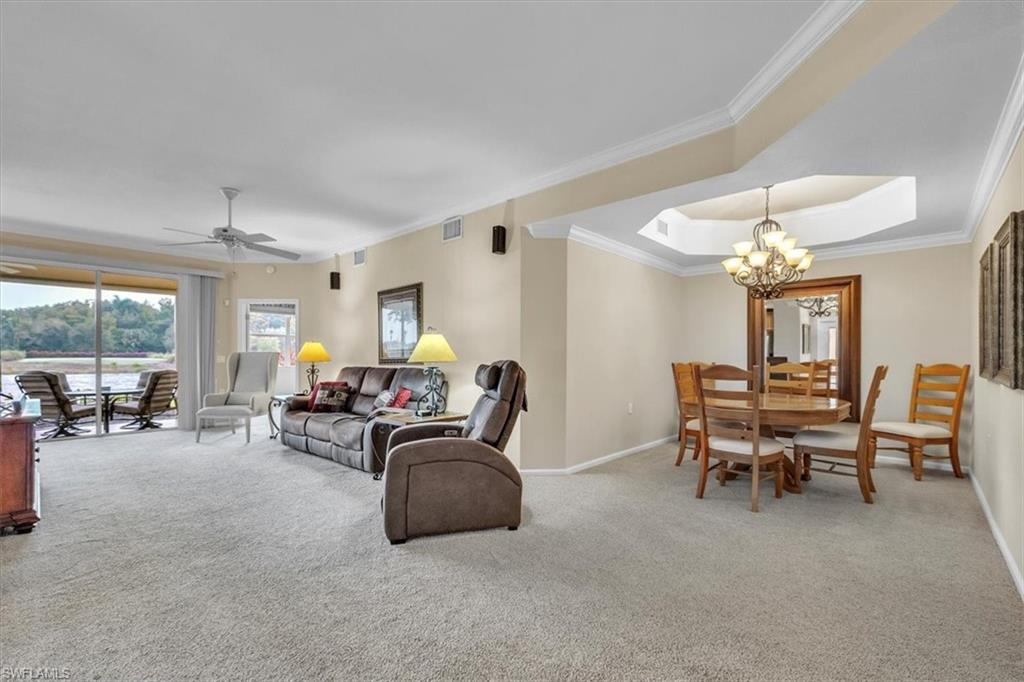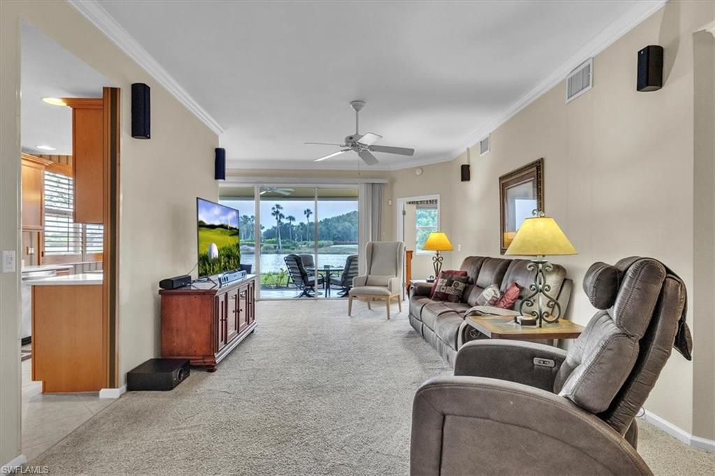 Great Opportunity to Own a First Floor Unit in the Gated Verandah Community in the Idlewild neighborhood. This exceptional coach home offers 1421 sq. ft. of living space and comes fully furnished. It boasts crown molding, a water softener for the entire condo, and has been freshly painted recently. With 2 bedrooms, a den, and 2 baths, this unit offers ample living space for residents. The panoramic super screened-in lanai features tile flooring and provides stunning views of hole #4 on the Jack Nicklaus designed golf course and a lake in the background. The two-car garage with epoxy floors adds convenience and luxury to the property. Upon entering the home, residents are greeted by a spacious family room and adjacent dining room with carpet and tile flooring. The kitchen is well-equipped with newer appliances, granite countertops, and plenty of cabinet space, including a nice pantry. The primary bedroom features a sleep number mattress, a large bathroom with dual sinks, a walk-in shower, and a large tub. The expansive den offers privacy with two French doors and is perfect for relaxation with leather recliners and wood flooring. The second bedroom and second bath provide ample space for guests or family members. Additional features of the home include a newer washer and dryer and AC unit. Residents can enjoy evening sunsets from the eastern exposure and spacious lanai while entertaining friends and family. Idlewild offers residents a separate community pool, fitness area, and community room. As a member of the Verandah Club, residents have access to 2 championship golf courses designed by Jack Nicklaus and Bob Cupp, a tennis facility, state-of-the-art fitness facility, resort-style pool, pickleball, walking and jogging paths, kayaks, playground, dog park, multiple restaurants, and an active calendar of events. Don't miss out on the opportunity to own your own piece of paradise in the Verandah community in Idlewild.