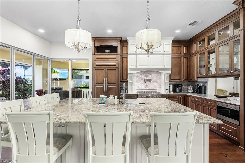 Discover refined country club living at 3220 Cypress Marsh Dr, a custom Wyman Stokes masterpiece nestled in the gated Verandah community. This inviting 3-bedroom + den home is being offered turn-key furnished with high-end furnishings, boasting 3 full baths with ensuite access for guests, an oversized side-load 2-car garage, and a chef's dream kitchen remodeled in 2019 featuring a massive island with seating for six, 6-burner gas range with pot filler, vented hood, wine cooler, and beverage fridgeu2014all flowing seamlessly into the family room with its vaulted wood ceiling. Hardwood floors grace the living and dining areas, complemented by plantation shutters, crown molding, tray ceilings, and recent updates including a new roof (2023), fresh interior/exterior paint (2024), and new wood floors. Step outside to your private oasis: a heated saltwater pool and spa, expansive covered lanai with paver surfaces and hurricane screens, and one of Verandah's most breathtaking lake-and-preserve views offering unparalleled privacy and world-class birdwatching. Verandah's mandatory social membership unlocks a vibrant lifestyle with two 18-hole championship golf courses designed by Jack Nicklaus and Bob Cupp (full golf membership optional), five clay tennis courts, pickleball and bocce courts, a resort-style community pool with lap lanes, and a state-of-the-art fitness center offering yoga, spin, and water aerobics classes. Explore over nine miles of scenic trails and boardwalks, kayak on the adjacent Orange River, or enjoy the dog park and playground. Savor dining at the River House Bar & Grill or Blossoms on the Orange River, all within a secure, patrolled community with two gatehouses, conveniently located just 12 minutes from downtown Fort Myers, 10 minutes to Walmart/Target, 20 minutes to the airport, and 4 minutes to Boathouse 31 and the marina.