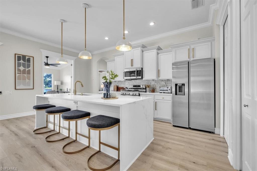 Rare opportunity to own a renovated 4 Bedroom, 3 Bath home with a flex den/office/nook area with almost 2000 sq. ft. of living space. Situated in the mature and desirable Shady Bend neighborhood within the gated and popular Verandah Community, this property is one of the best deals in the Community. As you enter the home you are immediately drawn to the open feeling in the family room, kitchen area with spectacular views of the Lake. The kitchen is a chef's dream, boasting quartz countertops, attractive backsplash, newer appliances, a large waterfall island, white cabinetry and a sizable pantry. The home also features new flooring throughout, crown molding, upgraded lighting and a free-standing bar with a wine fridge. All bathrooms have been renovated as well and feature fogless custom mirrors with walk in showers in two bathrooms. Bedrooms are spacious and brightly lit with split bedrooms for added privacy when guests visit. A den/office/game/nook area is adjacent to the kitchen for multiple uses and provides a great view of the lake behind the home. Add to this an oversized garage. laundry with sink and storage cabinets, a semi circular driveway and mature landscaping and you have it all. The outdoor area has plenty of room to build a sizable pool and cage and features an eastern exposure which allows for quiet relaxation in the evenings from the sun. You also can enjoy the beautiful lake view from your lanai. Verandah is an active gated community with amenities to meet everyone's needs. It includes 2 Championship golf course designed by Jack Nicklaus and Bob Cupp, Tennis, Pickleball, State of the art Fitness center, Bocce, a resort-style pool, multiple restaurants, a dog park, a playground, 9 miles of biking and walking paths, and a lively social calendar. Why settle for new when you can have a fully renovated Arthur Rutenberg home that feels almost brand new? This property is a must-see for those seeking luxury living in a vibrant community. Come secure your place in Paradise now!