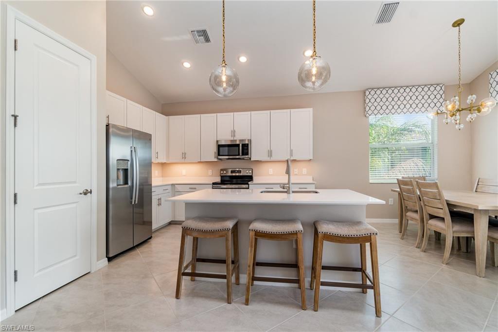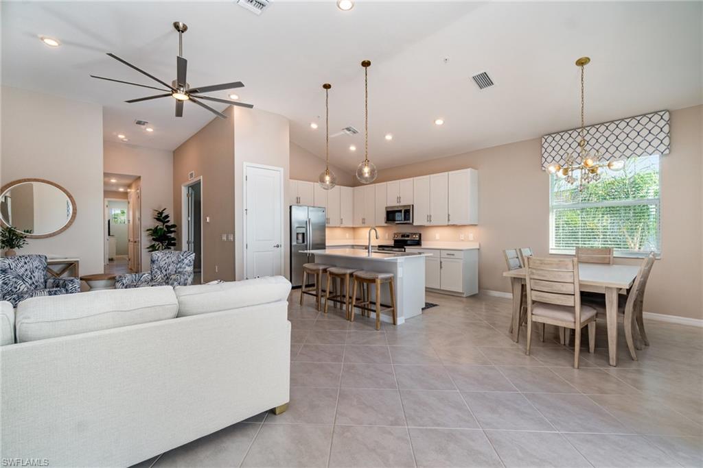 Welcome to Pebblebrook in Verandah, one of Fort Myersu2019 most beautiful and amenity-rich communities. This 2023 built, impeccably kept, 2 story, 3 bedroom + DEN, 2 car garage condo brings together modern design & incredible long lake views including a view of the 17th fairway of Whispering Oak golf course. Even better? It is offered with over $60,000 in thoughtful upgrades, fully furnished with newer, stylish furniture, including rugs, lamps, TVs, upgraded custom draperies. Step inside to an open layout filled with natural light from the SW lakefront exposure. The home feels fresh and inviting with tile laid on the diagonal, coastal interior paint, custom lighting & ceiling fans. For added peace of mind, the home is equipped with impact-resistant windows and doors throughout. The kitchen is designed for everyday comfort and entertaining featuring a large island, stainless steel appliances, white, wood cabinetry with pull-out drawers, beautiful quartz countertops and under-cabinet lighting. The living room opens seamlessly to the screened lanai, where the peaceful lake view becomes the backdrop for morning coffee or sunset evenings. The primary suite is a relaxing retreat with serene water views, a spacious walk-in closet, and an ensuite with quartz counters, large walk-in shower, updated fixtures, and a sleek modern feel. Guests will enjoy the privacy of a split-bedroom layout, and the versatile den-complete with a Murphy bed and custom built-ins works perfectly as an office, hobby room, or additional guest space. Storage is exceptional, with finished closets and added cabinetry in the guest bedrooms and hallway, plus an oversized laundry room with upgraded shelving. Plus, youu2019ll enjoy a short walk to the community pool, hot tub, fitness room, and a friendly neighborhood vibe. And of course, living in Verandah means endless amenities: two championship golf courses, pickleball, tennis, kayaks, dog parks, restaurants, a huge clubhouse, free kayak rentals on the Orange River, two dog parks, 9 miles of walking and biking trails, and one of the most active social calendars in the area. New fiber optic internet is available throughout the community. If youu2019ve been waiting for the perfect home in Verandah that is new, furnished, low-maintenance, and in a fantastic location- this is the one to see! Itu2019s the full package.