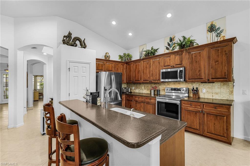 HUGE price reduction on this home. Bring me an offer today! Wake up this Season to your new 3 bedroom, 3 bath home with an Eastern Exposure overlooking a beautiful lakeview. Enjoy your cup of coffee watching the birds and alligators float by then take a dip in your pool or enjoy your heated spa. The home is bright and light with its neutral colored tile and white paint throughout. The kitchen has an island with eating level counter overlooking the great room and dining area. The split bedroom plan gives your guests lots of privacy with one bedroom being an ensuite in addition to the master suite. The dining room can be an office or another seating area which gives this home lots of flexibility. This home is located in the portion of Verandah originally developed by Bonita Bay with larger lots, heavy landscape, and longer driveways. The surrounding homes have been well kept and updated. Living in Verandah gives you a lifestyle with available golf memberships, tennis, pickle ball, boccie ball, 9 miles of trails, resort pool and fitness center. You will love it here!