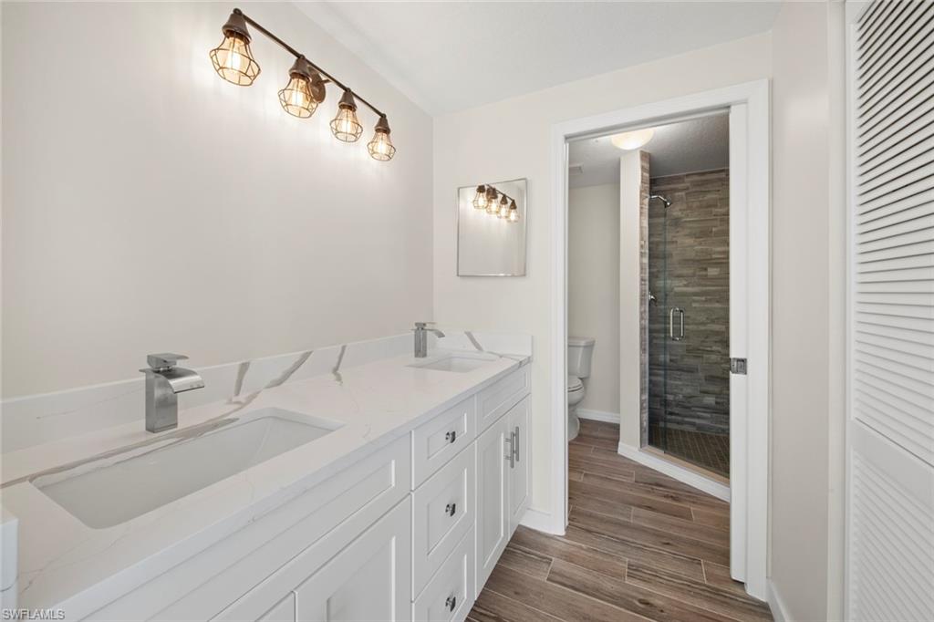 Positioned on the desirable south end of Fort Myers Beach, this fully renovated 2-bedroom, 2-bath end-unit condo is the perfect blend of modern luxury and investment opportunity. With housing in high demand as the island continues to rebuild, this unit offers exceptional flexibility for 2-week, monthly, or annual rentalsu2014making it an ideal income-producing property or personal beach retreat. Step inside to discover a bright, open layout with a split-bedroom design for optimal privacy. The brand-new kitchen showcases quartz countertops, soft-close cabinetry, and all-new stainless steel appliances. The primary suite impresses with dual sinks, an updated walk-in shower, and a spacious walk-in closet. Every inch of this residence has been upgradedu2014from new plumbing and electrical, moisture-resistant sound-barrier flooring, and modern fixtures and fans, to fresh baseboards, outlets, and switches throughout. Relax on your private lanai overlooking the pool, complete with new screens, railings, and fresh exterior paint. The building itself has been fully restored after Ian, with a new roof, brick pavers, working elevator, and all assessments paidu2014truly turnkey peace of mind. Nestled within Captainu2019s Bay, this prime south-end location offers easy access to Santini Plazau2019s Farmers Market, Lovers Key State Park, and Flipperu2019s on the Bay, with the Beach Trolley and Margaritaville Resort just minutes away. Enjoy the Gulf breezes from your spacious balcony accessible from both the living room and primary bedroom. This pet-friendly community allows 2-week rentals, offering unmatched income potential at an incredible moment to secure your slice of paradise on Fort Myers Beach.