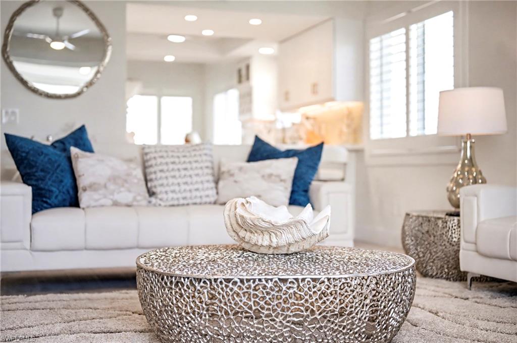 Corner Penthouse featuring 9 ft ceilings at Casa Marina shows like a model. This 2024 remodel opens the view from kitchen to living area and intersecting waterways. Timeless shaker cabinets and quartz counters with accents of brushed nickel hardware throughout the condo. Updated lighting and luxury vinyl tile in every room with modern baseboards to match the updated door frames. New two-panel doors and hardware stay consistent with the decor. Primary and guest bath total remodels include glass sliders in guest and full glass doors in primary bath. Two walk in closets. The laundry area is also enclosed with two panel doors on the spacious tiled lanai. Plantation shutters on the windows offer privacy or water views and Electric Hurricane Shutters enclose the lanai area. This condo is a great choice if your live here as a snowbird, retiree or still working and want a place to call home. You can also rent it out sometimes. Unit comes with upscale decorator furniture package and an under building parking spot. For boater's, dock # 55 is also for sale separate from the condo. The nearly new bay beach commons offer trails, shade under the covered tiki huts, tennis, pickleball, shuffleboard, golf putt and chipping greens, and members of Casa Marina association also have an onsite pool and access to the fishing pier at Waterside plus the updated beach access with shaded seating area under a tiki hut. Pet friendly for owners. 14 day minimum rentals allowed.