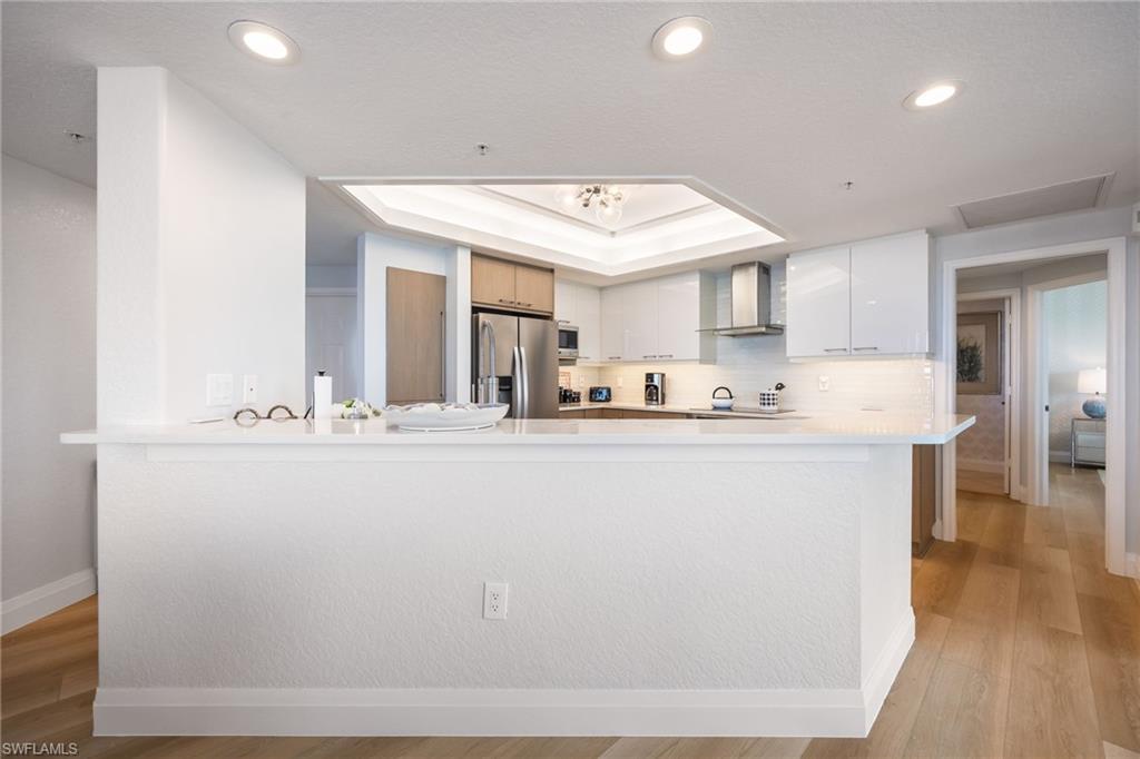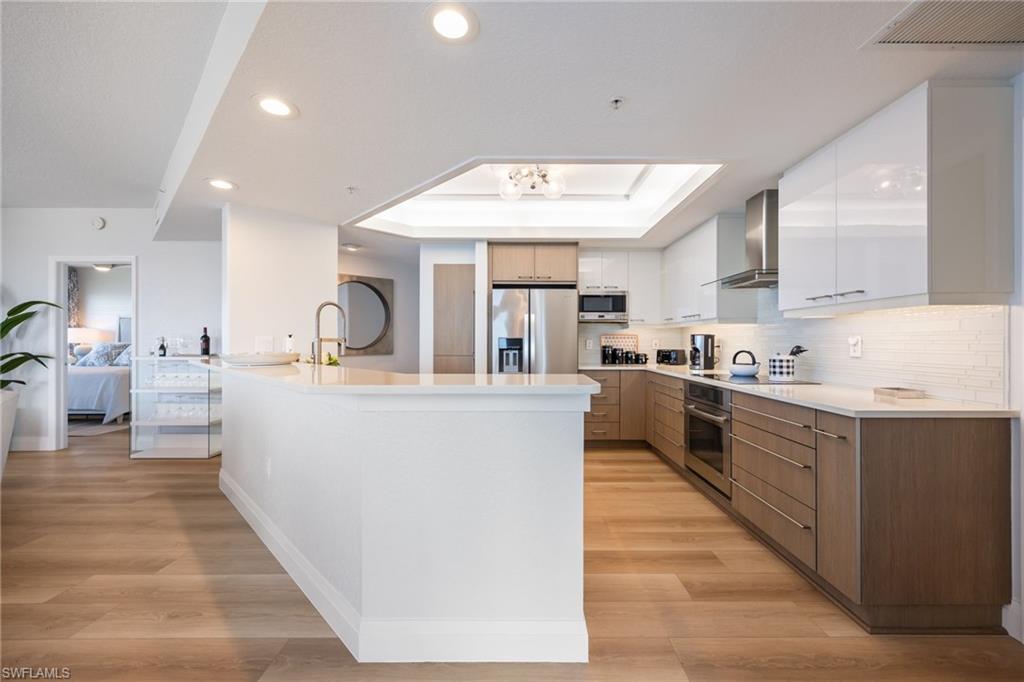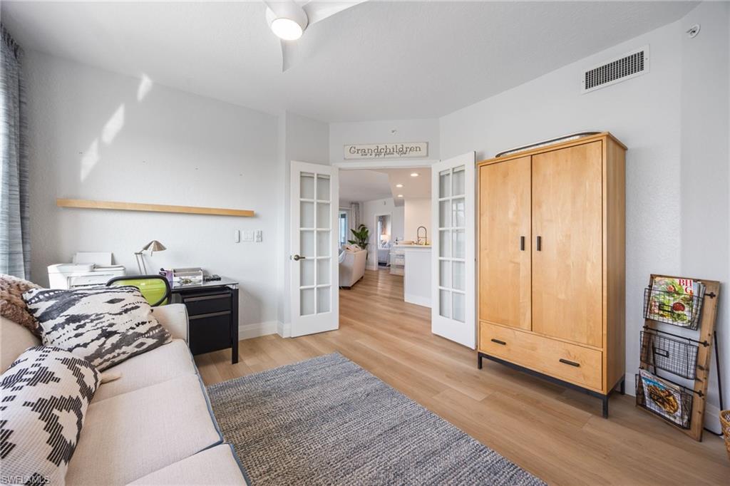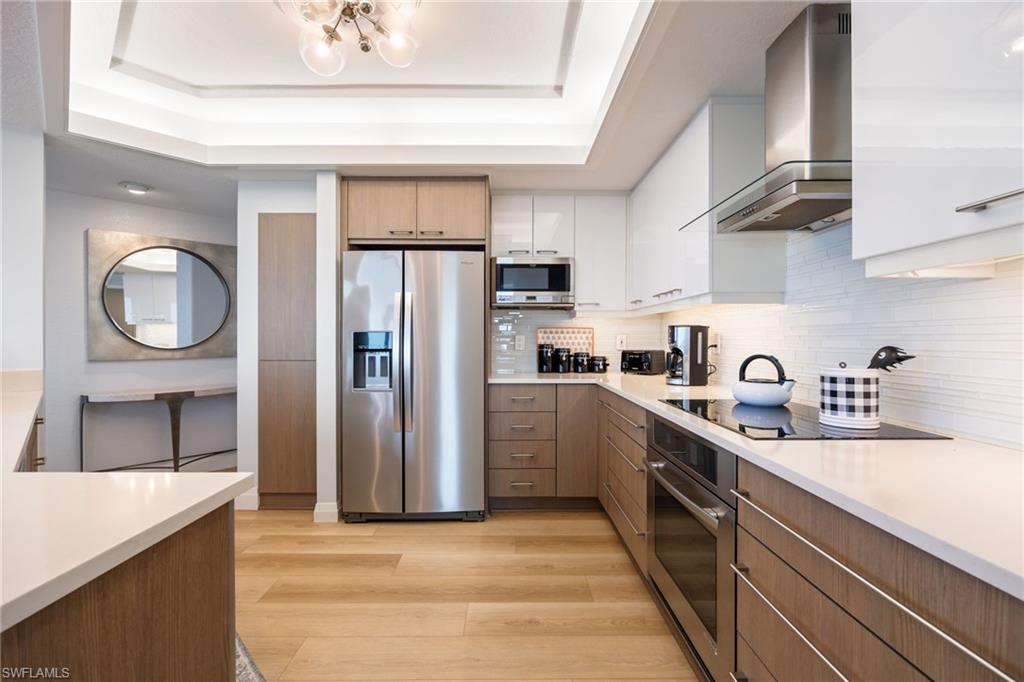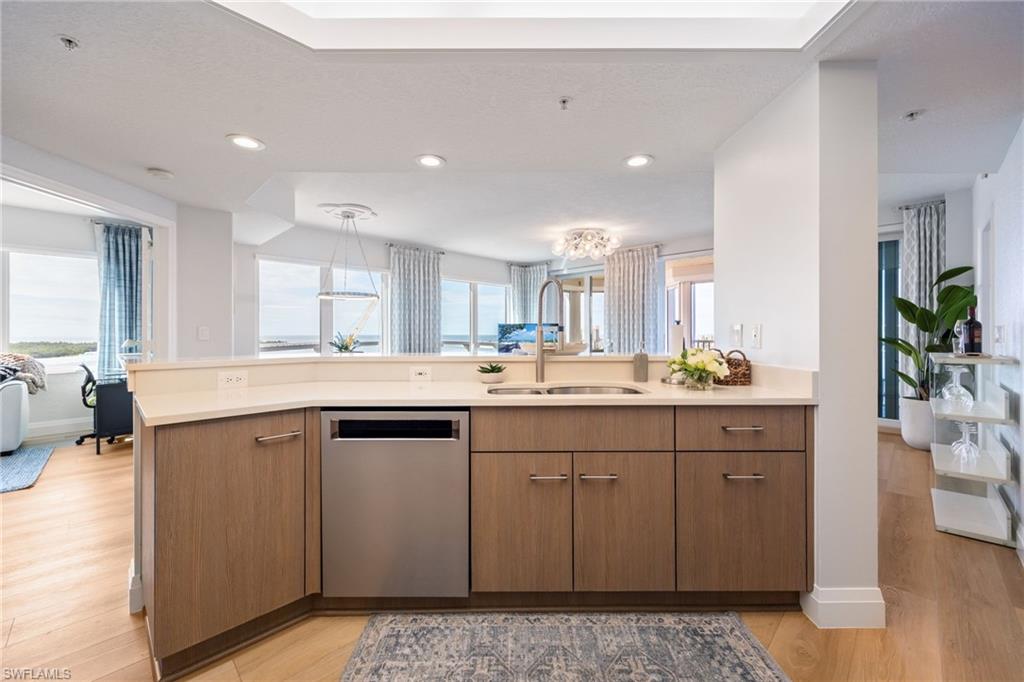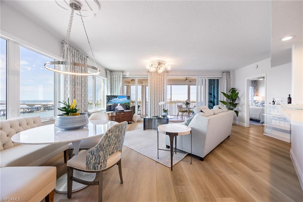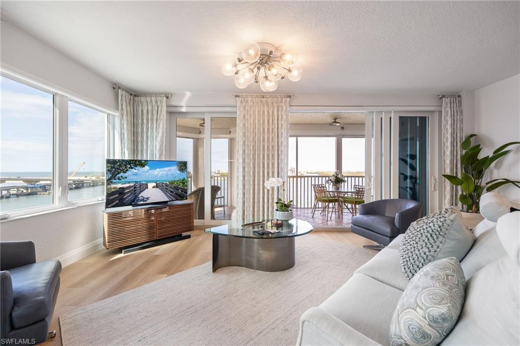 Stunning 8th-floor condo with panoramic views of the Intracoastal Waterway and Gulf beaches. This beautifully remodeled and professionally designed 2-bedroom, 2-bath residence with a den offers breathtaking sunsets from every room. The open layout showcases elegant finishes and coastal-inspired du00e9cor, creating a light, inviting space throughout. Relax on your private porch while watching dolphins and manatees in the water below. The community features a pool, hot tub, private beach, and tennis/pickleball court. A new clubhouse with a fitness center is under construction and scheduled for completion within the next three months. Boat docks are available for rent when offered. Covered assigned parking (1 stall) is included! The building has a new roof and all new impact glass windows and sliders.Walk across the street to Loveru2019s Key State Park and enjoy miles of beaches and nature trails. The location is exceptionalu2014offering quick access to Bonita Springs, Flipper's restaurant (next door), Docu2019s Beach House, or head north to enjoy everything Fort Myers Beach has to offer.