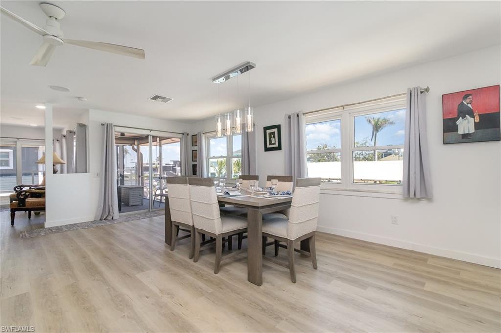 Located on a canal in Fort Myers Beach, this elevated two-bedroom, two-bath residence offers approximately 1,651 square feet of thoughtfully arranged living space and is partially furnished for convenience. The interior layout features a welcoming entry that separates the private bedroom areas from the main living spaces. The kitchen includes white cabinetry, stainless steel appliances, a gas cooktop with pot filler, ventilation hood, and built-in oven and microwave, complemented by a center island, breakfast bar, and light-toned flooring. Open living and dining areas provide a comfortable setting with recessed lighting, ceiling fans, and a built-in audio system, along with a wet bar featuring a refrigerator, dual beverage coolers, and display shelving. The primary bedroom includes a walk-through closet and ensuite bath, while the guest bedroom is situated near a full second bathroom with a walk-in shower and updated vanity. Additional features include a laundry area with cabinetry and stacked washer and dryer. Outdoor living includes a screened lanai with canal views, a lower-level screened patio surrounding a fiberglass pool, and a composite dock with a covered boat lift and floating platforms for personal watercraft. The ground level offers covered parking for multiple vehicles and a large enclosed storage area, providing a well-rounded canal-front property with direct water access.