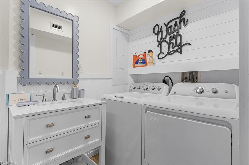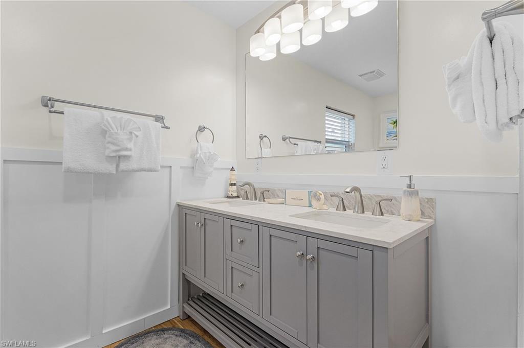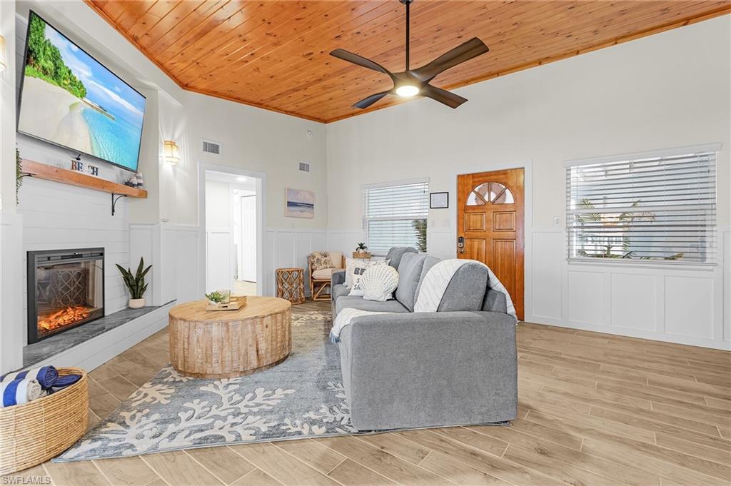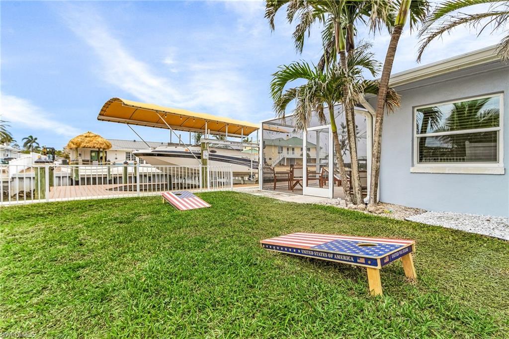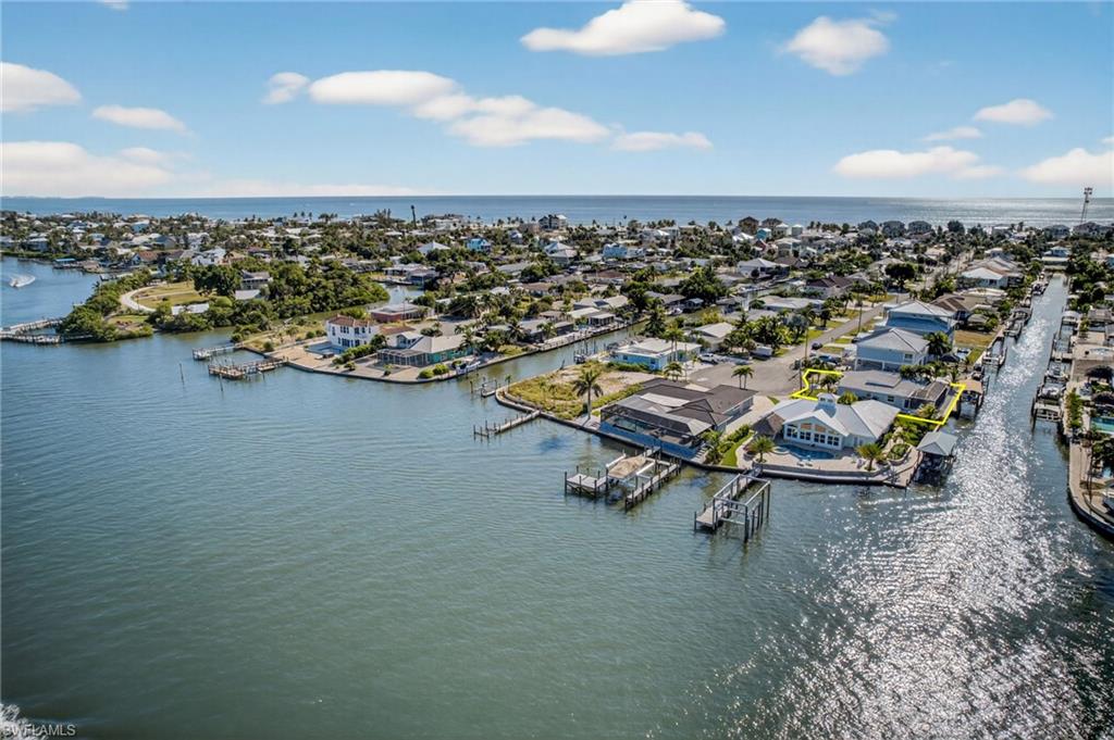 Welcome to your ideal waterfront paradise! This stunning beach house boasts breathtaking views of the canal and bay, perfectly positioned on an expansive 80 FT wide lot. Tucked away in a peaceful cul-de-sac, this remarkable property seamlessly combines serenity with coastal charm. Recent enhancements include a NEWER SEAWALL, a sparkling NEWER POOL, and a NEWER BOAT DOCK/LIFT, all completed in 2020, providing everything you need for a life of leisure on the water. The property's prime location offers partial bayfront vistas and convenient access to the canals, making it a dream come true for boating lovers. - Recent exterior upgrades include: HVAC system, pool heater, pool pump, screen enclosure, irrigation system, and fresh landscaping. - Interior improvements feature: Impact windows and sliding doors, modern cabinets, stylish countertops, upgraded appliances, elegant tile showers, contemporary vanities, and beautiful tile flooring. - Cozy fireplace for those cooler evenings. - Fully furnished with all brand new furnishings! - Great potential for investment or rental income. - Spacious layout, making it one of the larger 2-bedroom, 2-bath options available. - Versatile bonus room that can be utilized as a den or office. Picture yourself enjoying spectacular sunsets over Fort Myers Beach, taking peaceful strolls along the shore, and embarking on leisurely boat rides right from your own backyard. This isn't just a property; it's a lifestyle beckoning you to embrace it. Seize the opportunity to create your personal oasis in this beautiful coastal environment!