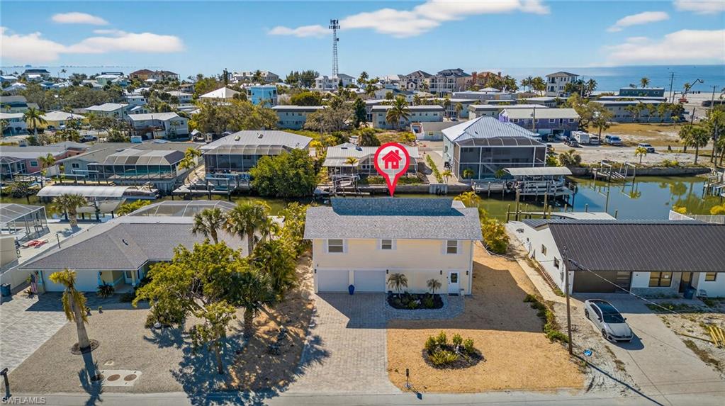 Welcome to paradise! This 2 story canal home with boat dock & 13,000 lb. lift combines convenience and the Florida lifestyle! Just a 5 minute walk to Gulf & deeded beach access. Your canal delivers direct gulf access right in your backyard! Short walk or bike to Time Square, eliminates traffic, convenient to bars and restaurants but far enough away to avoid crowds. Dock your boat and 2 jet skis right at home at your private boat dock that has water and electric for easy maintenance. . Custom kitchen with quartz countertops in a coastal kitchen blends natural elegance with durability with a 12' long island that can accommodate up to 6 bar stools. 2 bedrooms up with 2 custom bathrooms with duel vanities. Lower level has media area, full bathroom, 3rd bedroom, bar and tons of additional space. Wall of windows overlooking the canal and views of the gulf of America. Large 2 car garage provides plenty of space for cars and storage. A very large backyard that provides the perfect setting for a large pool. Whether you are seeking a vacation retreat, lucrative rental investment, or year-round sanctuary, this home delivers the best of Fort Myers Beach living!