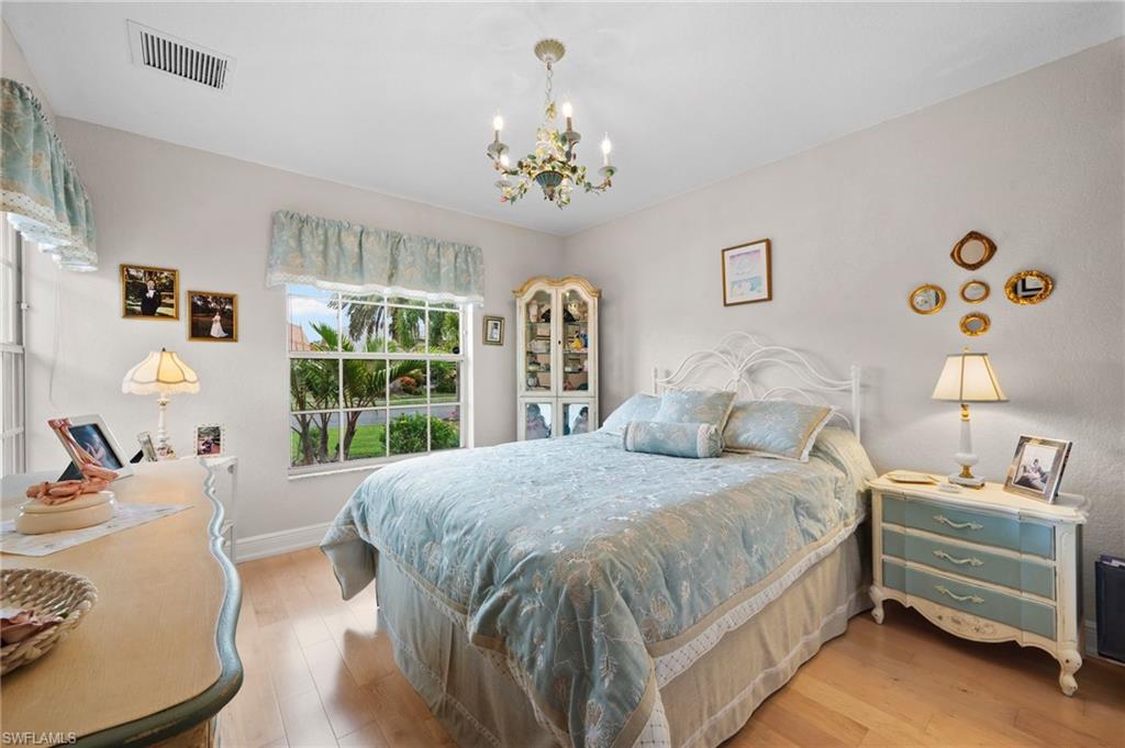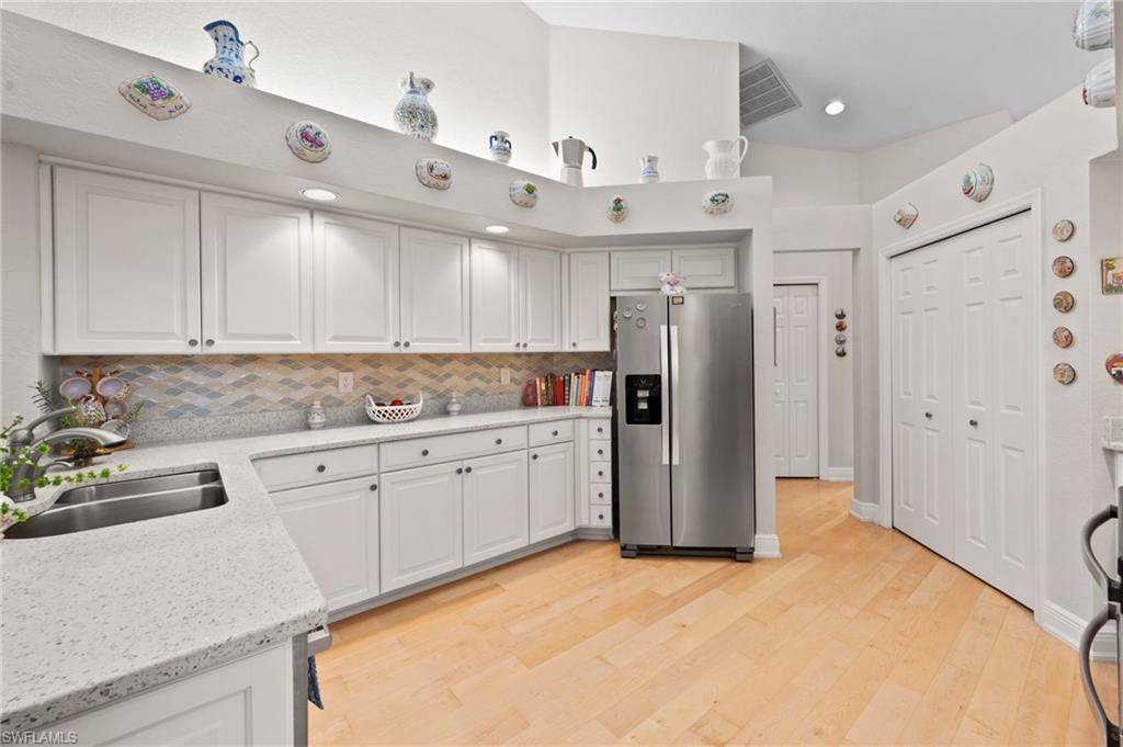 Immaculately maintained and updated 3B/2Ba home in popular Cross Creek Estates! Stunning upgraded kitchen with soft close White Cabinetry, gorgeous Terrazzo countertops, custom backsplash, newer appliances including a double oven, new hot wtr htr (2025). Featuring beautiful wide plank, wood flooring thru out, New Tile Roof (2015), full hurricane protection w/new electric hurricane screens, electric panels and a hurricane rated garage door. High efficiency Levelor, honeycomb shades thru out, custom built ins, wood burning fireplace - great for holiday ambiance! Spacious split floor plan with soaring vaulted ceilings, private guest area with pocket door, 2 bedrooms or guest bedroom and den w/custom bookshelves, updated guest bath and a spacious primary bedroom with sliders to the expansive wrap around lanai, updated, luxurious bath w/updated white cabinetry, Terrazzo countertops, jetted soaking tub, separate shower and dual sinks. The spacious screened lanai wraps around the back of the home and offers great views of the lushly custom landscaped yard and features desirable southwest exposure. Perfectly located within walking distance to the clubhouse, this is the one to call home! Enjoy Friendly neighbors and a Super convenient gated community offering sidewalks, full clubhouse amenities: Jr. Olympic lap pool & spa, fitness center, tennis, pickleball, dog park, bocce, racquetball, playground, food truck & community events & pay for play golf with optional low fee membership ($1k/yr!) at Cross Creek CC ! Super Low HOA fees (just $2,240/yr!), OUT of the flood zone, no CDD or city taxes & close to Gulfcoast Hospital and medical complex, Whole Foods, shopping, dining, SWFL Int'l airport and a short drive to area beaches!
