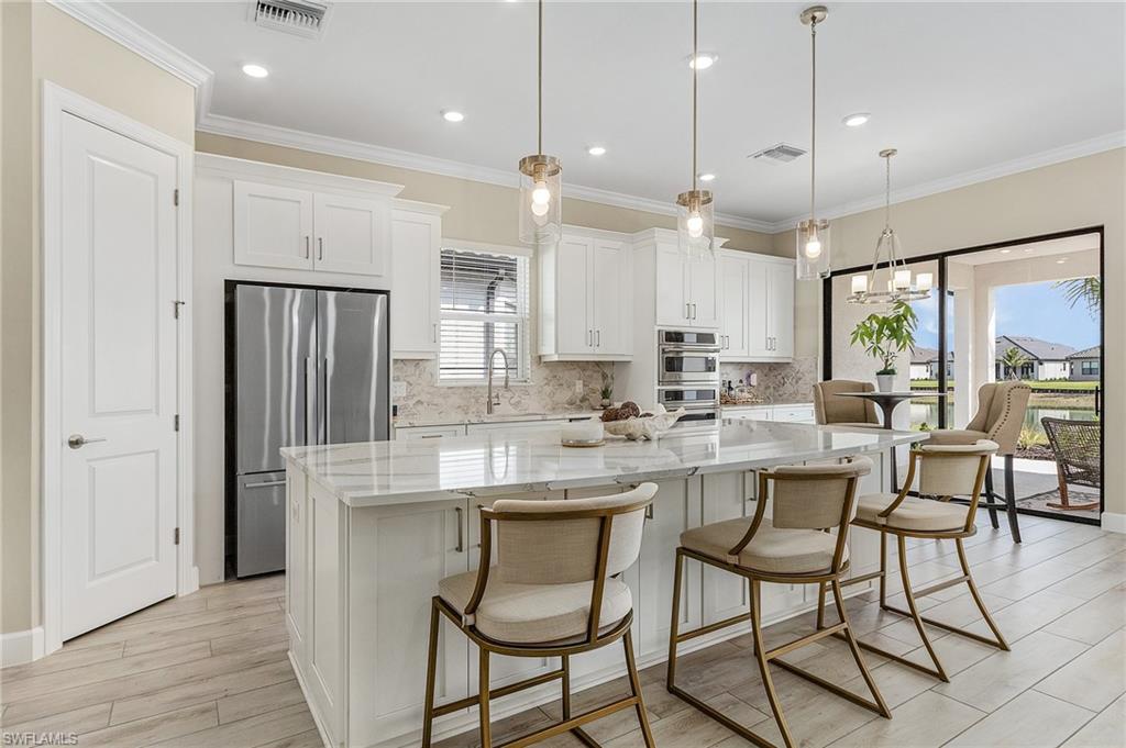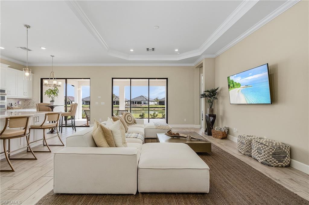 ** Lowest Priced Lazio Model in Esplanade** Welcome to your new beautiful 3-bedroom, 2-bathroom home located in the sought-after Esplanade Lake Club community. No expense was spared in this bright, open concept, gourmet kitchen featuring a large Quartz island, pantry, natural gas stove, extended bar & casual dining area. The master suite features dual vanities, a glass shower, walk-in closet and bay windows overlooking the lake. Guests and family will appreciate the two spacious en-suite bedrooms with an option to convert the den into a 4th bedroom or study. Esplanade Lake Club offers world class amenities such as a resort-style pool, lakefront beach, fitness center, Bahama Bar & Grille , tennis, pickleball, bocce courts, dog parks, boating, kayak launch and walking trails. Close to Gulf Coast Town Center (target, Costco), RSW & I-75.